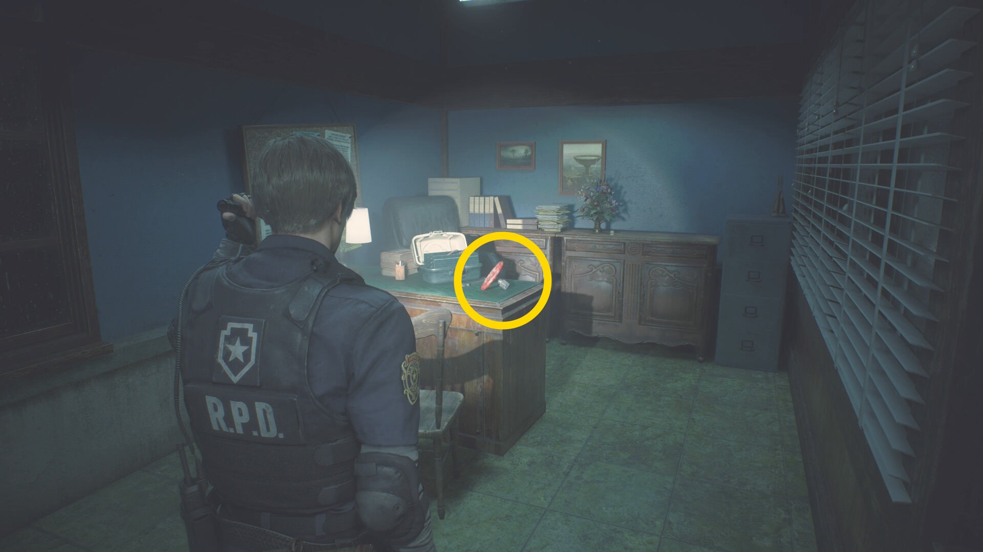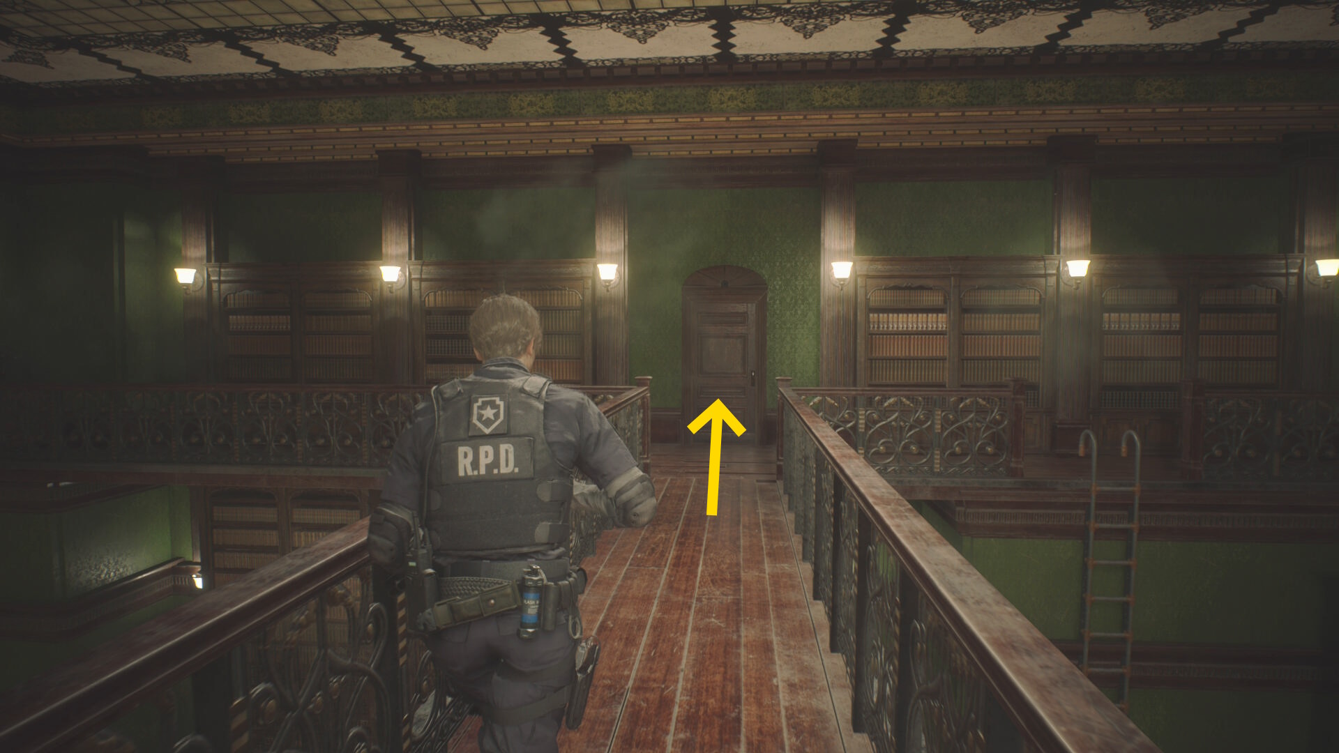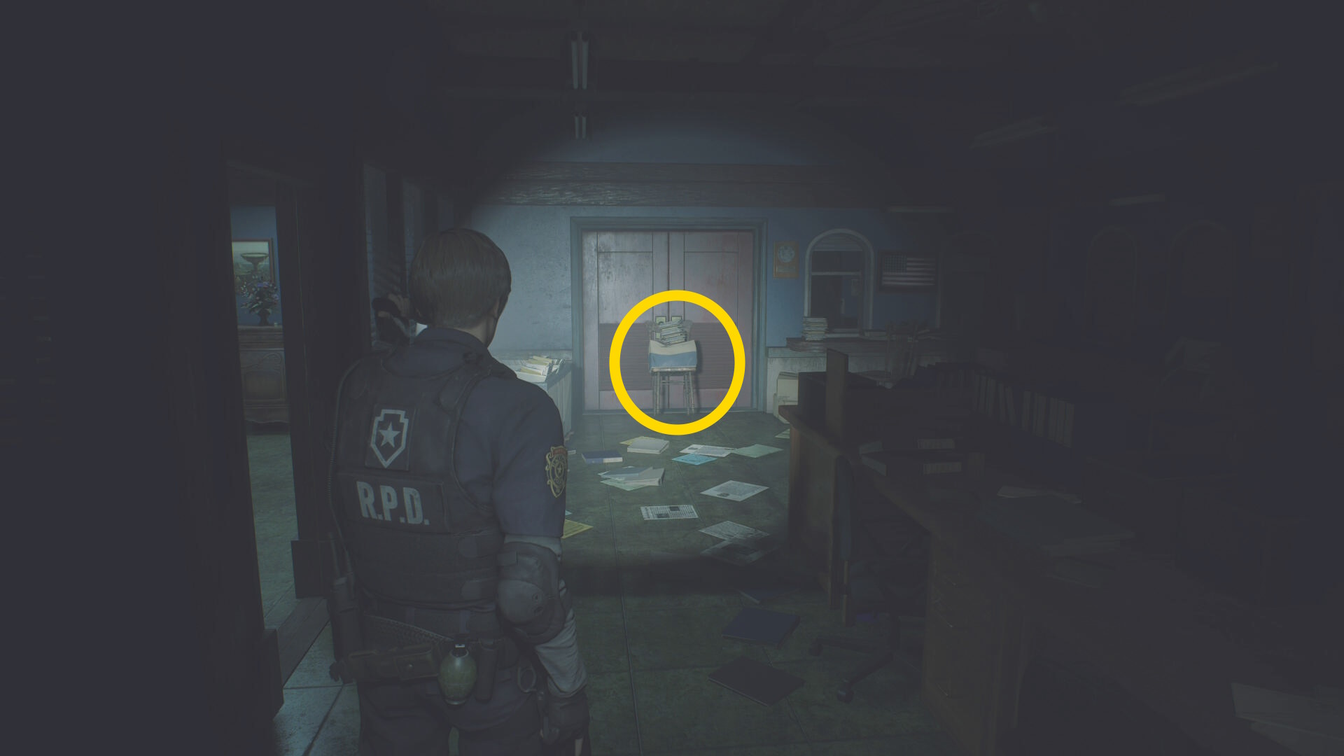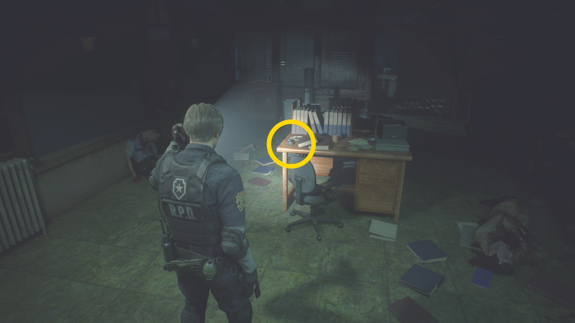 - 資料室のドア(ハートの鍵で解錠:レオンでは開けられない)の右脇にある 木材 を回収