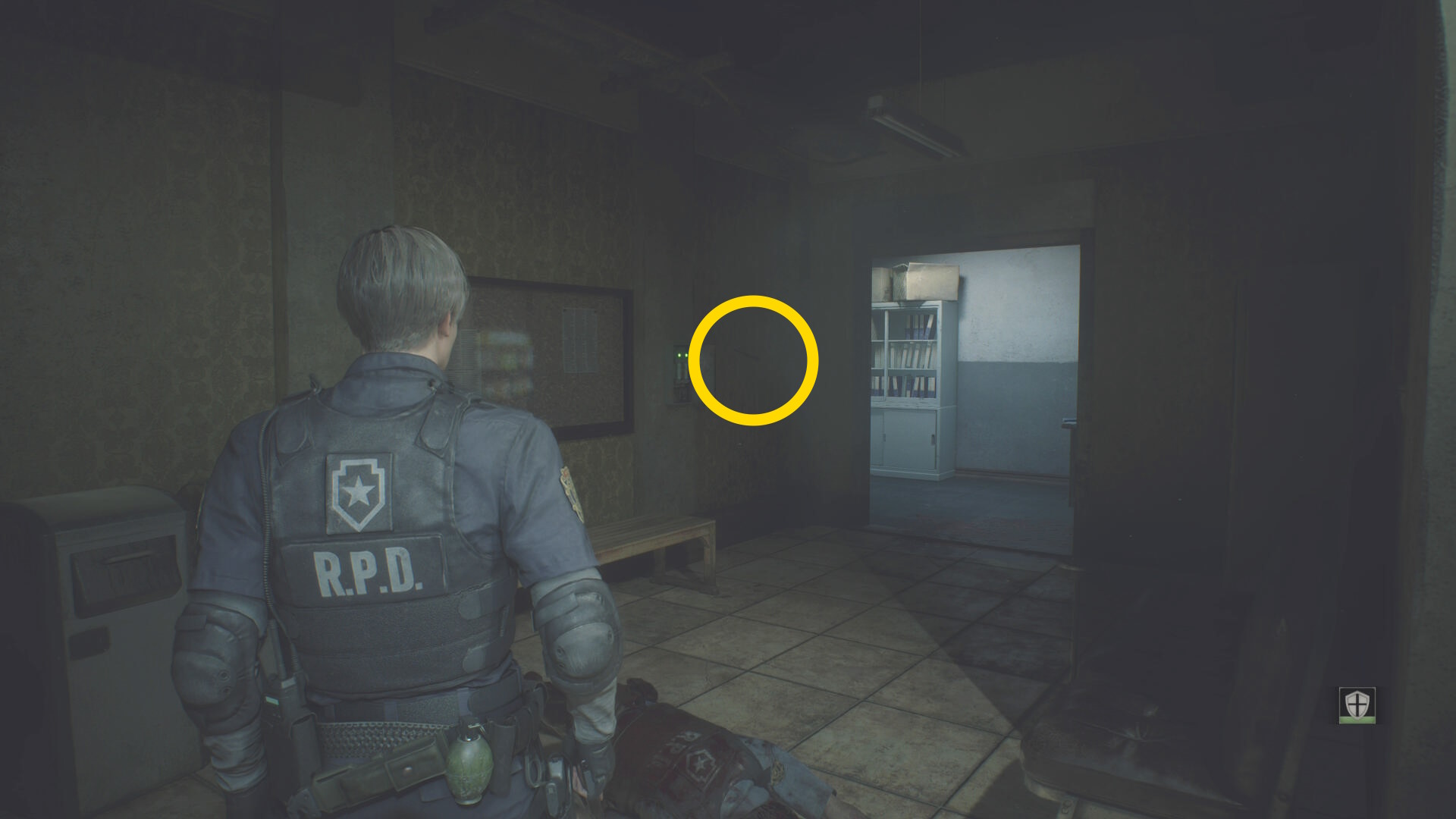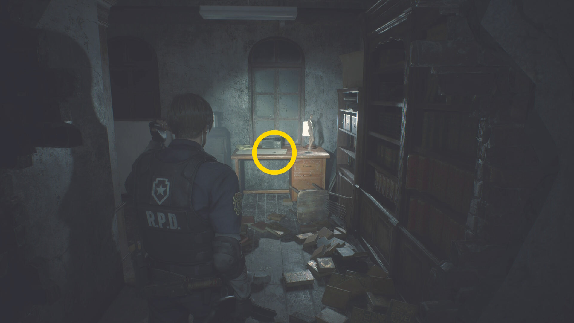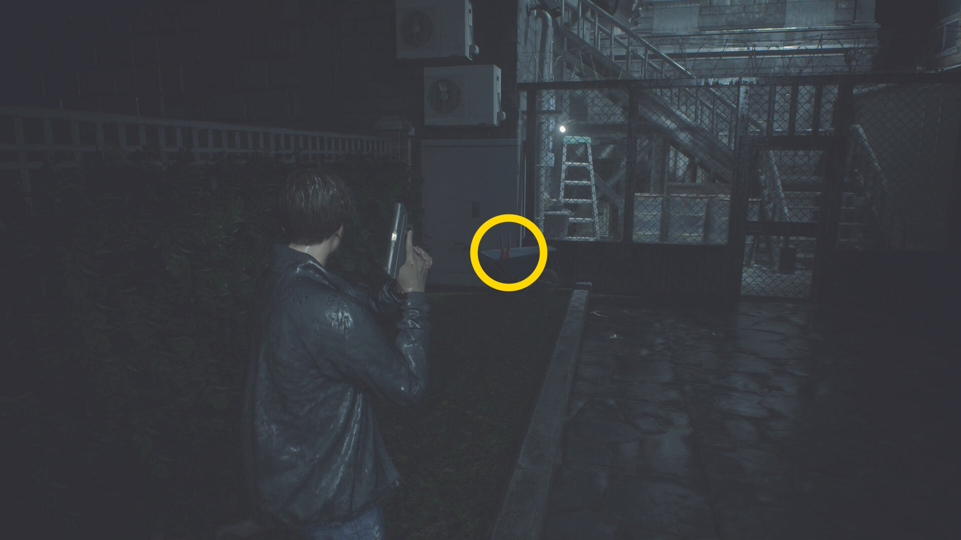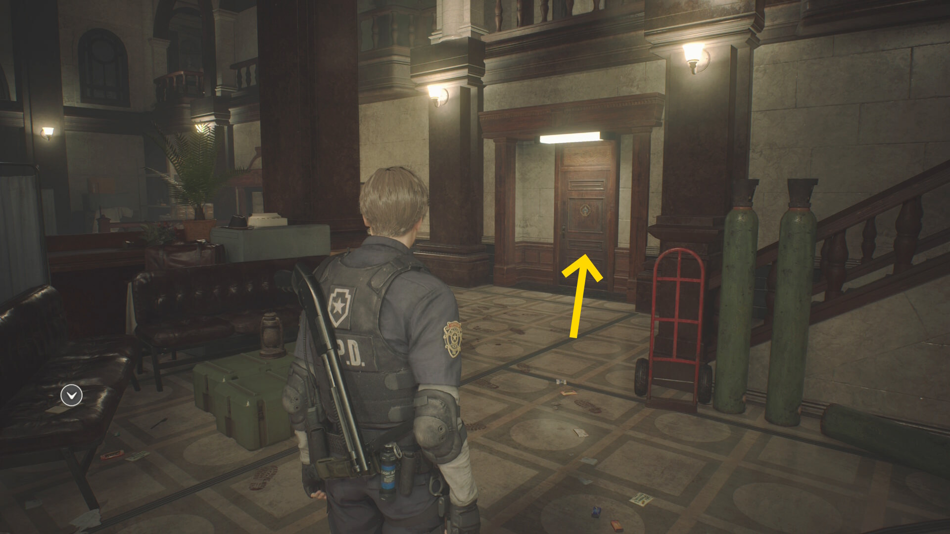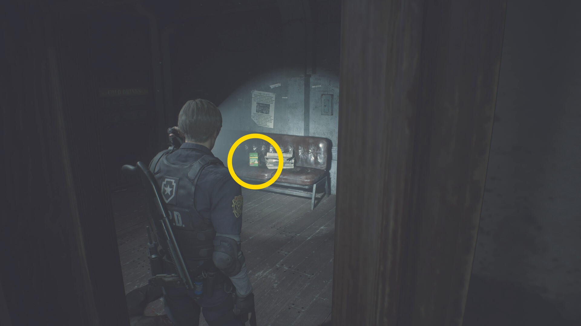 - 資料室のドア(ハートの鍵で解錠:レオンでは開けられない)の右脇にある 木材 を回収