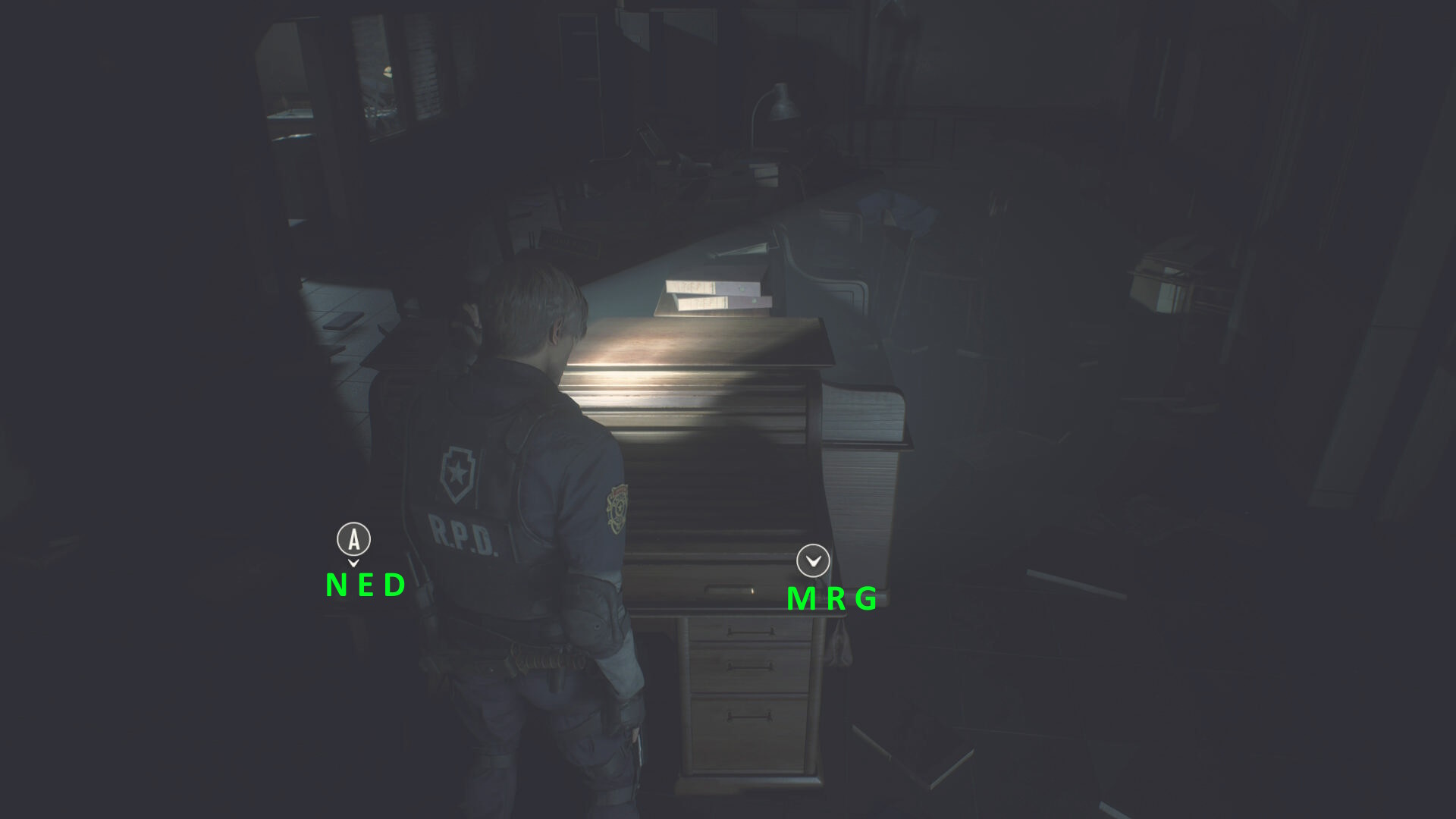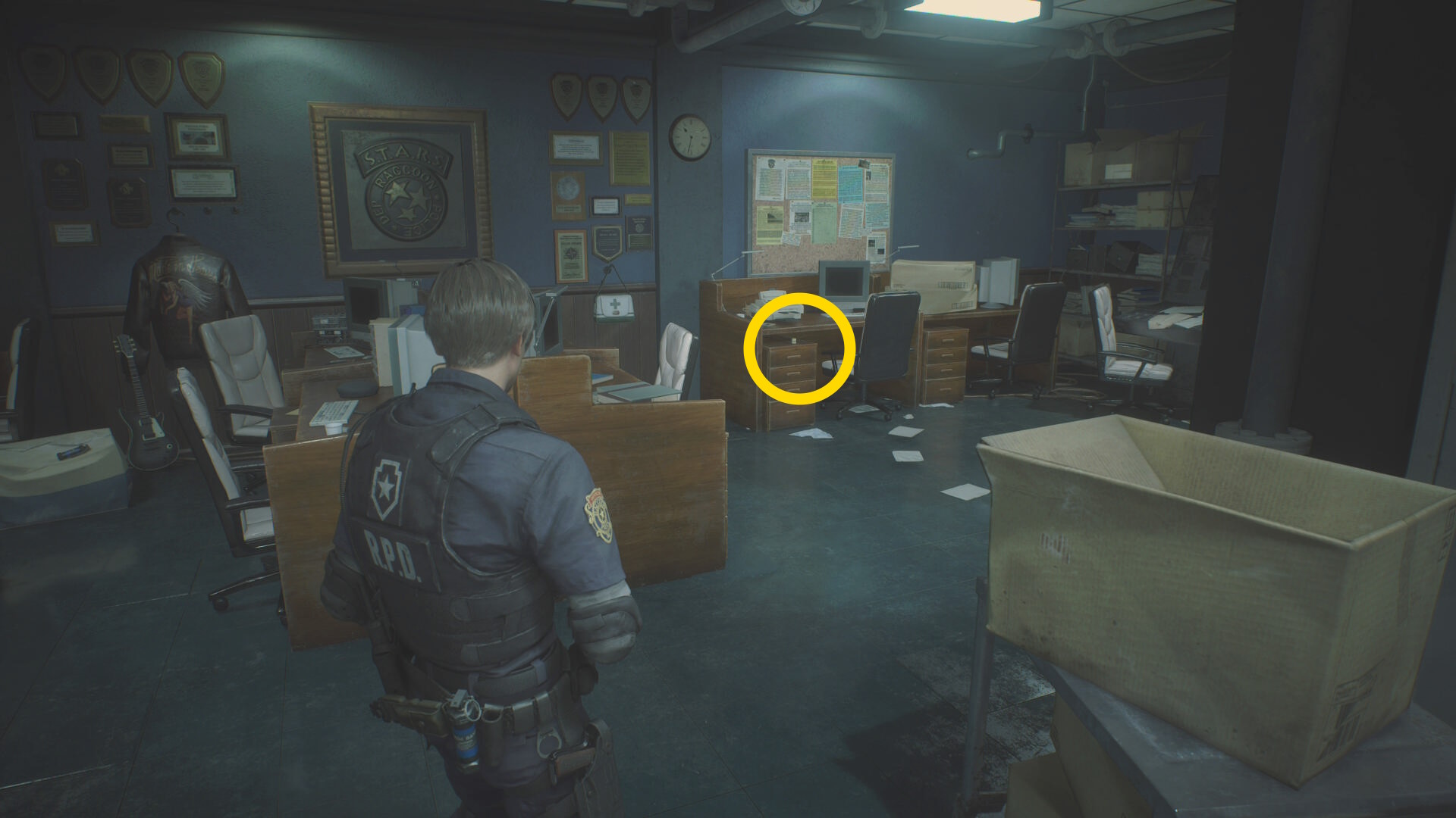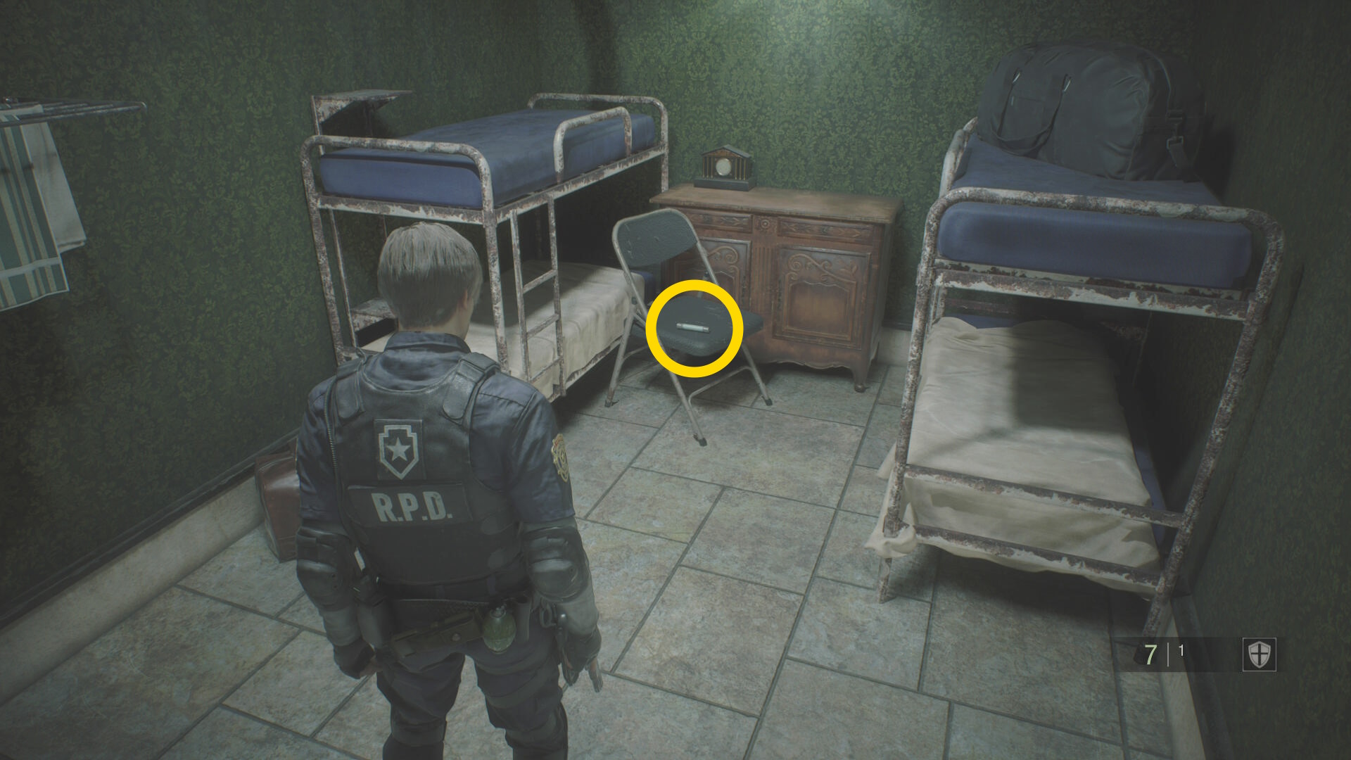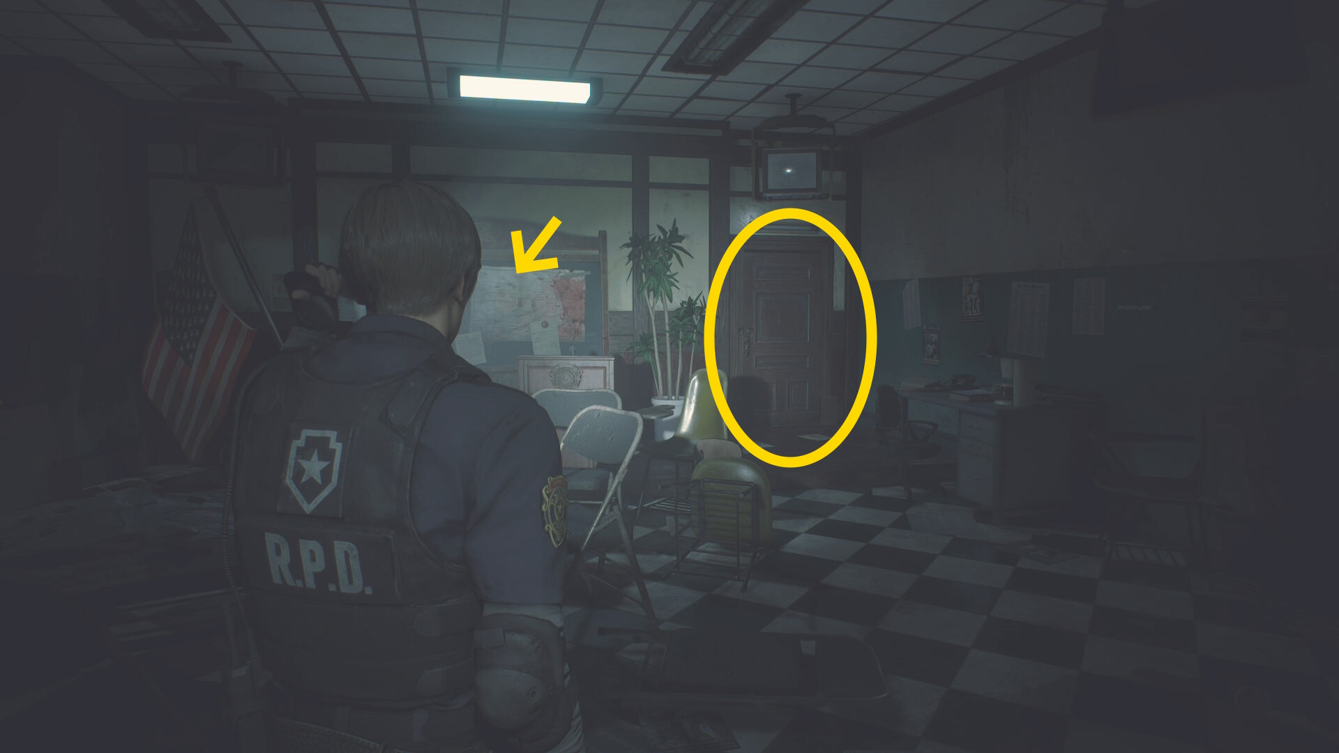 - 資料室のドア(ハートの鍵で解錠:レオンでは開けられない)の右脇にある 木材 を回収