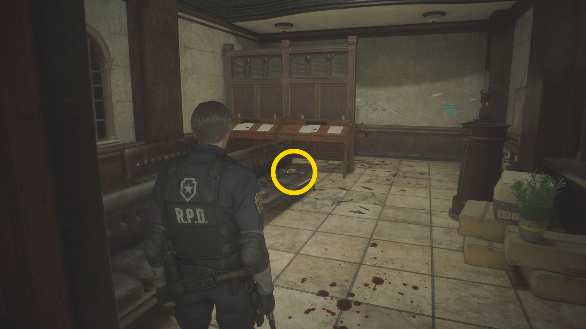 - そのまま「受付」に入り、長椅子の 大型拳銃の弾 を回収
