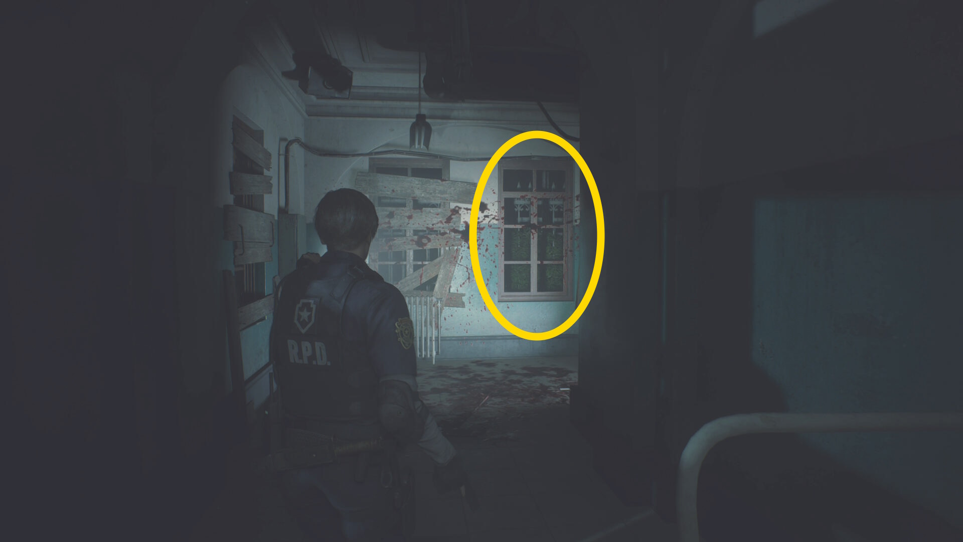 - リッカーをキルした廊下に戻り(走って大丈夫)、L 字の角近くの窓を木材で塞ぐ
