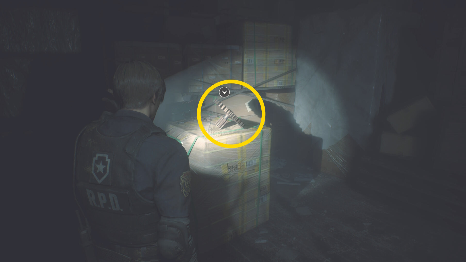 - 階段を登ったら、右に U ターンするように進み、スチールラックから ショットガンの弾 を回収