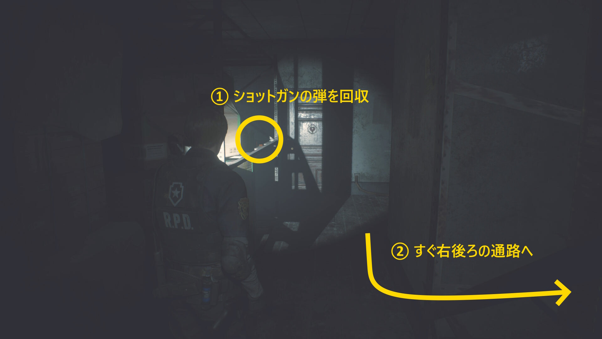 - 中に入って左に進んで、スチールラックの ショットガンの弾 を回収