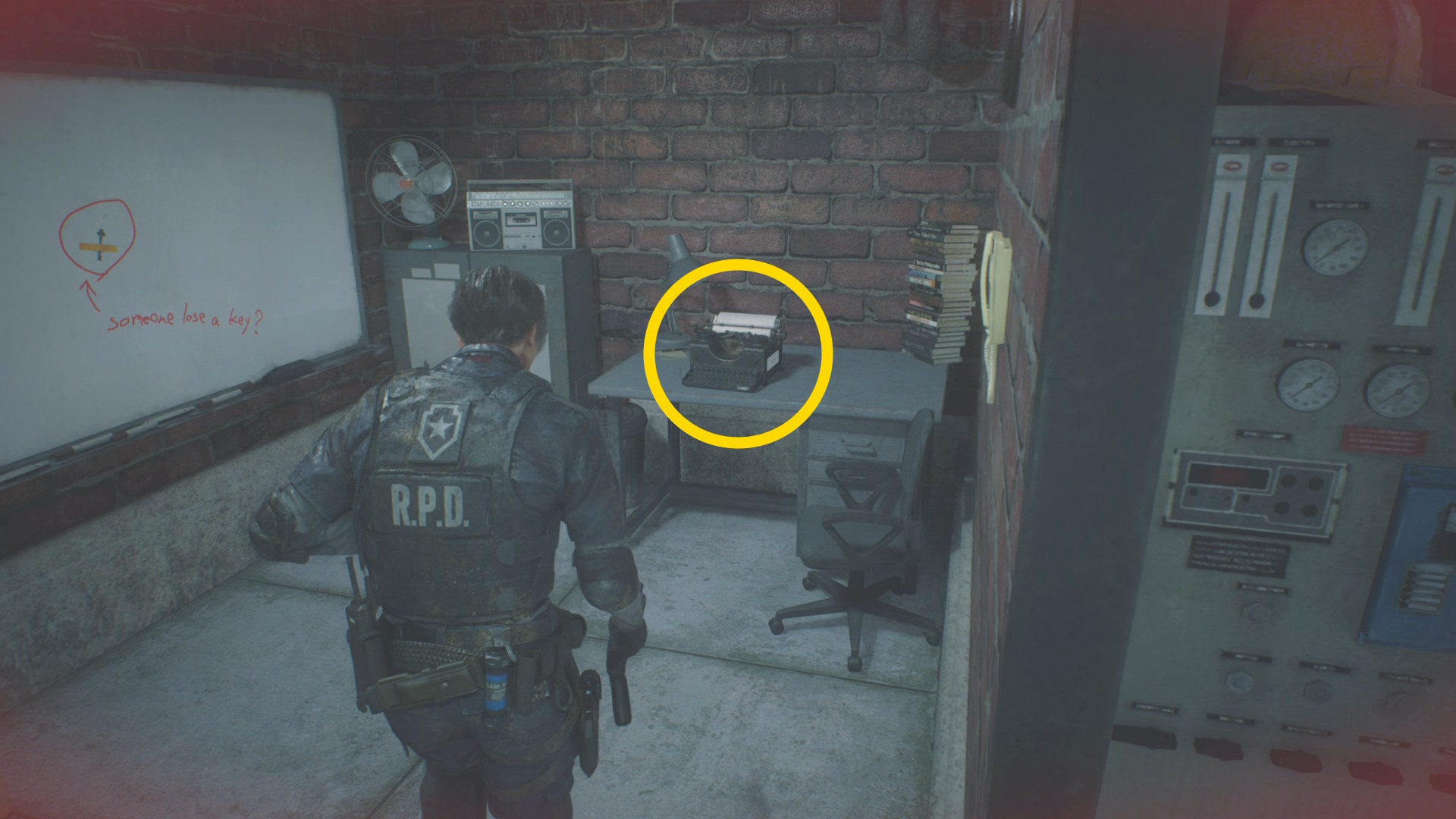 - ドアを開け、右のタイプライターで 1回目のセーブ