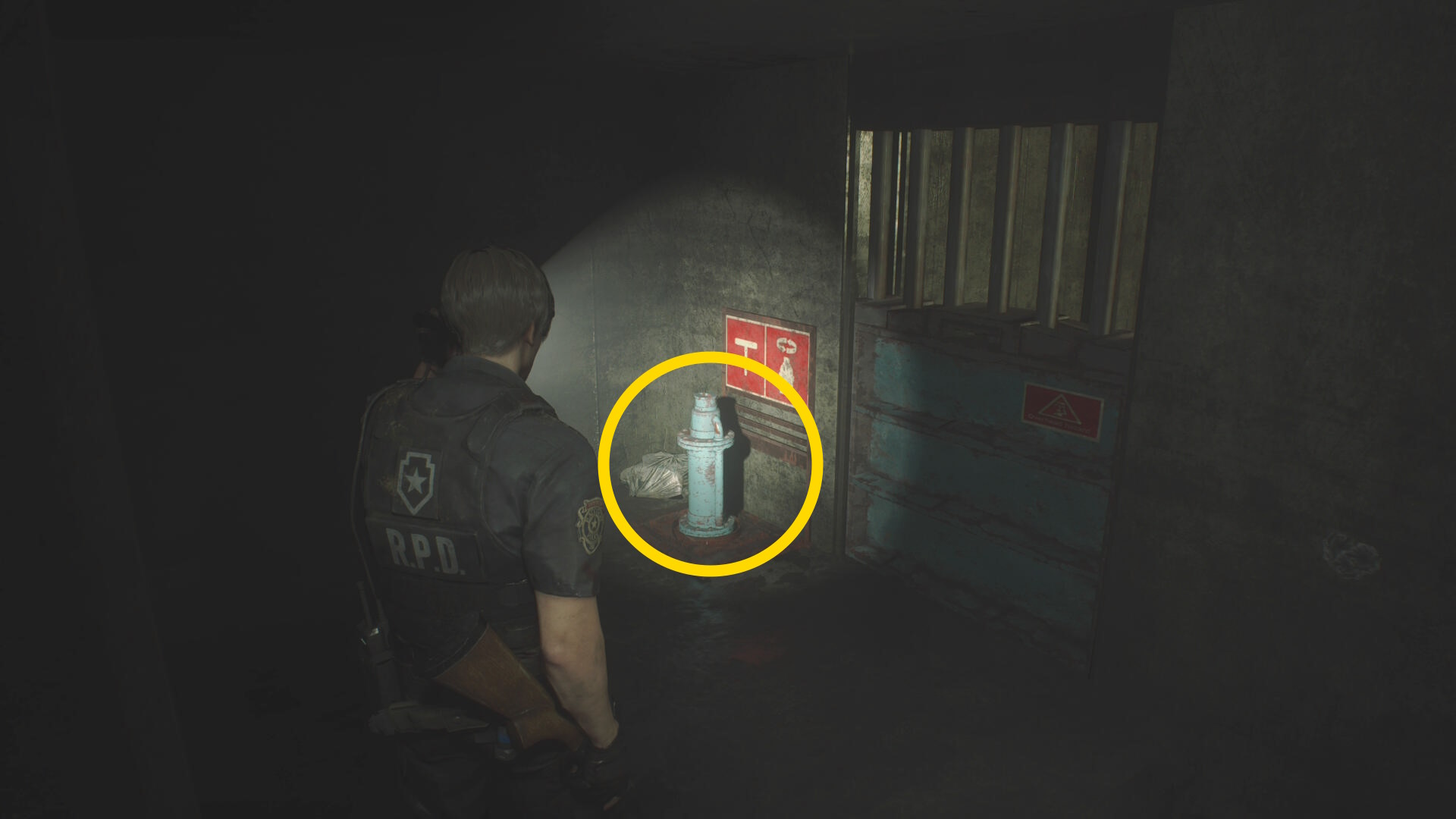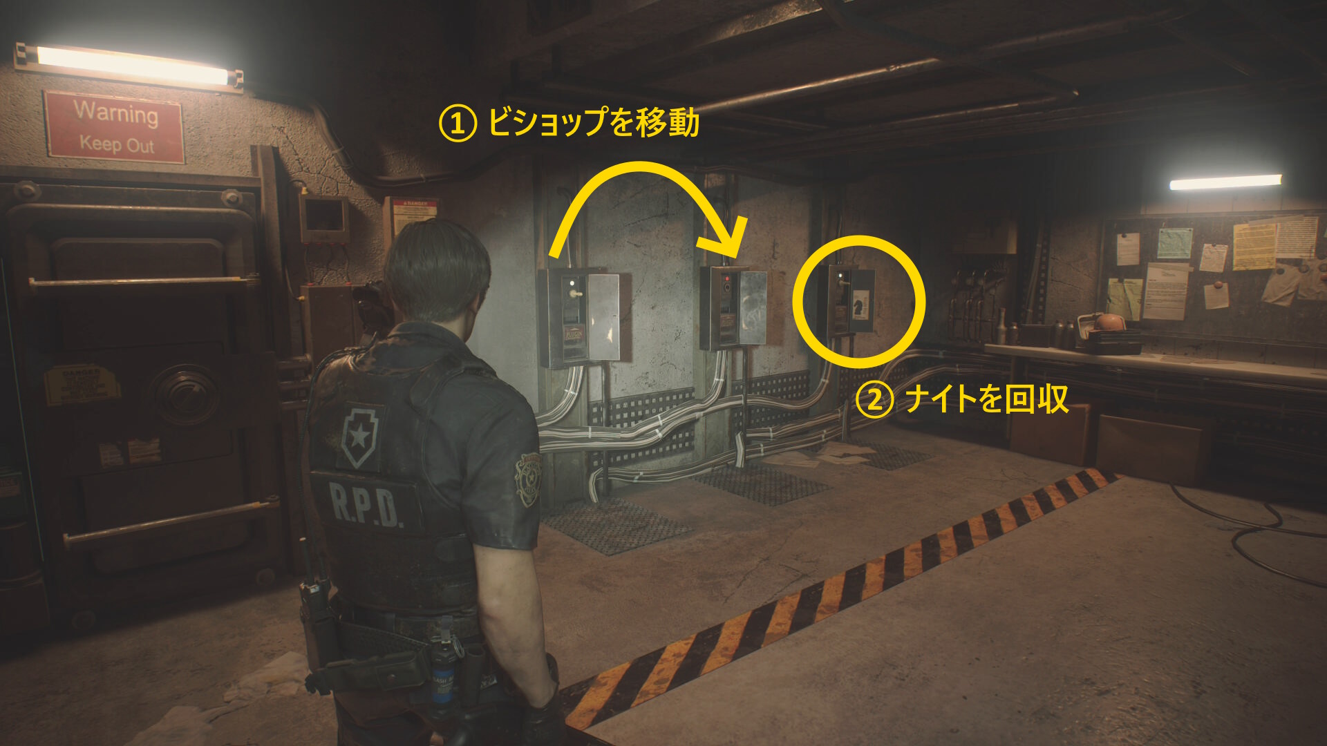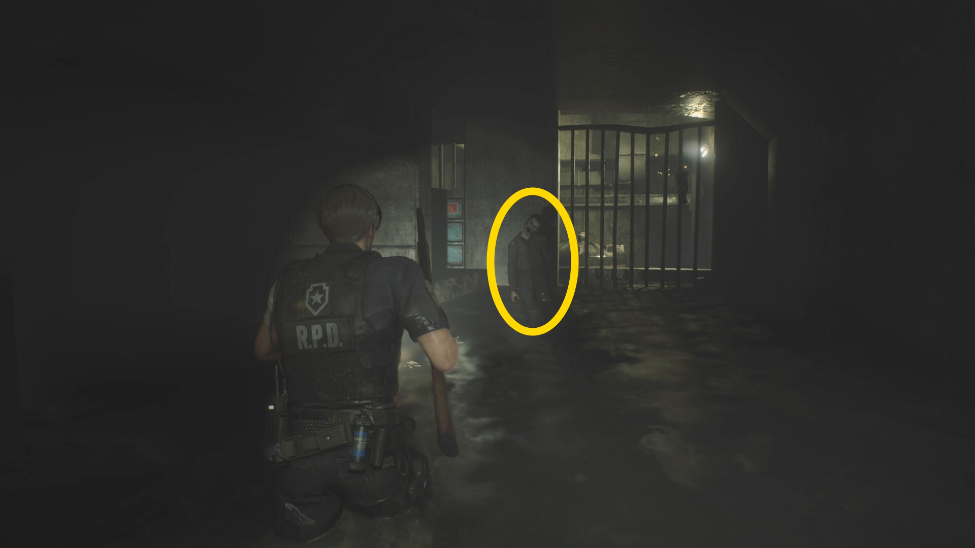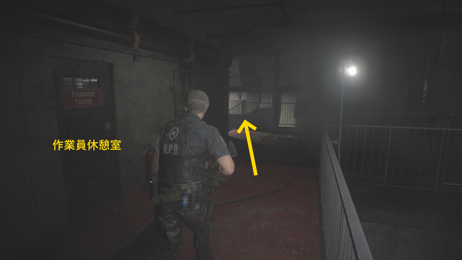 - 房を出て右に進み、赤いランプが灯るレバーを下げ、タイラントを回避して進みながら最後は閃光手榴弾を投げて留置場から出る