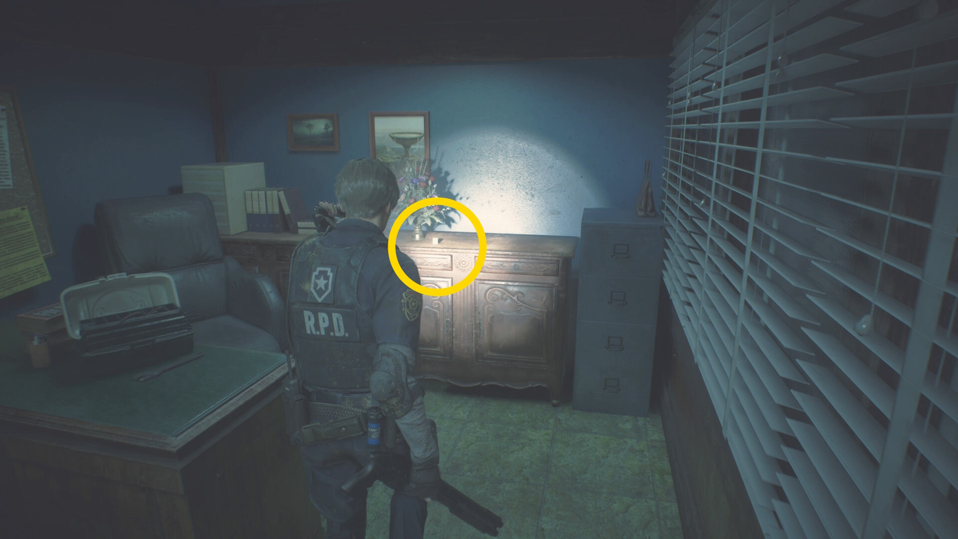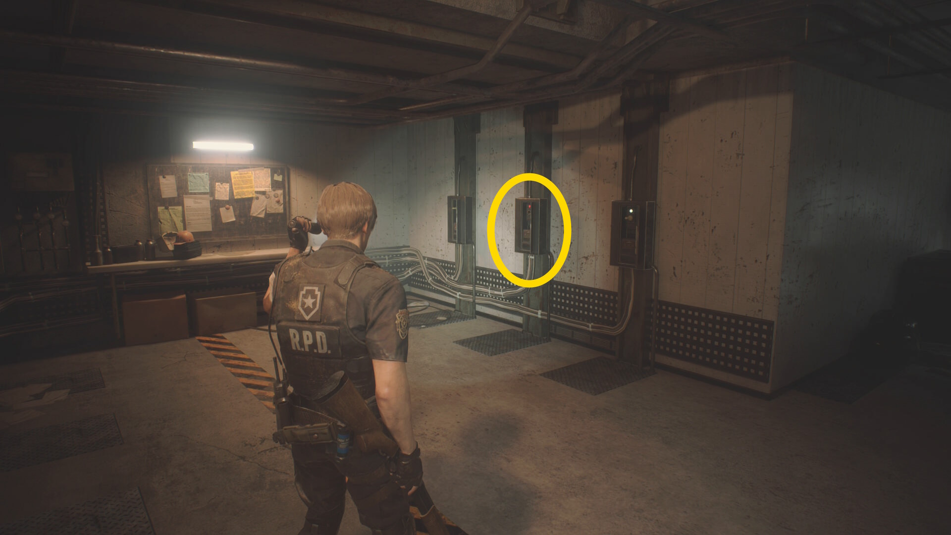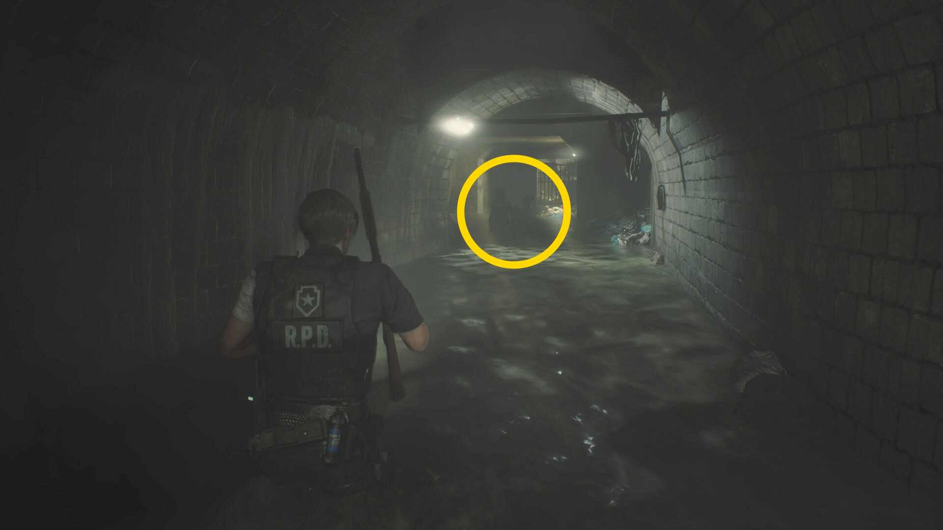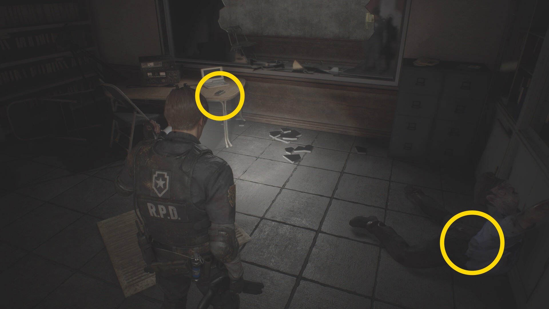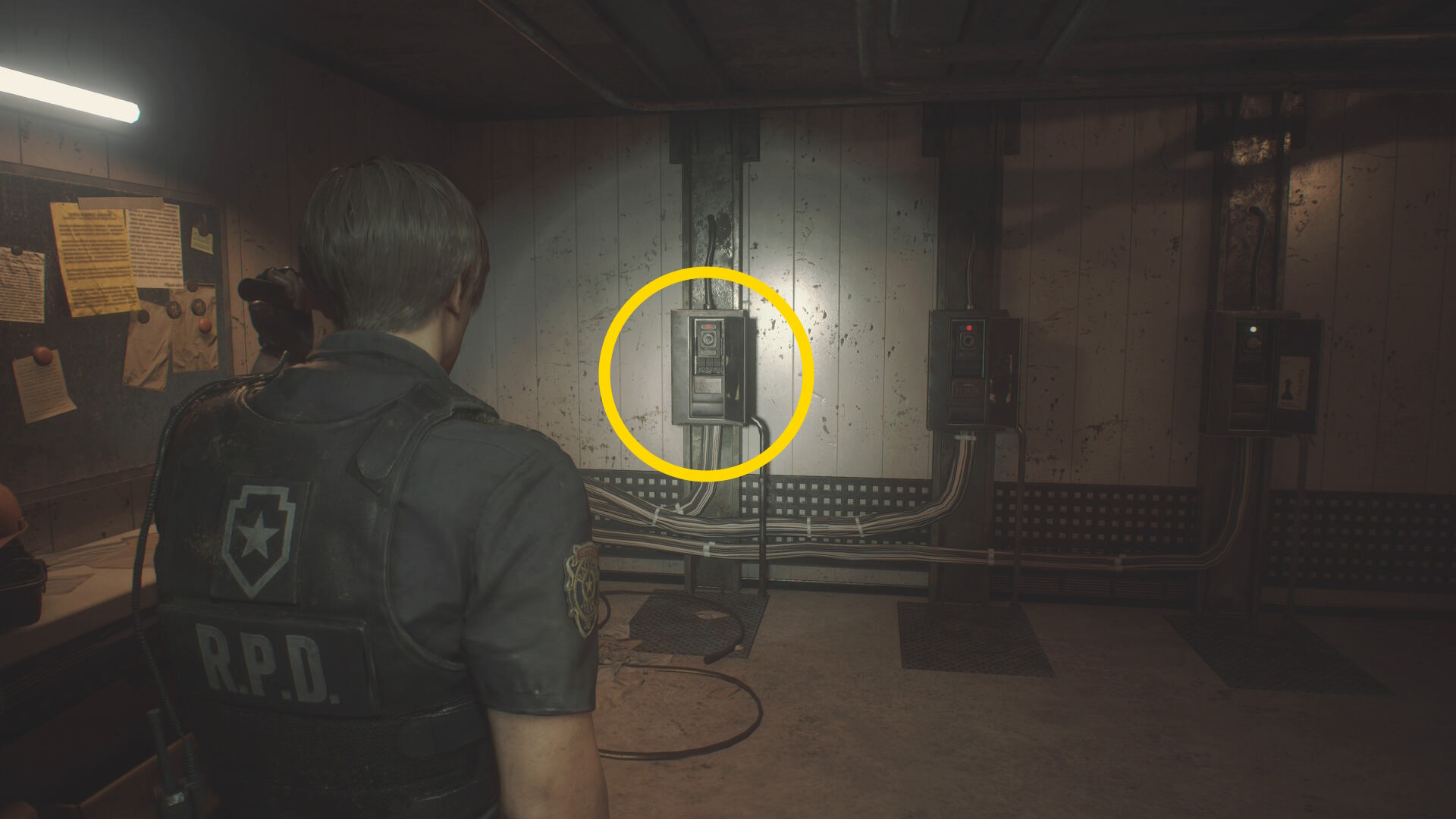- 房を出て右に進み、赤いランプが灯るレバーを下げ、タイラントを回避して進みながら最後は閃光手榴弾を投げて留置場から出る