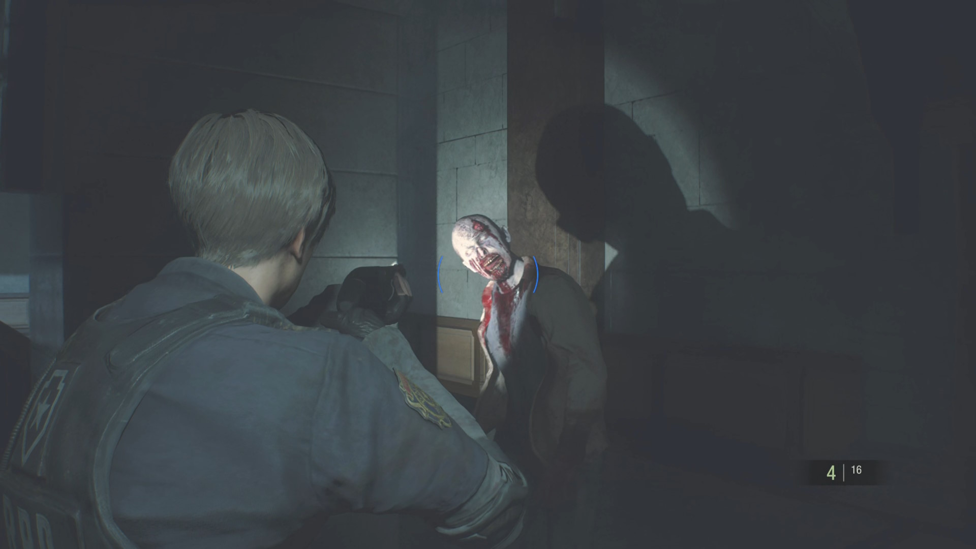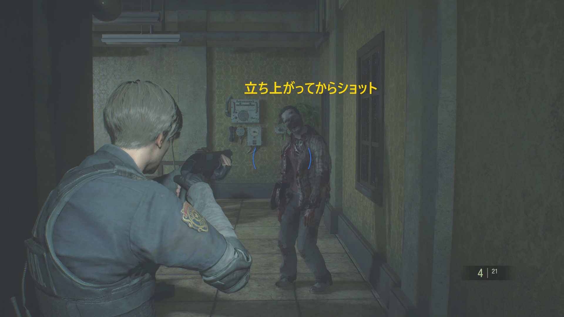 - 階段を下りた左にもゾンビがいるのでショットガンを構えたまま下りてヘッドショットキルを狙いたい