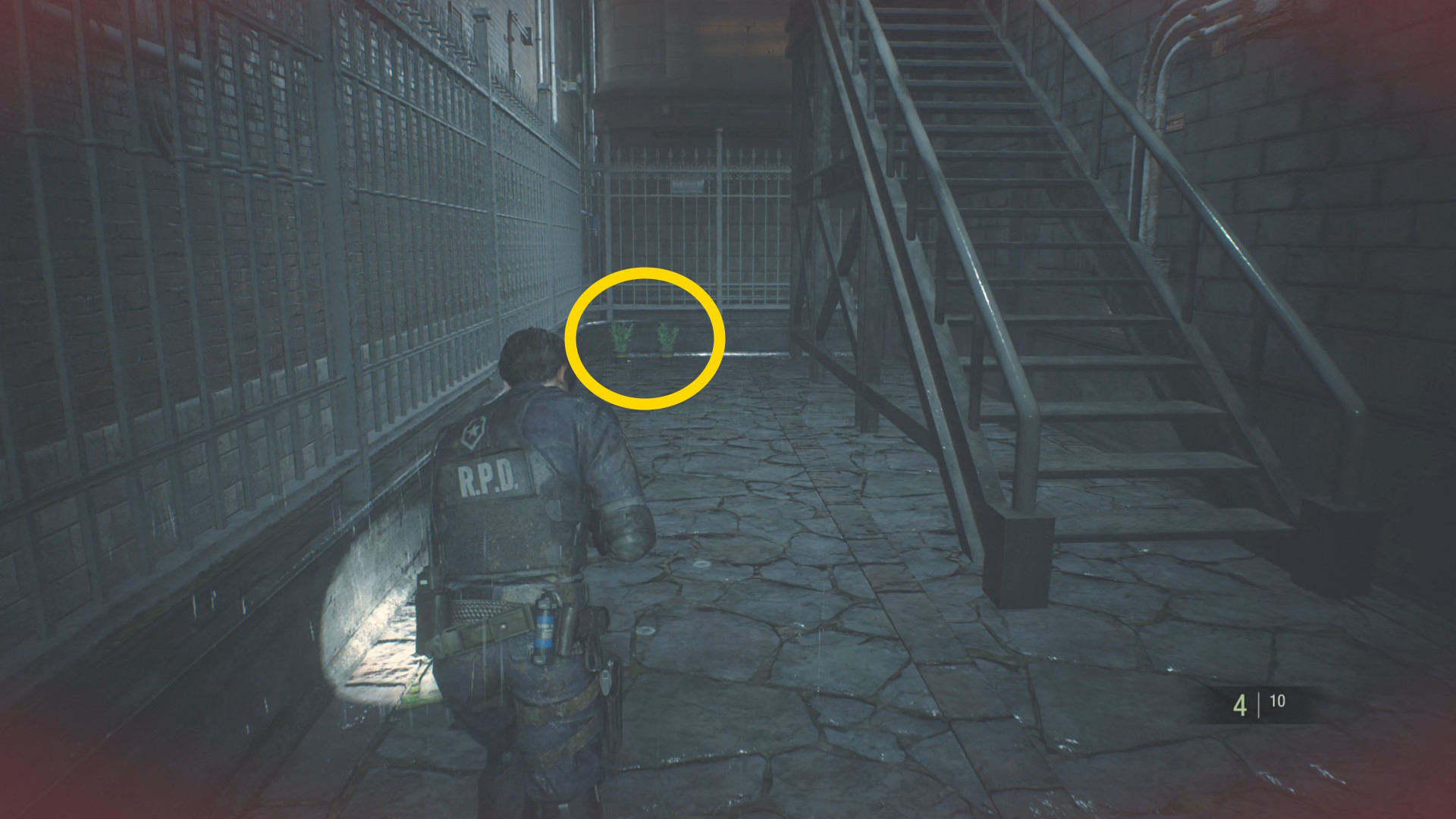 - ダメージを受けている場合、ボイラー室を出て、正面突き当りの グリーンハーブ を1個回収し、その場で小回復