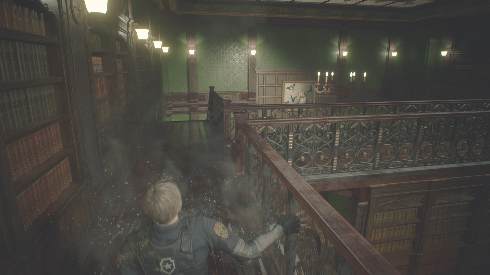 - 廊下には窓から侵入するゾンビとすでに侵入済みのゾンビがおり、画面奥にいるゾンビにショットガンを1発当て、怯ませてから階段を下りる
