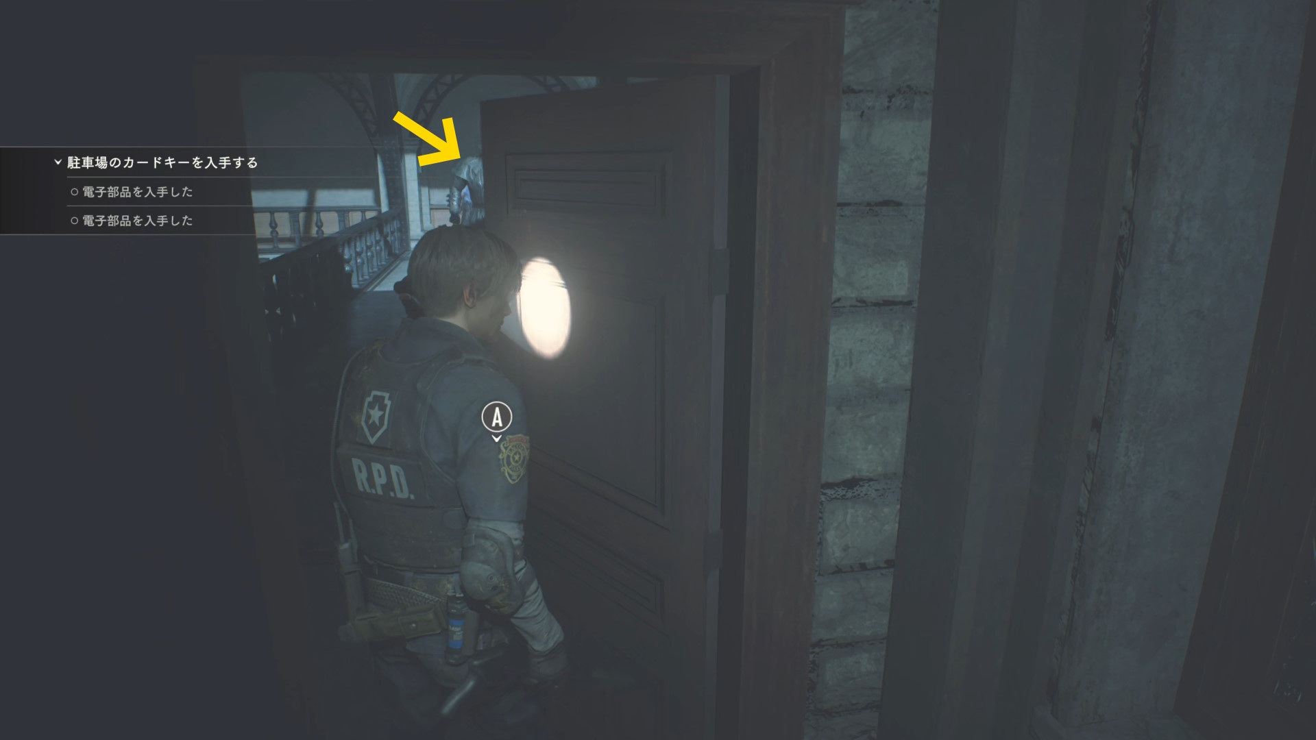 - ドアを開けたとき、正面奥にタイラントがいるときがベストだが、下画像の位置(奥からこちらに向かってきている)でもダッシュすれば追いつかれることはない