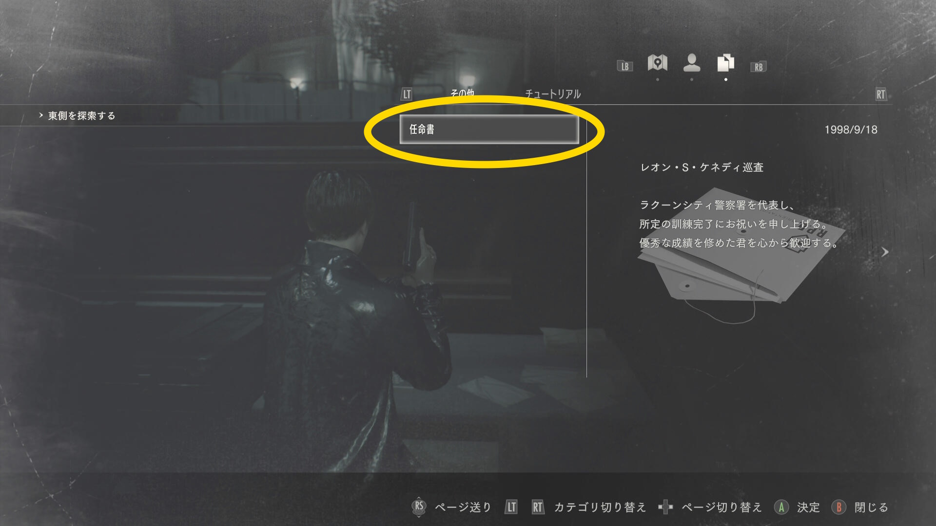 - 「コンディションと回復アイテム」の説明後、RB を1回押して 任命書(ファイル:1/58) を読んでおく