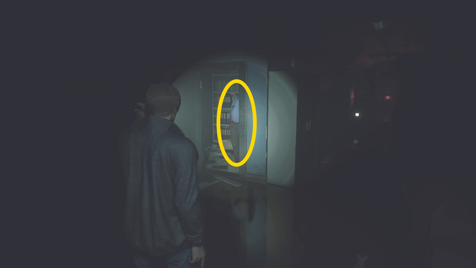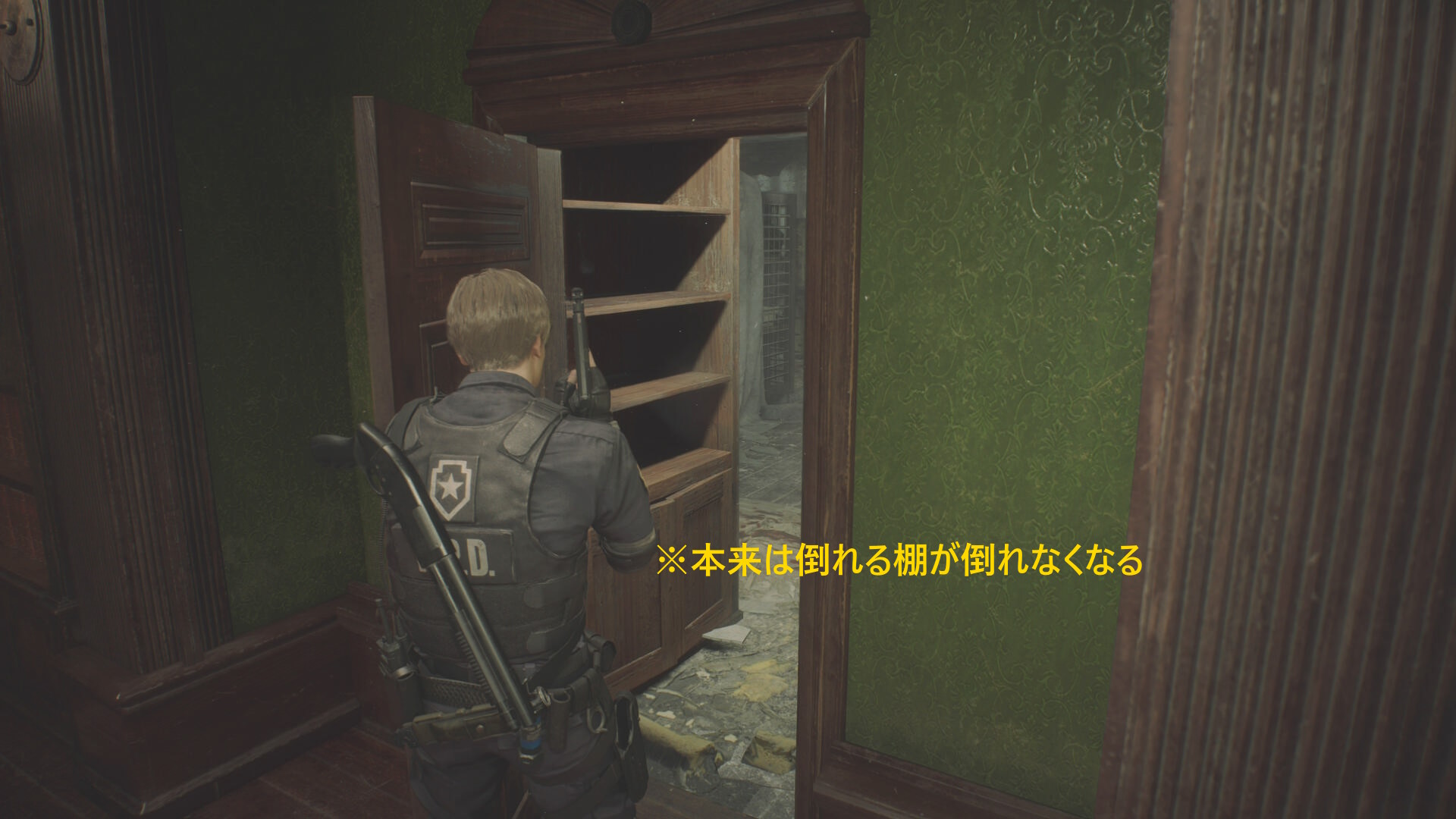 - 図書室に通じるドア横にある棚が本来であれば倒れて通行の妨げとなるが、爆発前に図書室に戻ることで棚が倒れなくなるグリッチがある(下画像:2枚目)