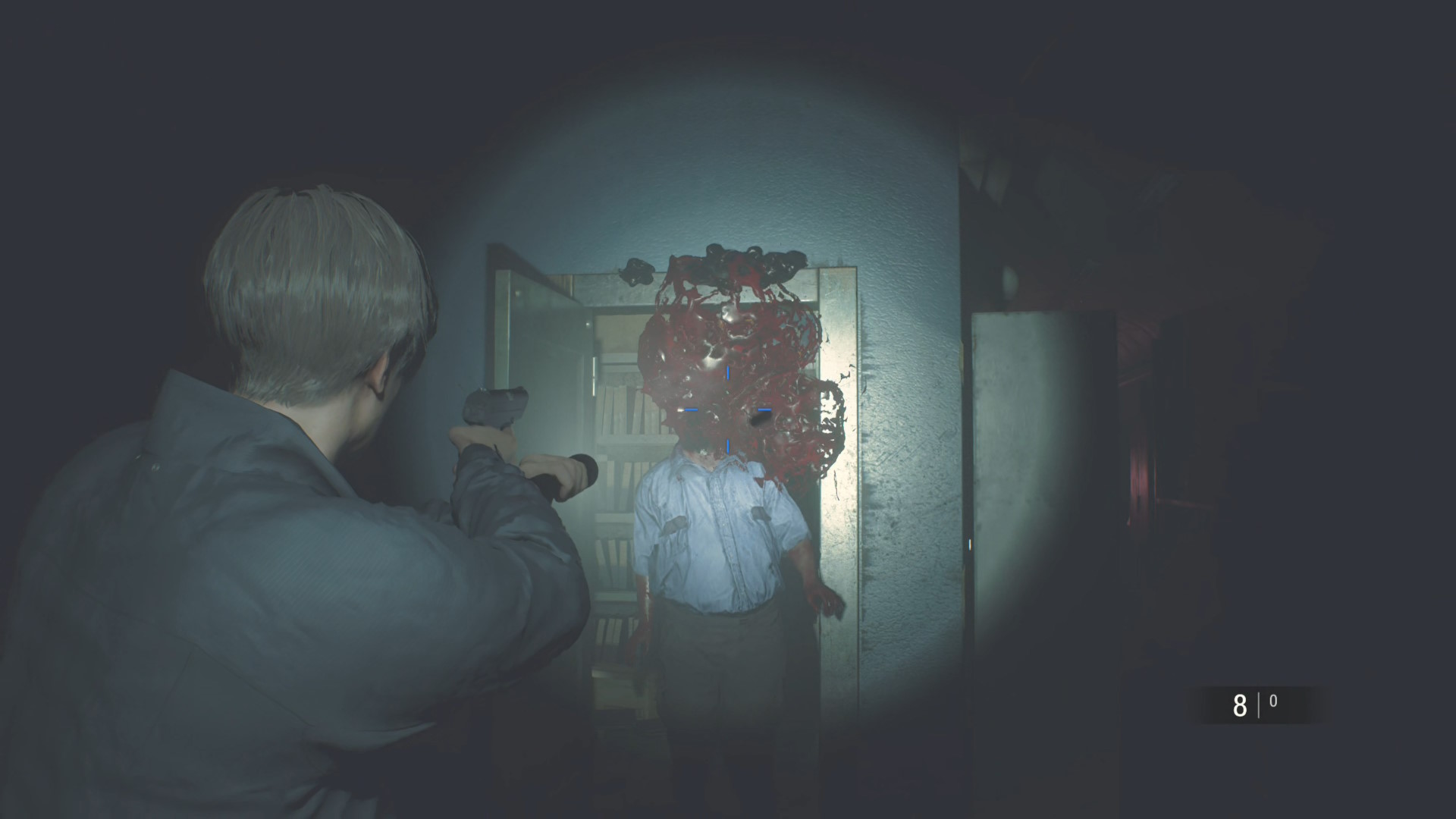 - プレスルームの前を通過すると2体のゾンビが画面奥から向かってくるが、両方とも照準を絞った状態でボディに2発入れればキルできる