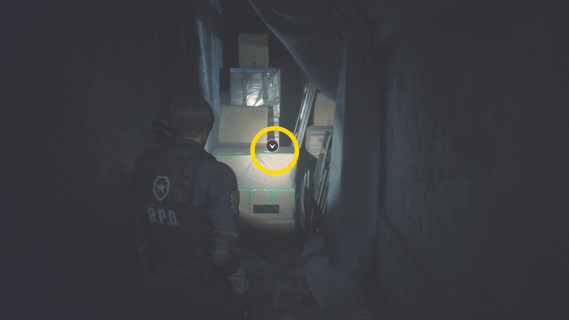 - 積まれたパレットを登り、頭上の割れた窓から廊下に出る(下画像:緑矢印)