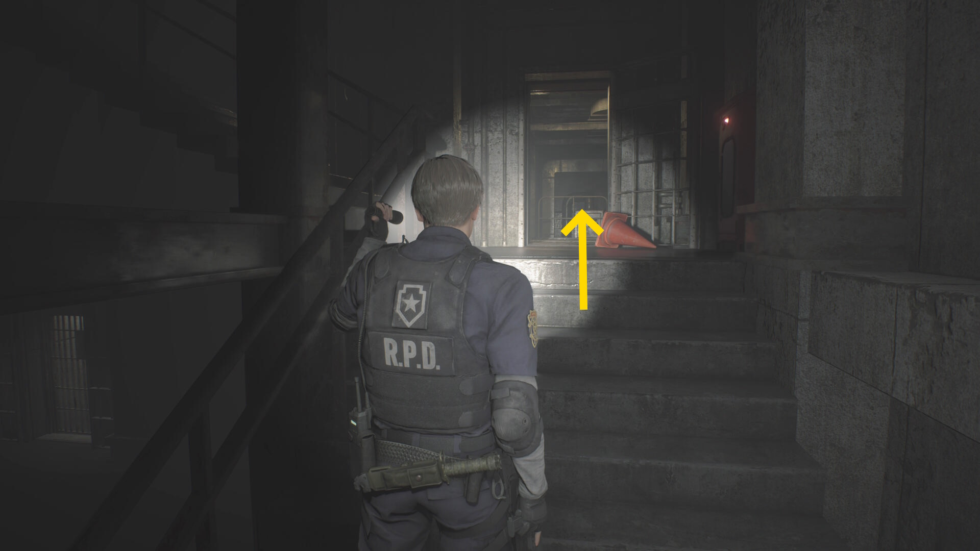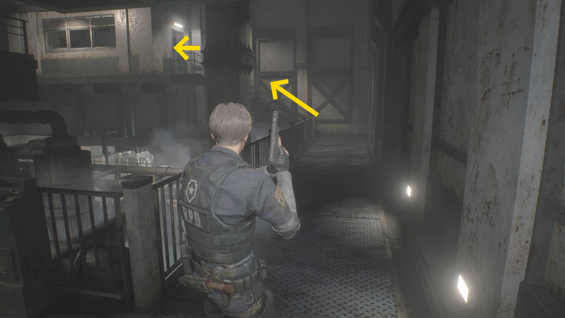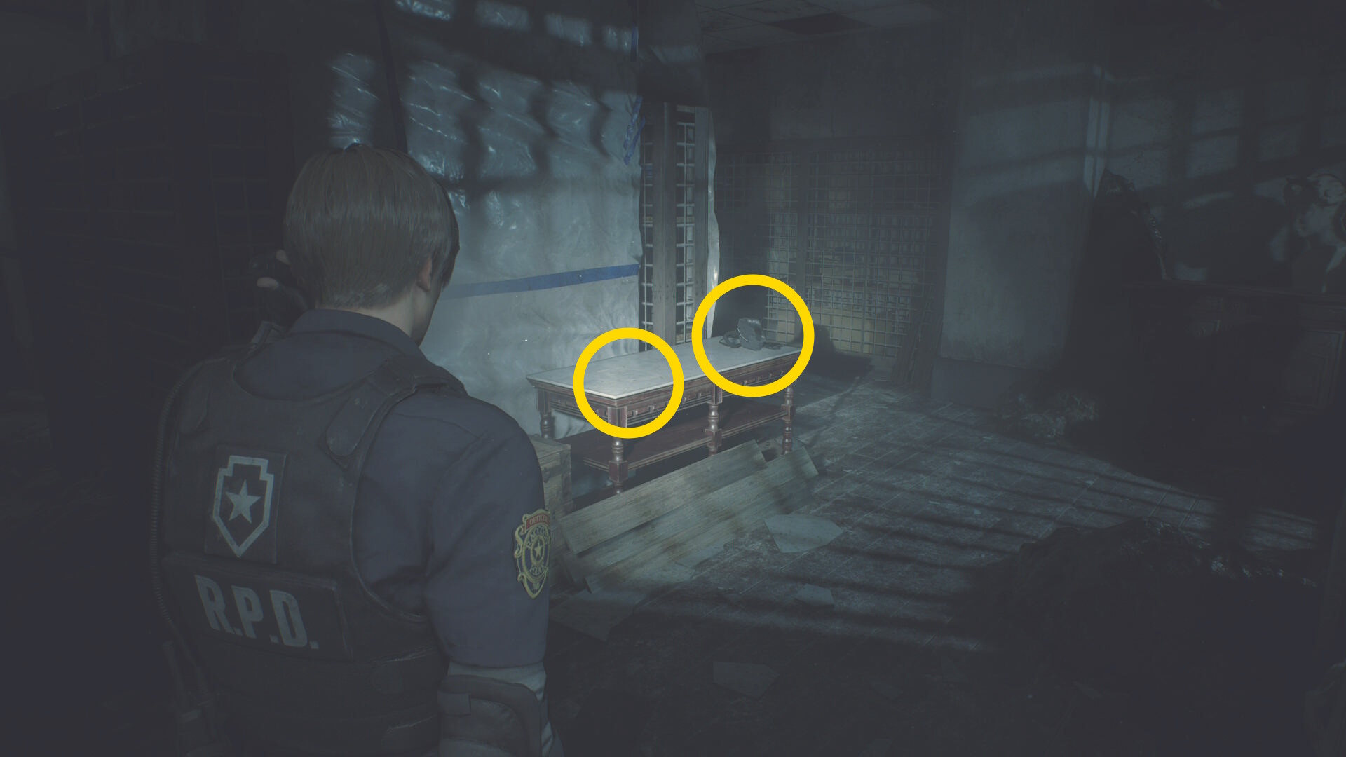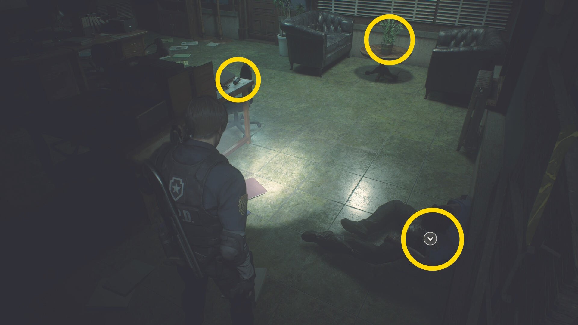 - カットシーン後、階段を下りて左の棚に ショットガンの弾、正面の机上に 閃光手榴弾