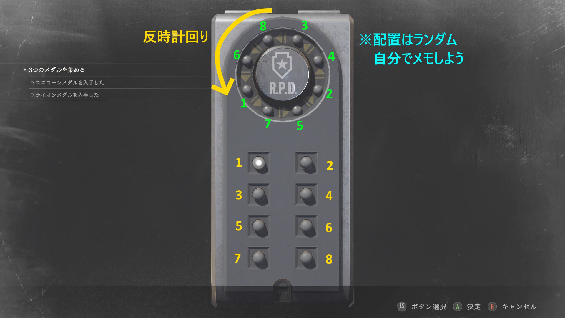 - ダイヤルを 9 ⇒ 15 ⇒ 7 と回してから A を押せば解錠(金庫・ダイヤルロック:1/8)