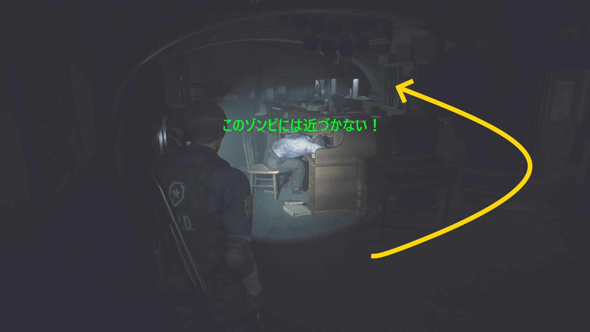 - 西側オフィスに入ったら、目の前に机に突っ伏したゾンビがいる