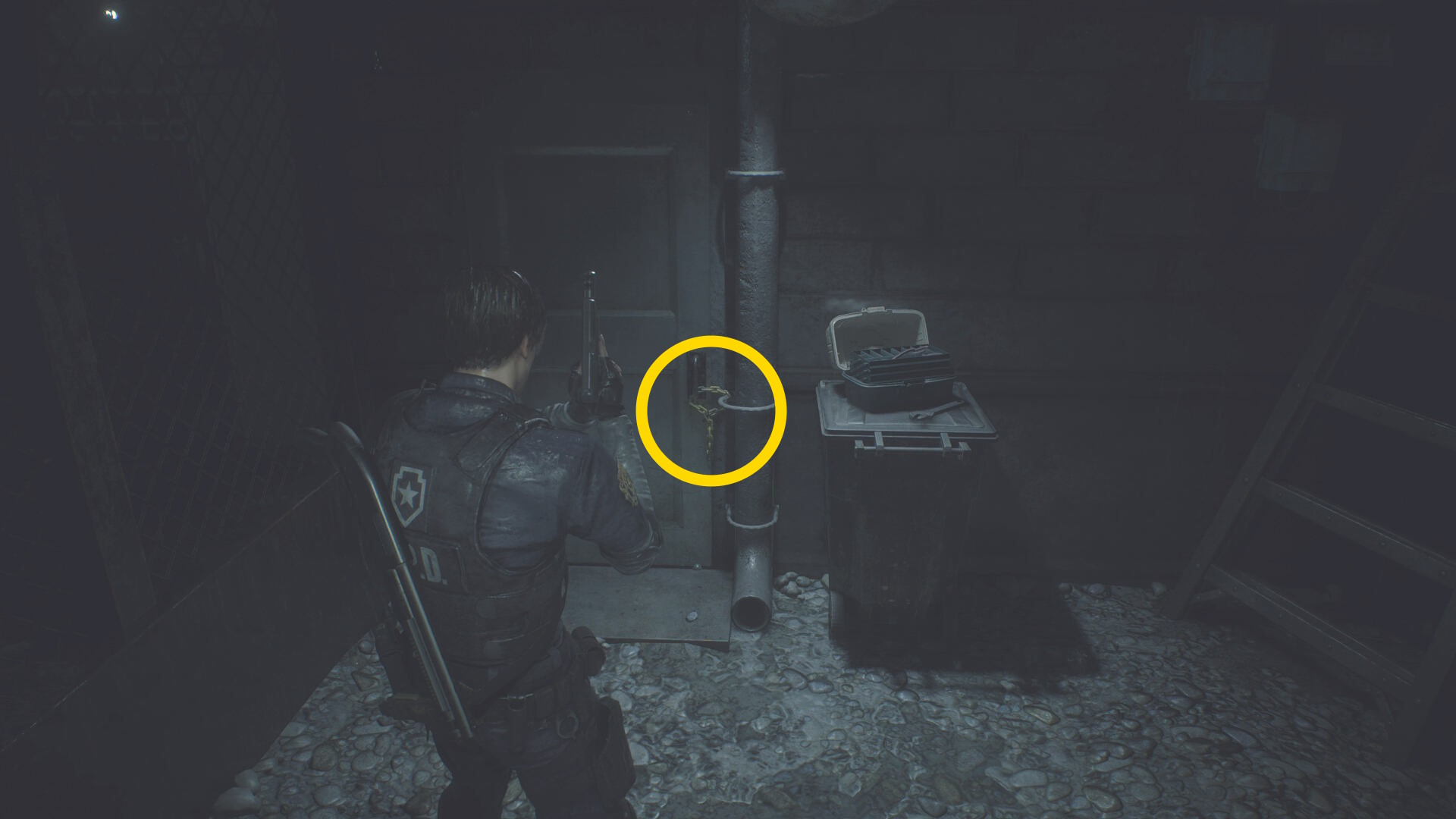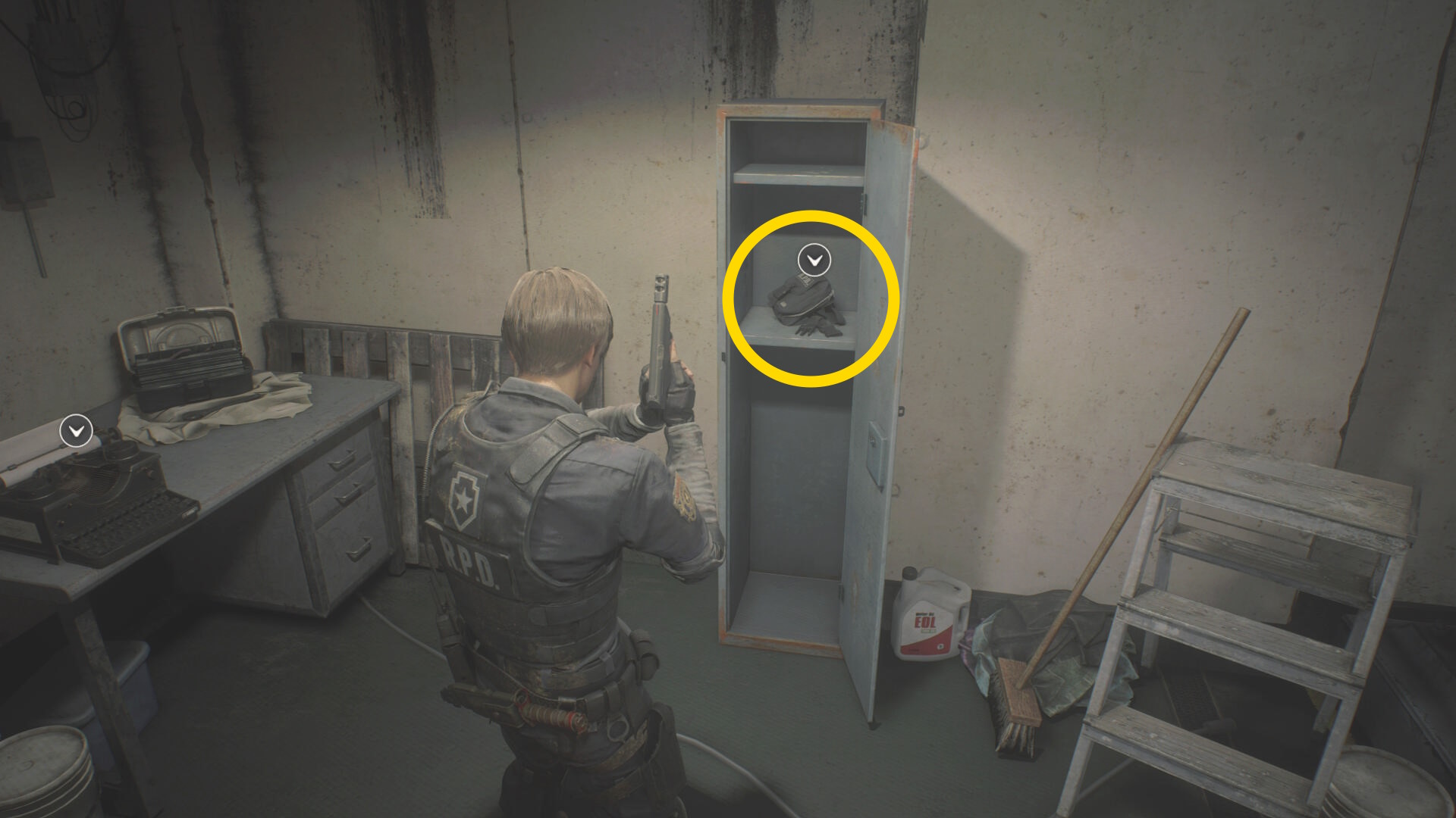 - 左後ろを向くと ショットガンの弾、右にかかった革ジャンの近くに 閃光手榴弾