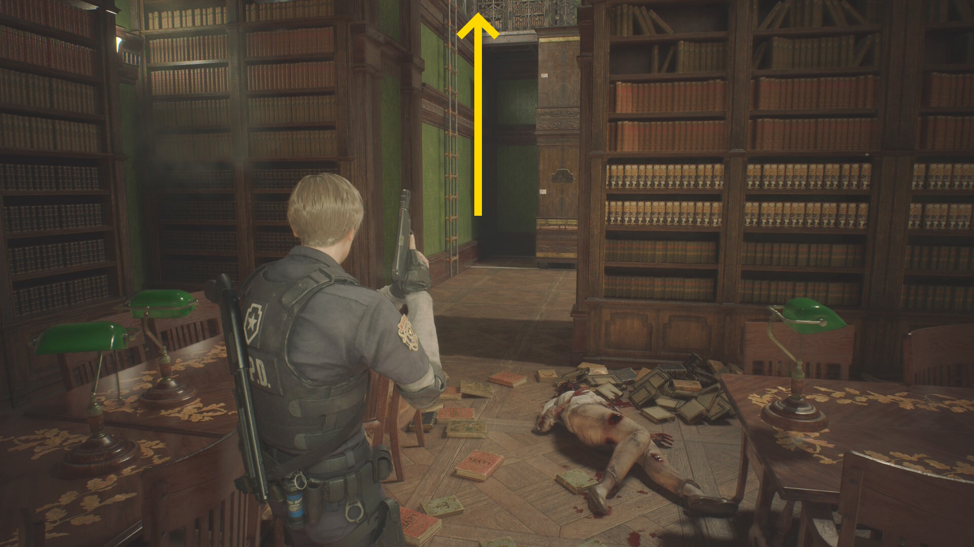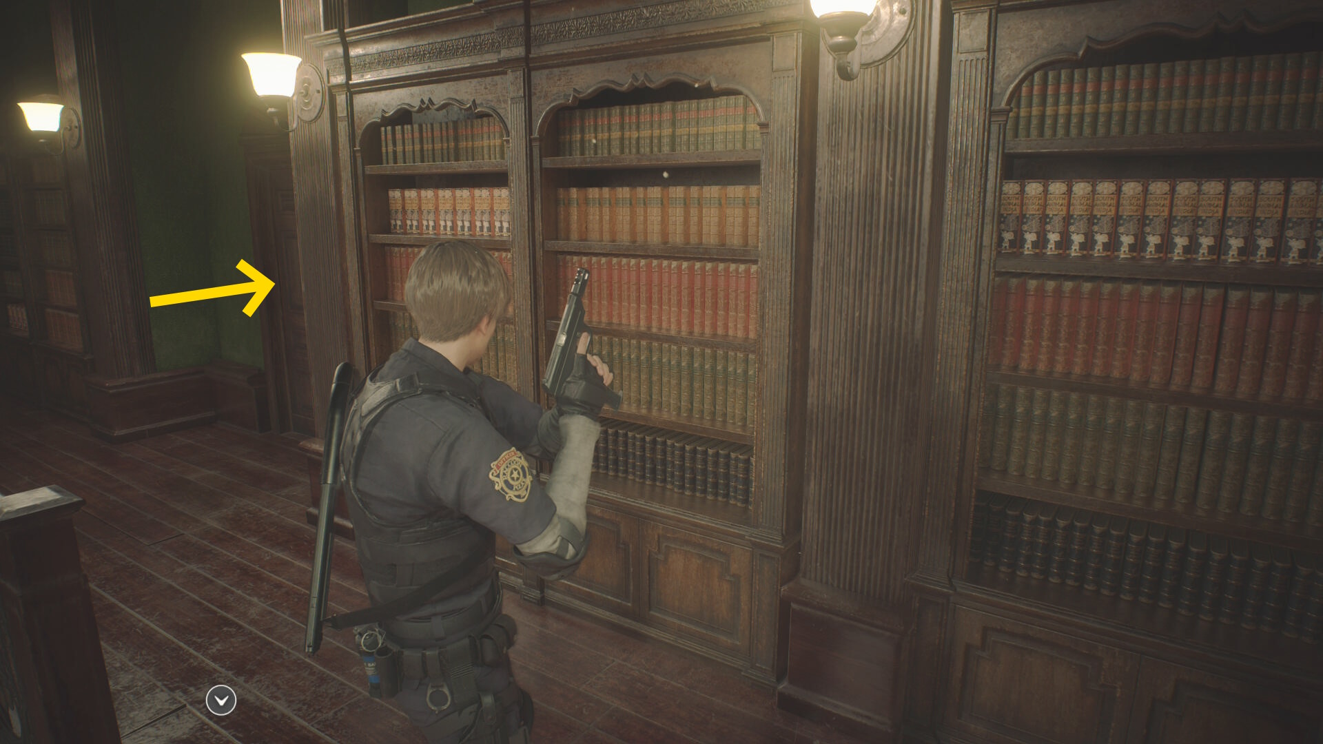 - バリケードにぶつかったら右折し(カメラは正面に戻してオーケー)、図書室へのドアに走っていく