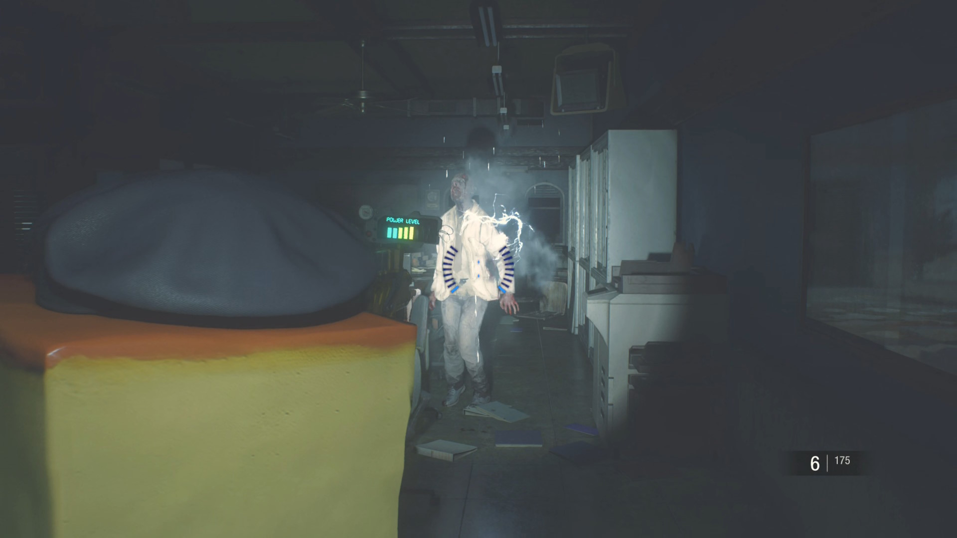 - オフィス内の右に沿って進み、手前のゾンビをスパークショットの極大放電でキル