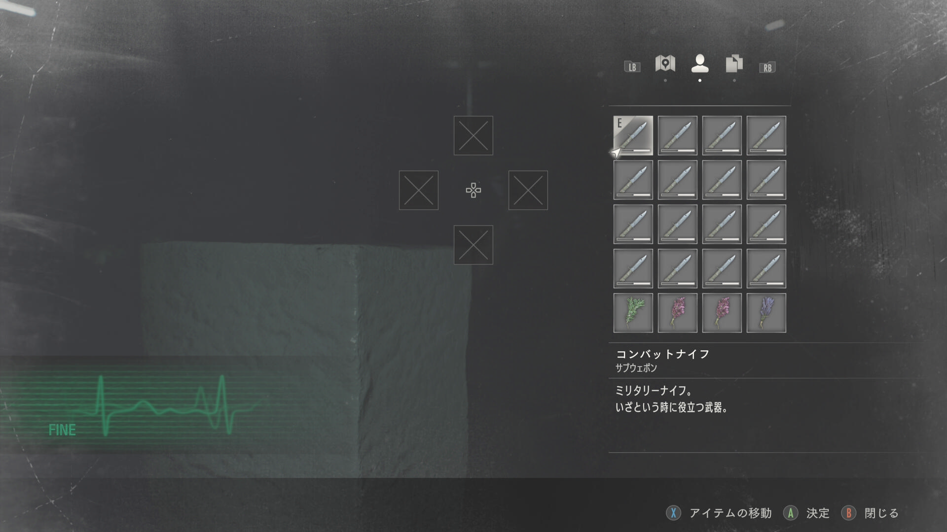 - The 4th Survivor と同様に道中でアイテムを回収する形式ではないため、開始時に所持している武器・アイテムのみを駆使してクリアを狙う(所持武器、アイテムは下画像のとおり)
