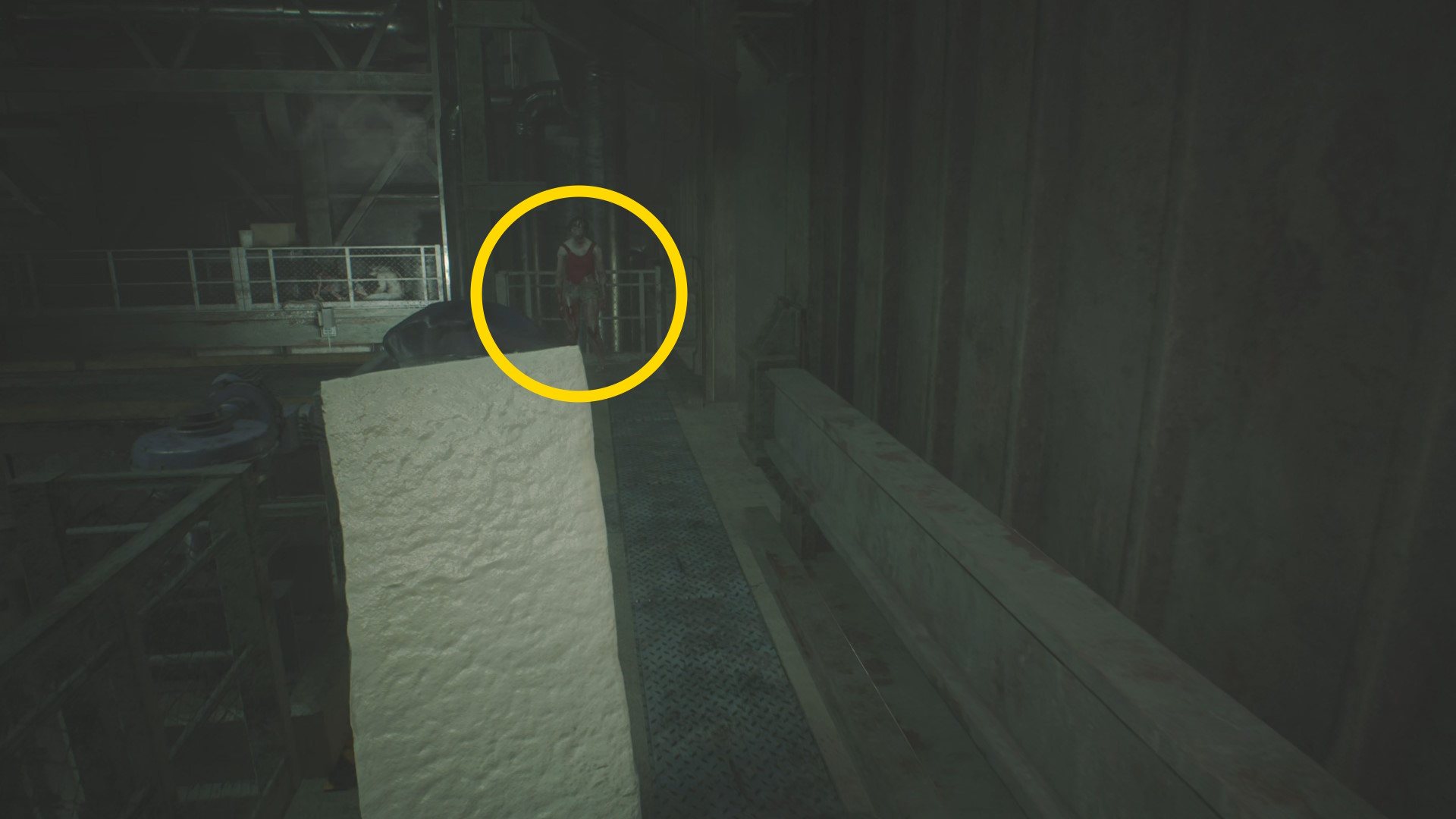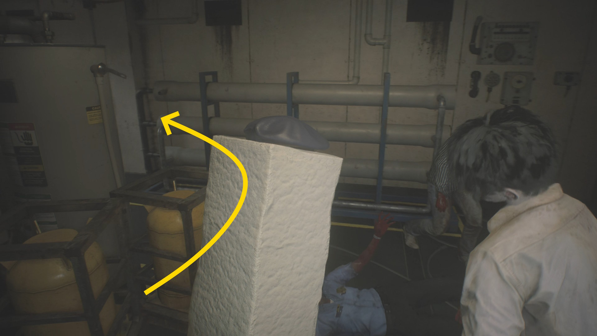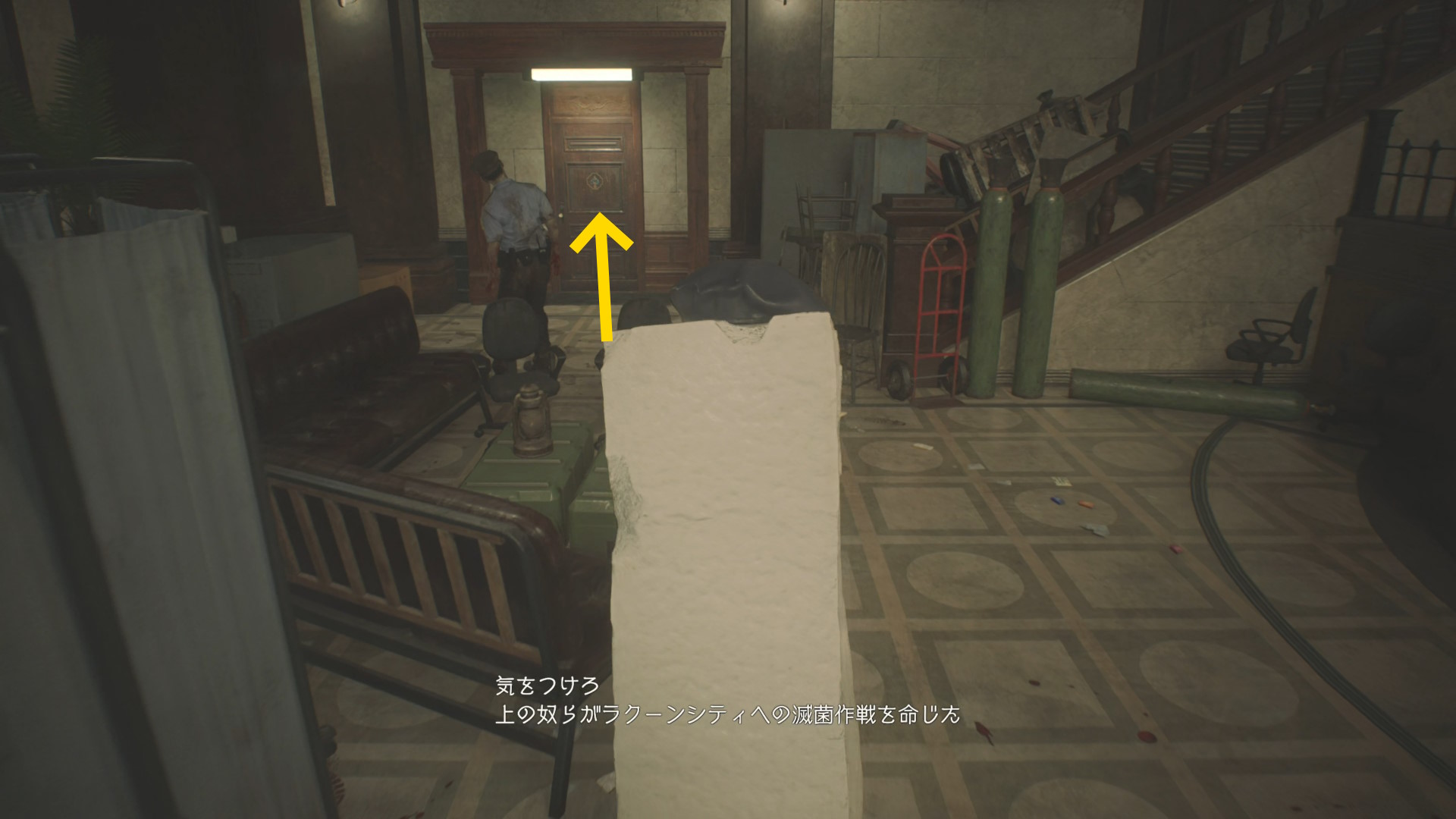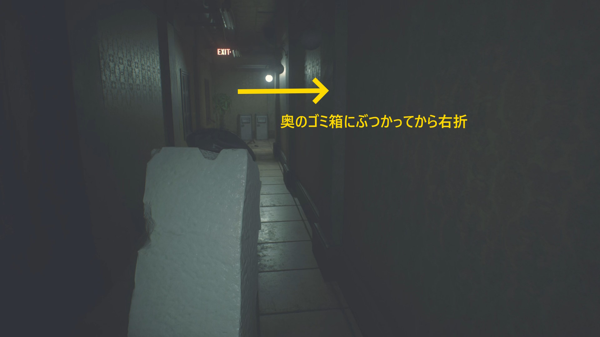 - 奥にタイラントが待っているので、ゴミ箱にぶつかってから右折するように進むと捕まりにくい