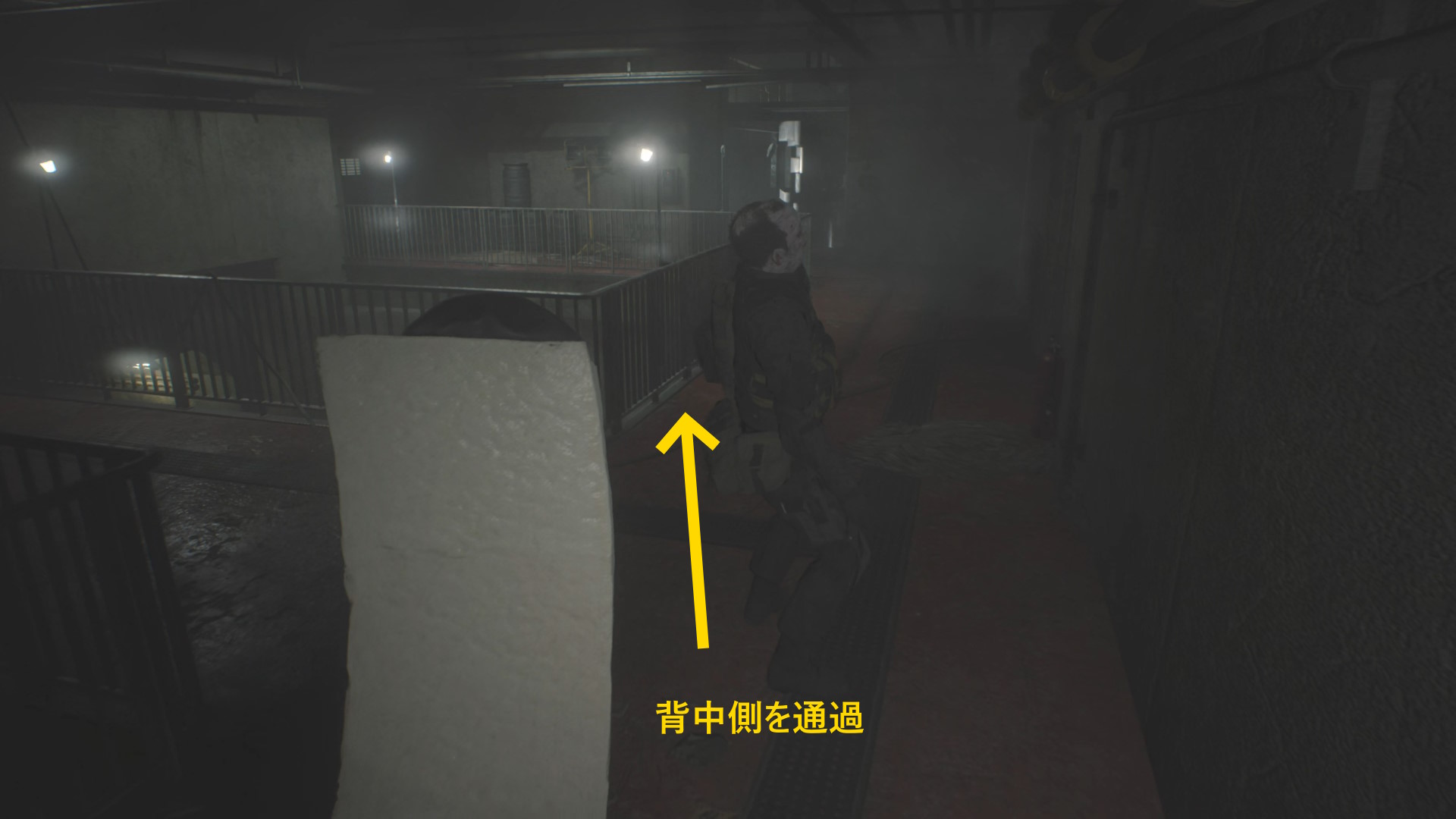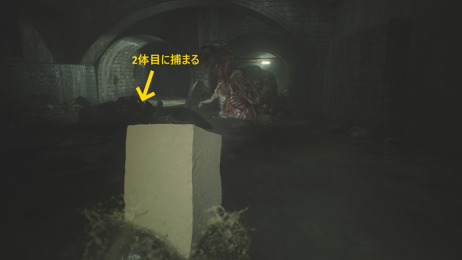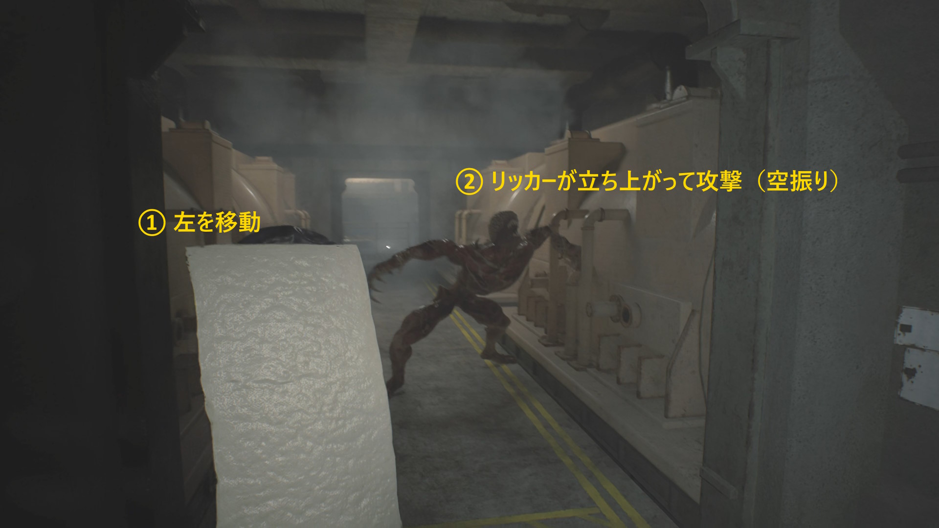 - 通路の左に沿って進めば、匍匐してきたリッカーが立ち上がって攻撃するが多くは空振りに終わる(もしくは舌攻撃)