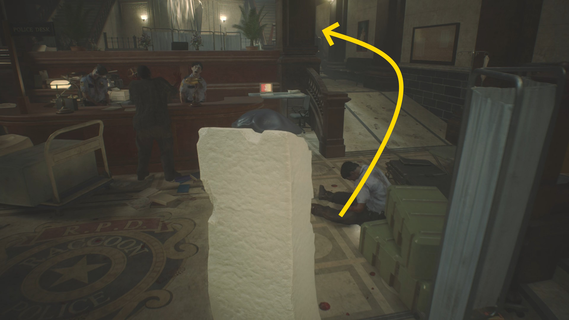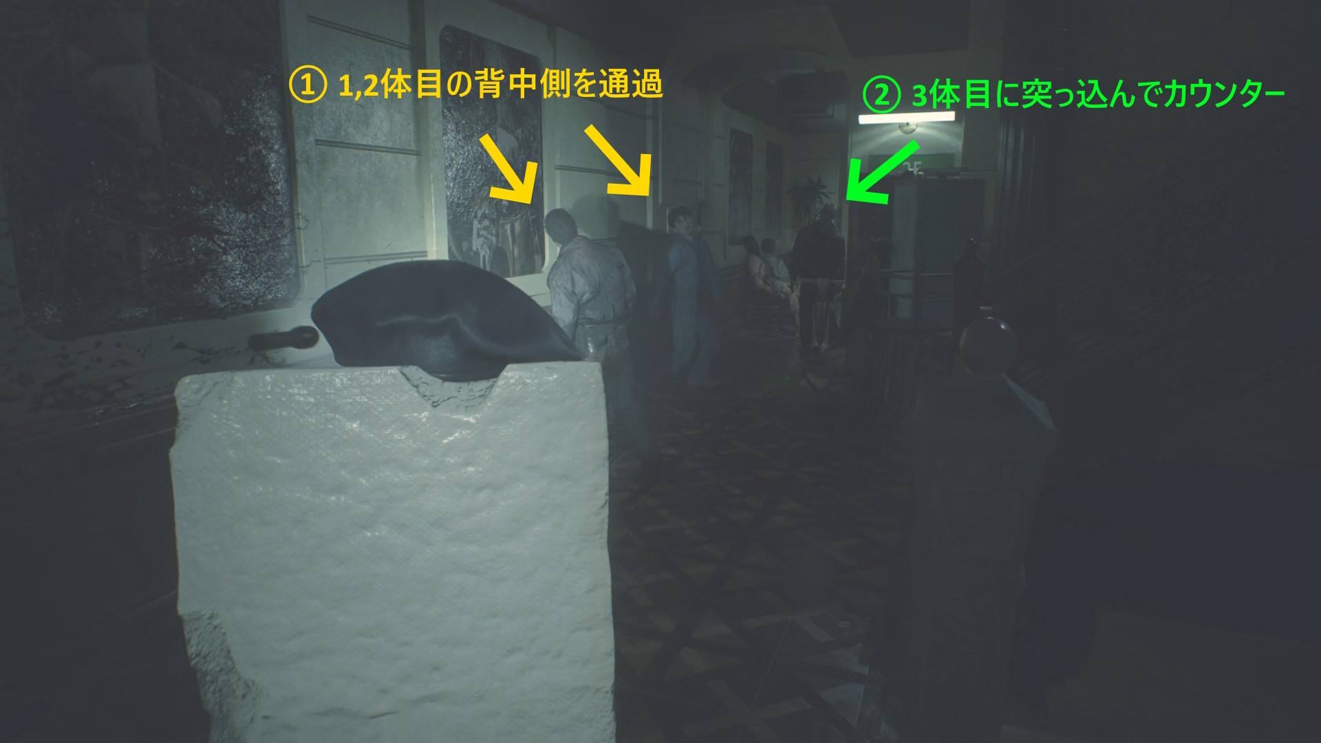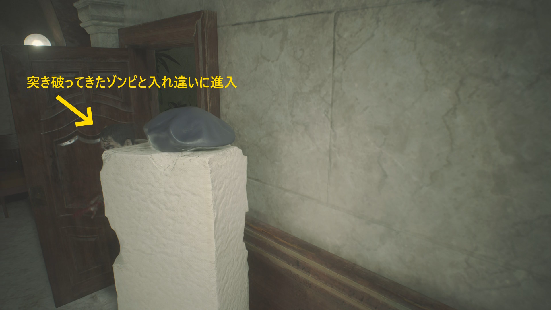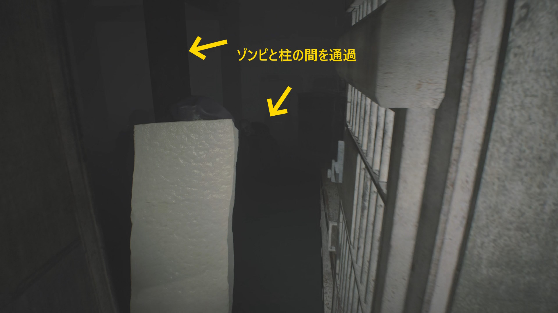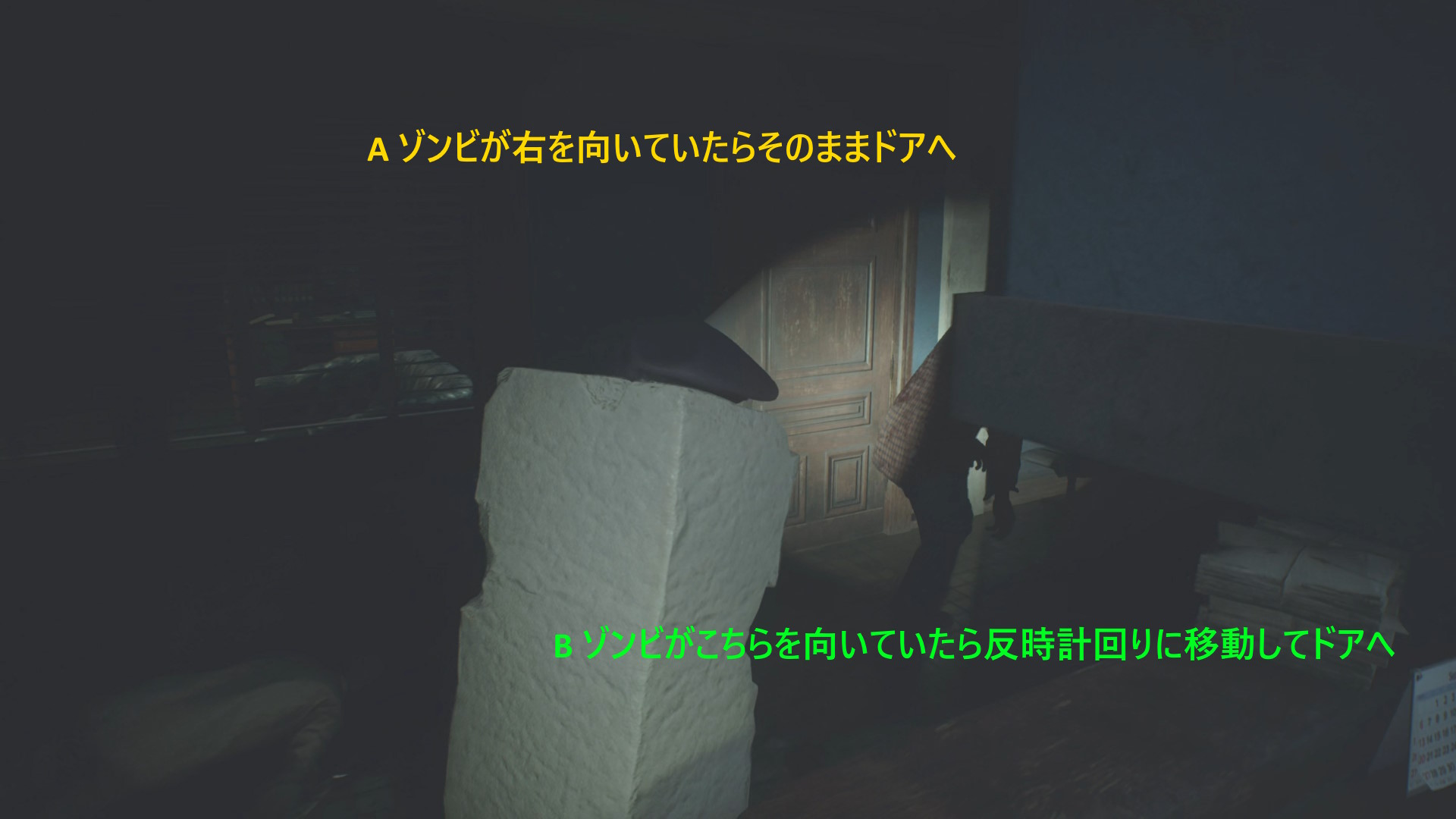 - ドアを開けたらまっすぐ進み、立ち上がるゾンビと左の柱の間を通過