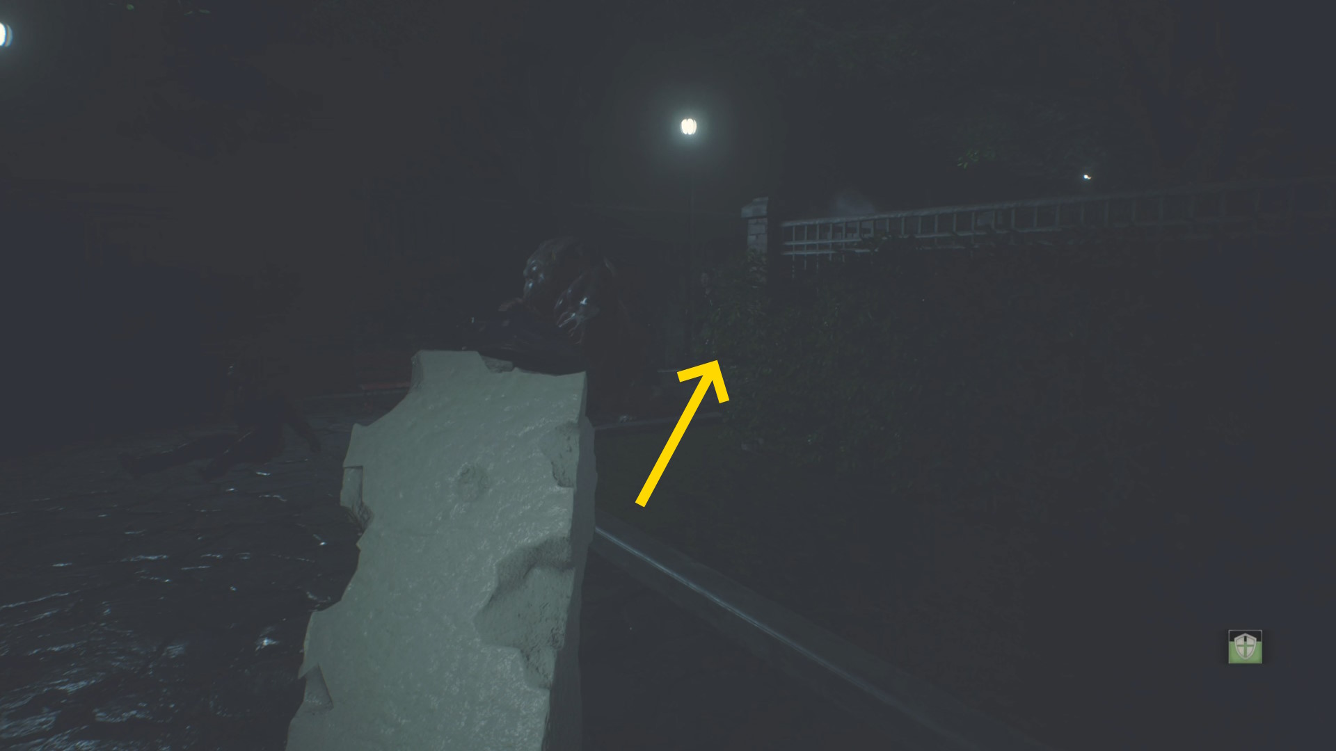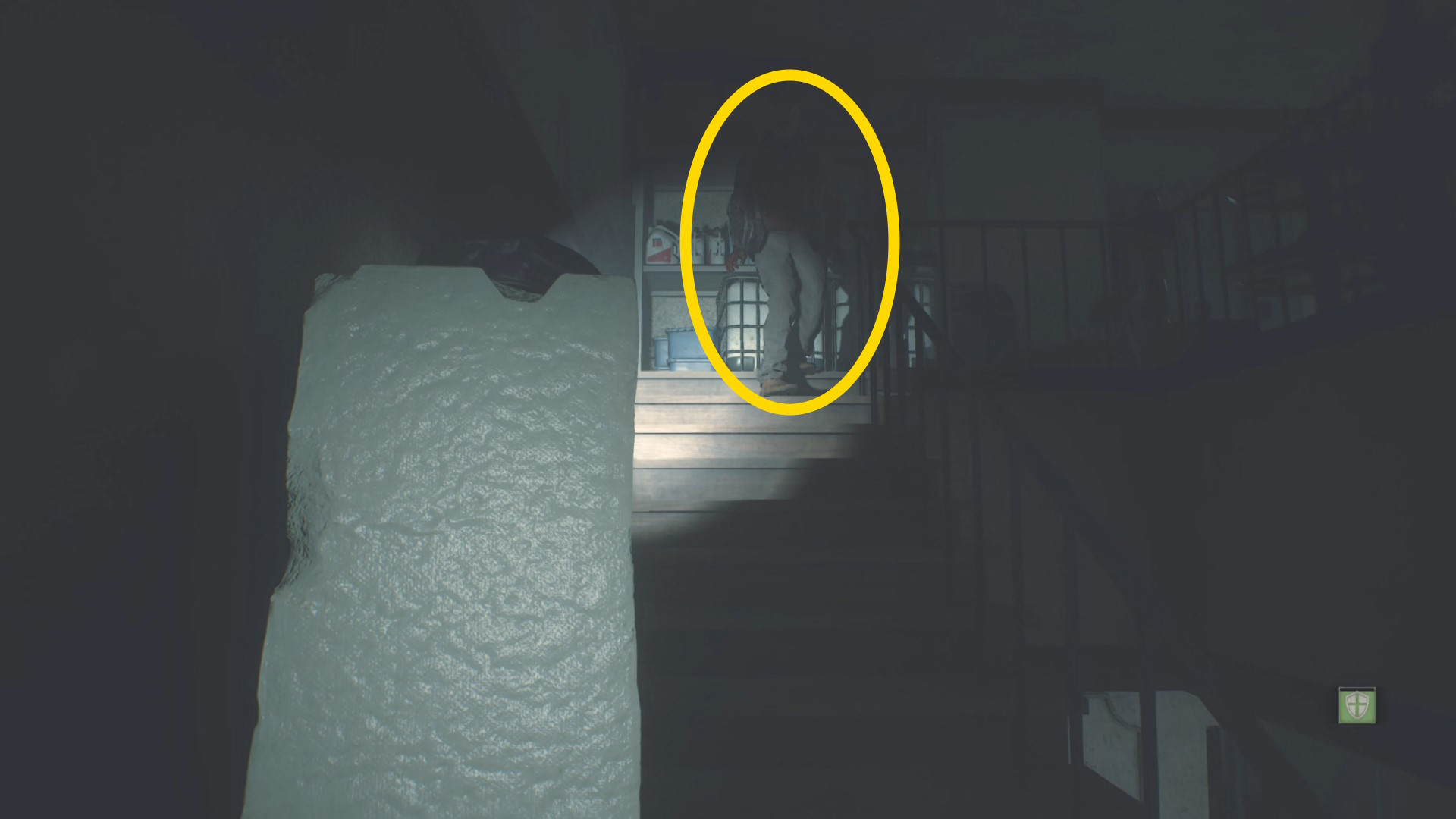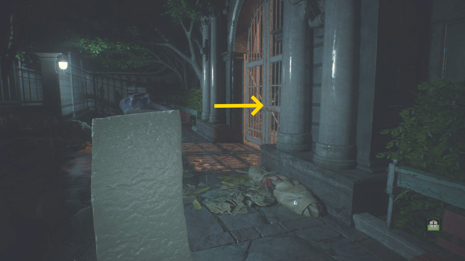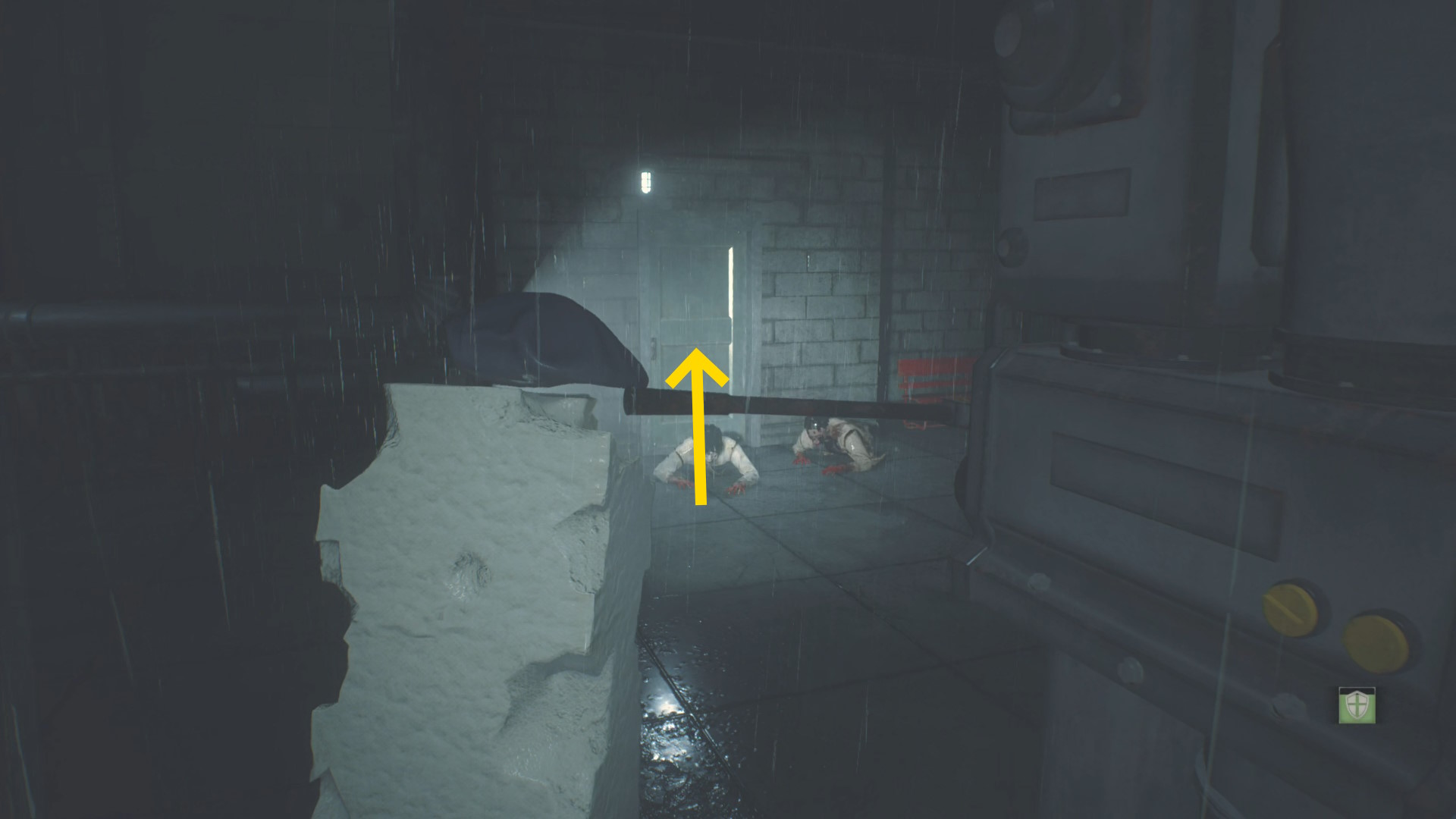 - ドアを開けたらまっすぐ進み、立ち上がるゾンビと左の柱の間を通過