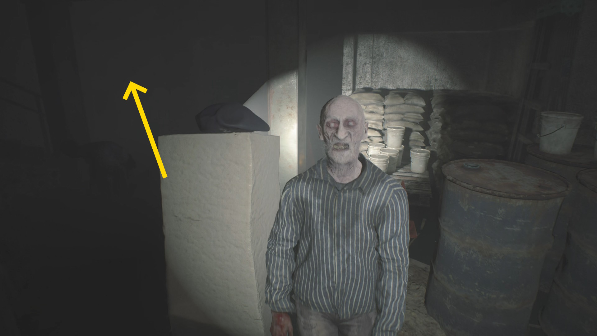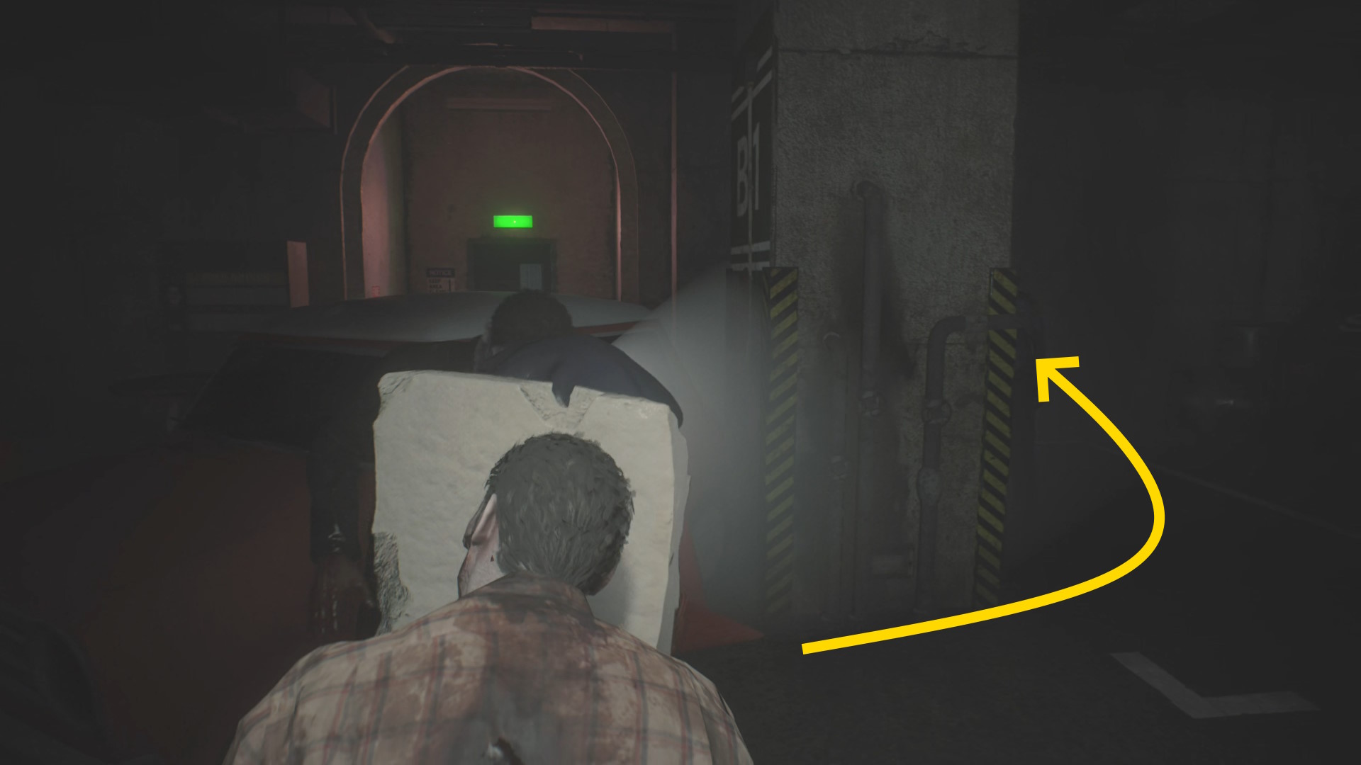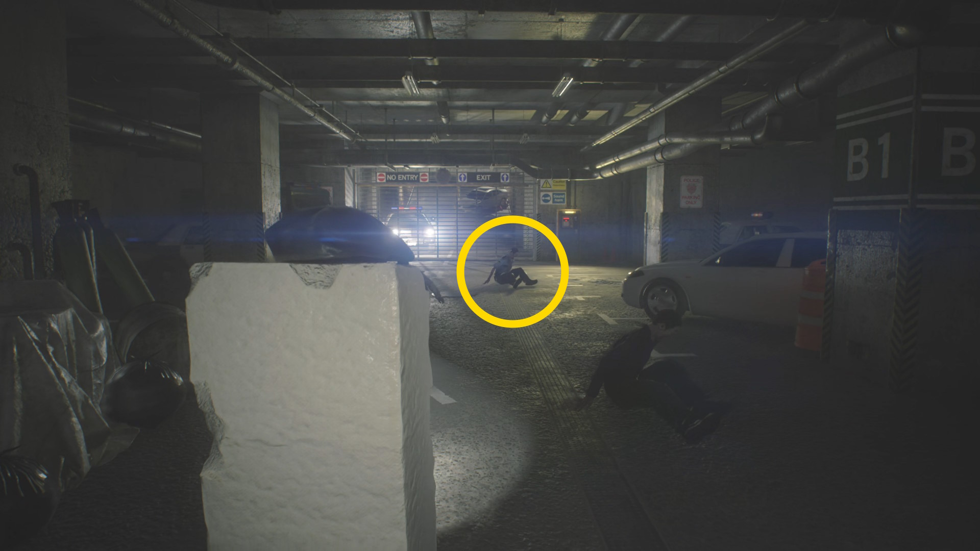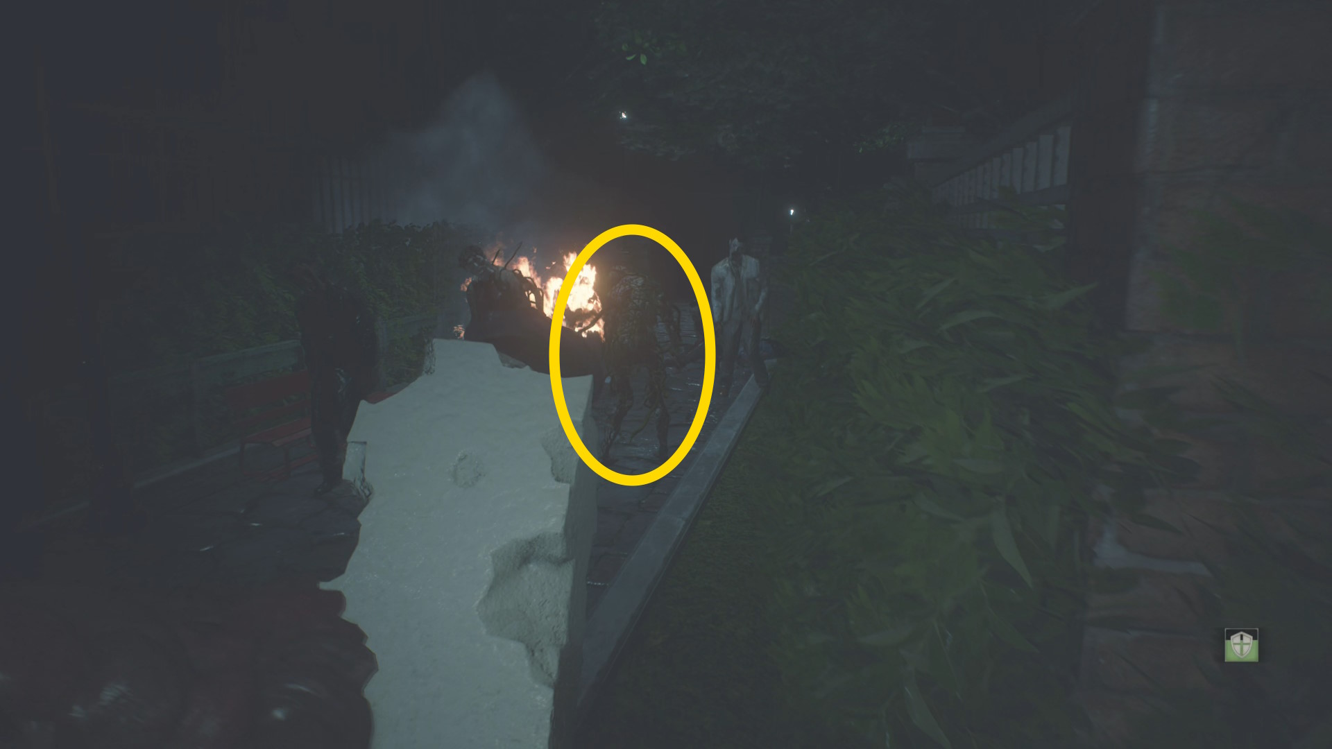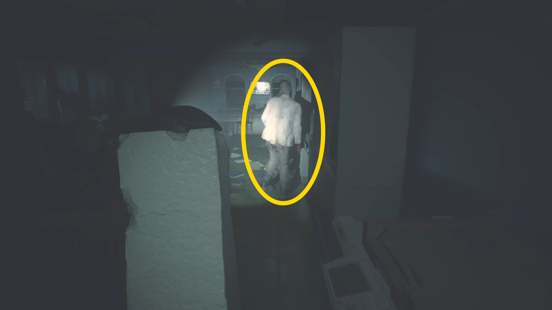- ドアを開けたらまっすぐ進み、立ち上がるゾンビと左の柱の間を通過