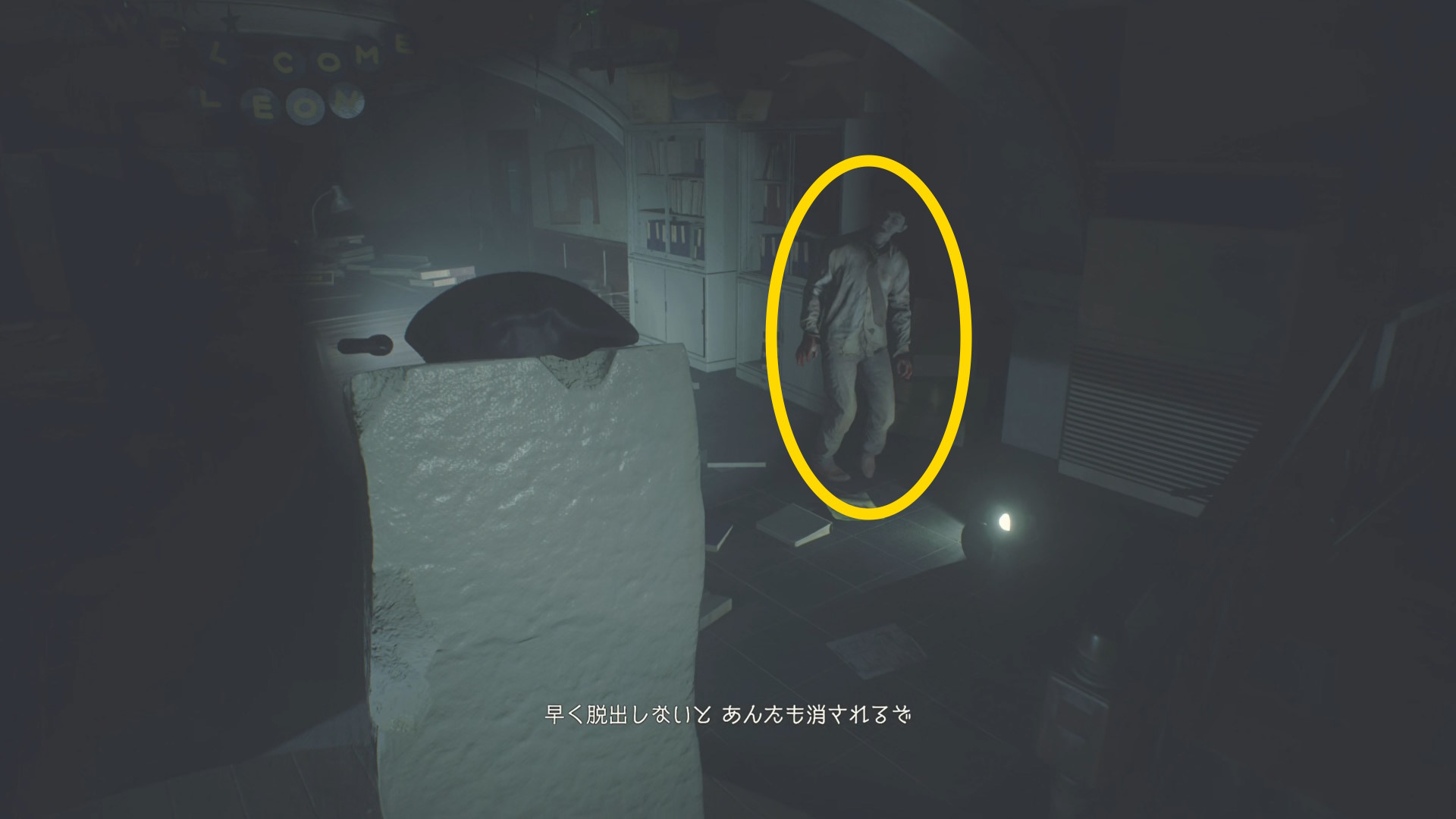 - 図書室へのドアをバンバンしているゾンビがおり、まずはドアの右脇にそっと移動