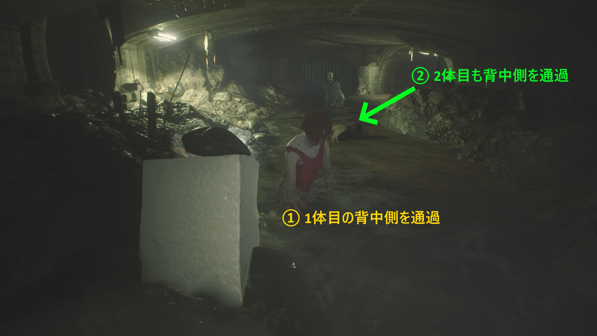 - 手前の1,2体のゾンビは背中側を通過してスルーできることが多い