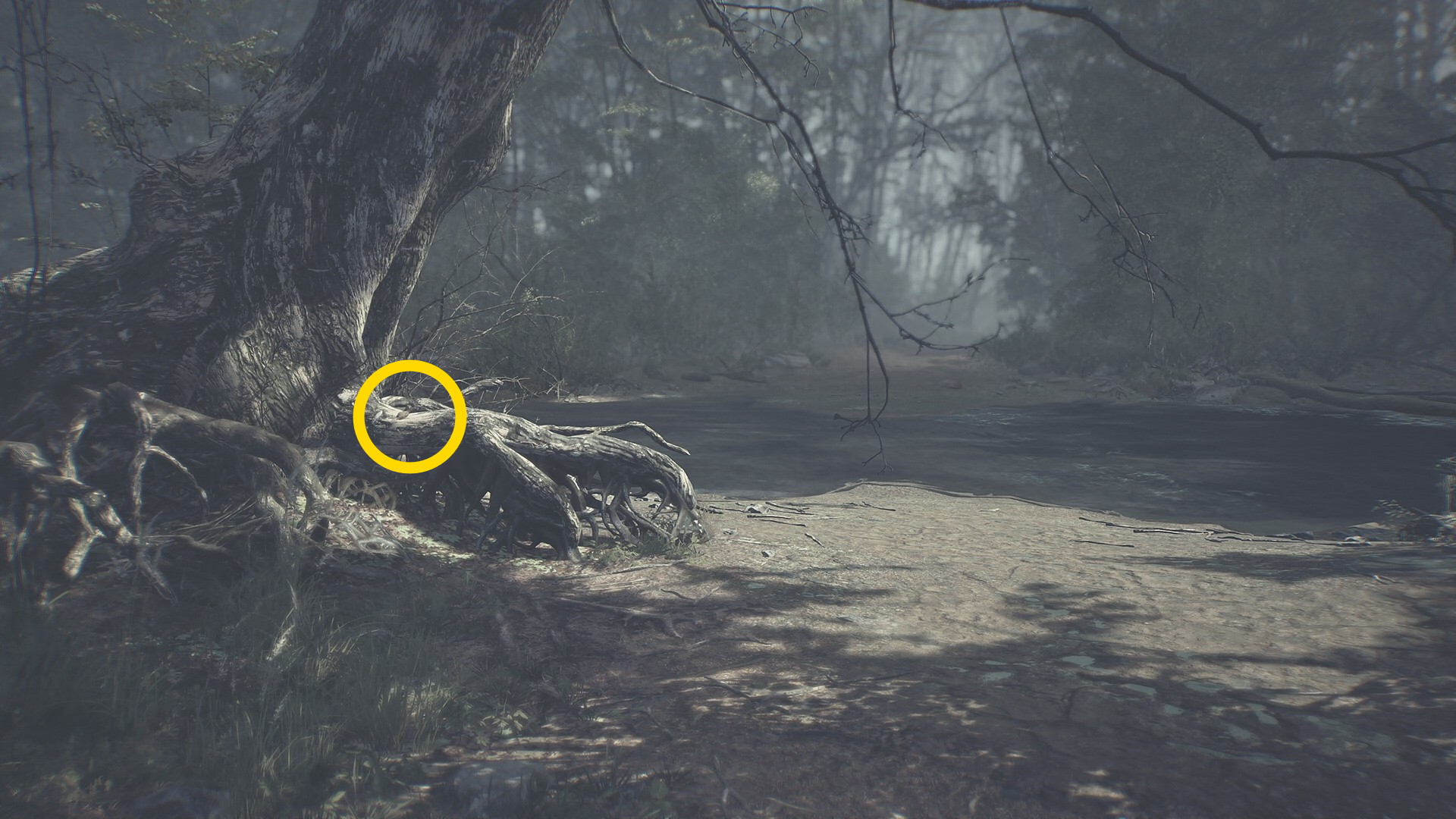 - 川の手前、左側に大木があり、その根元に 木人形 (3/13)