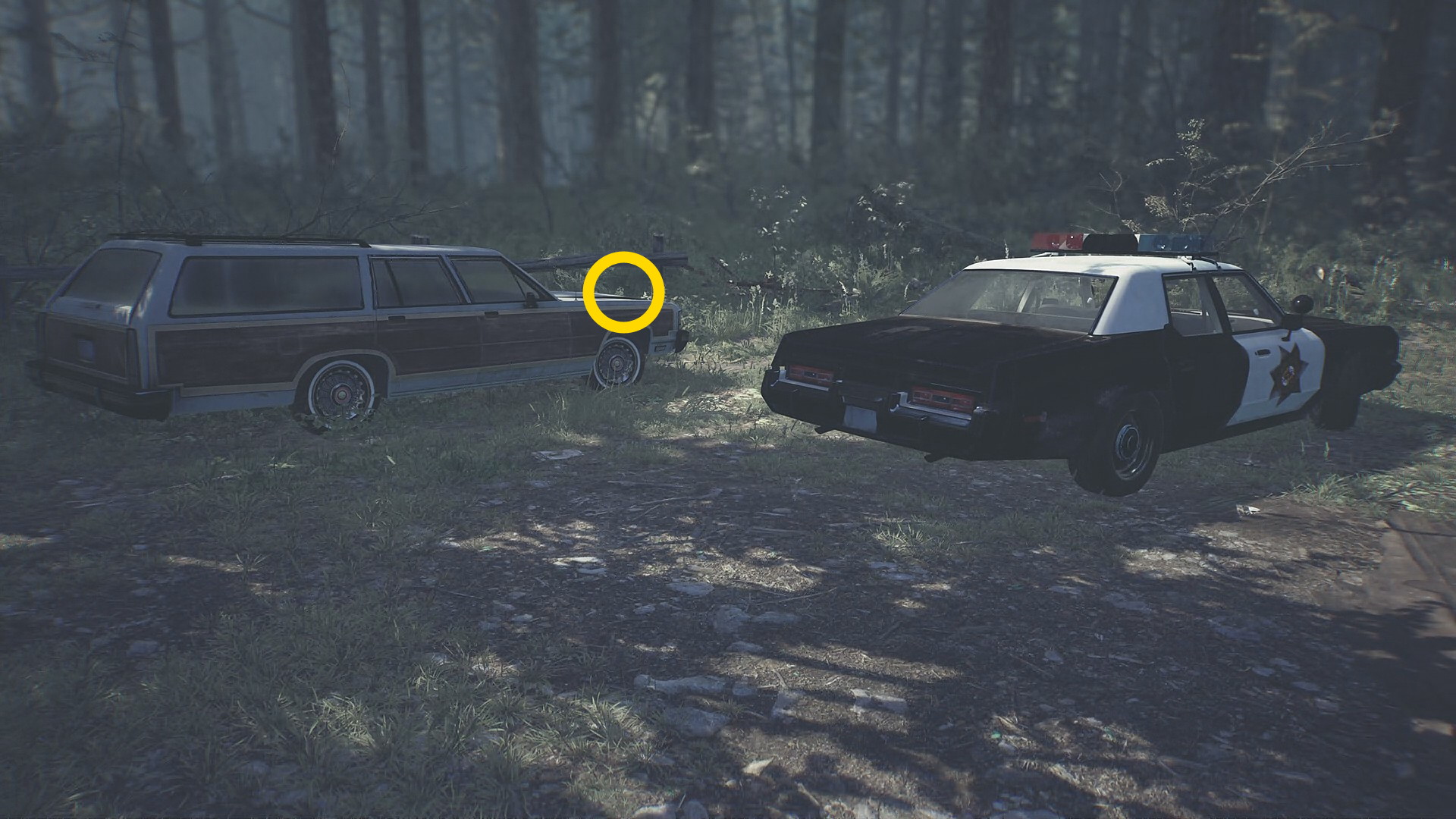 - 森への入口近くに停めてある黒いパトカーのボンネットに失踪した子供の情報がある