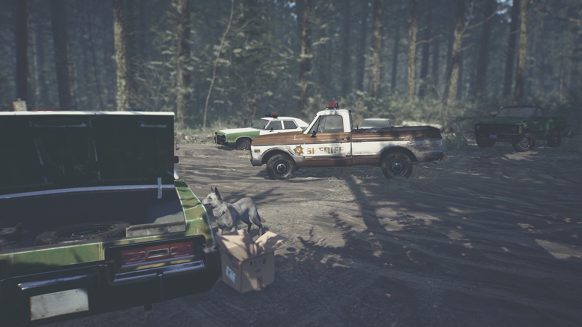 - 右を見ると白と茶色の保安官の車がある