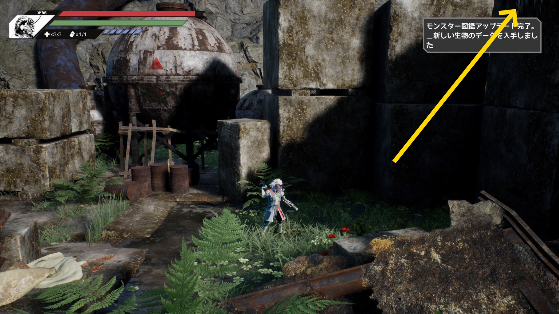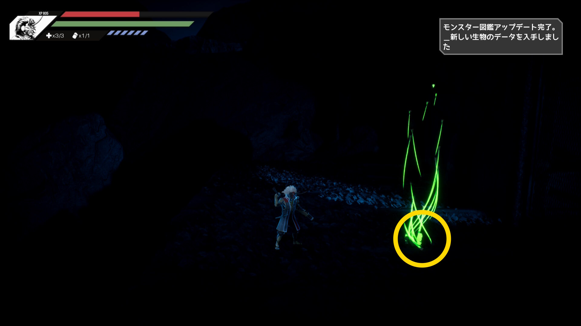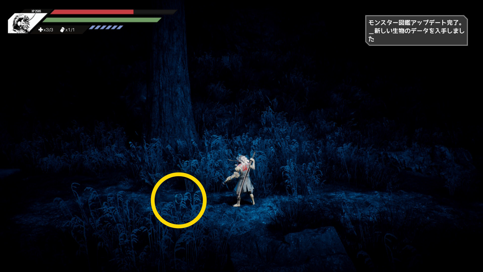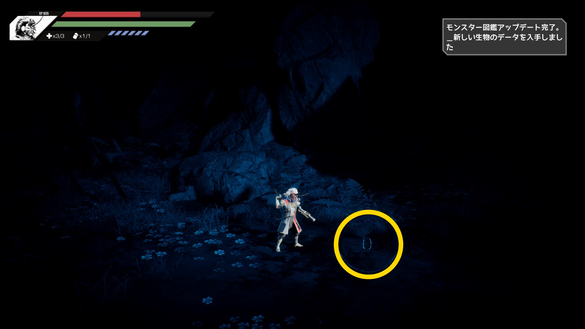 - 右に進み、大木を過ぎたところに 敵のデータ が落ちている ⇒ モンスター図鑑のアップデート( THA3「コダマ」100%)