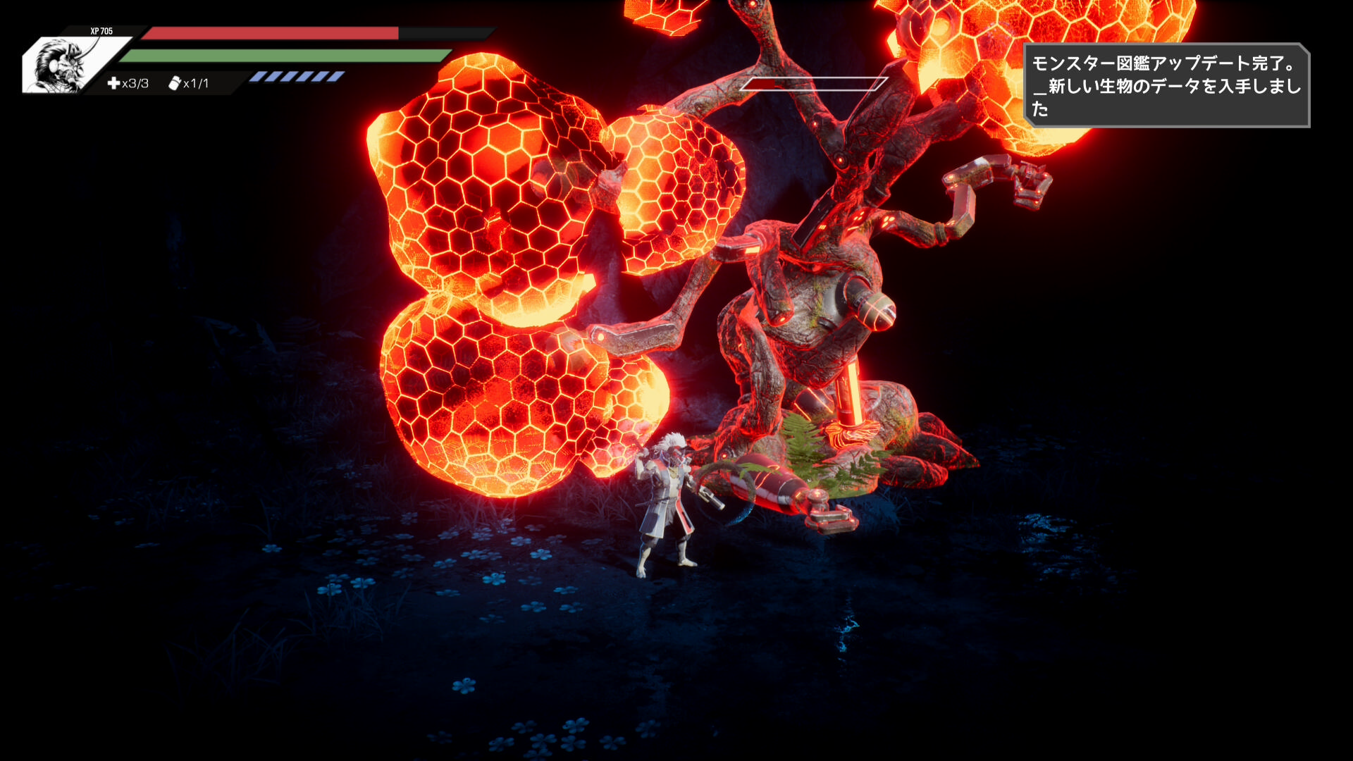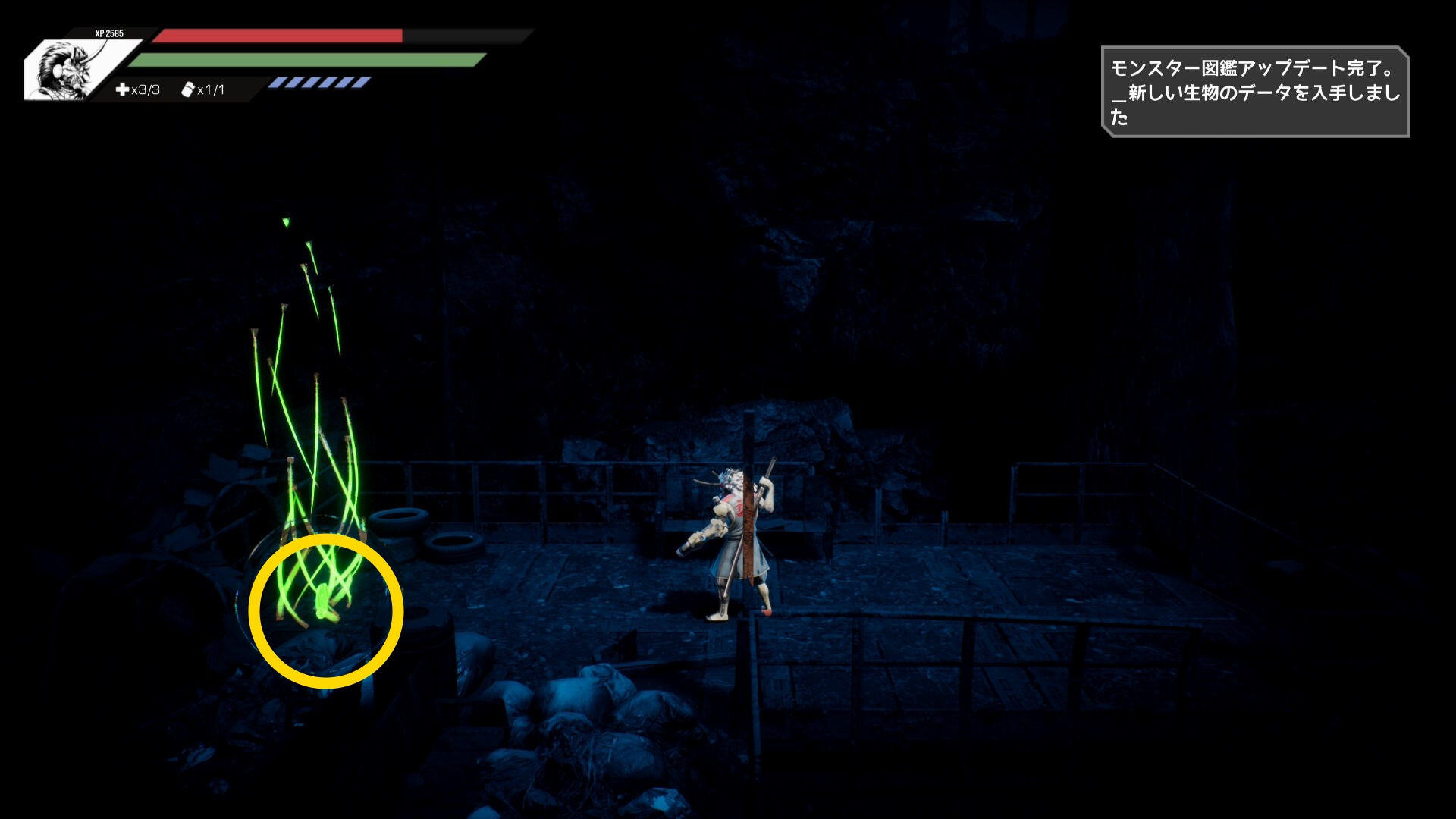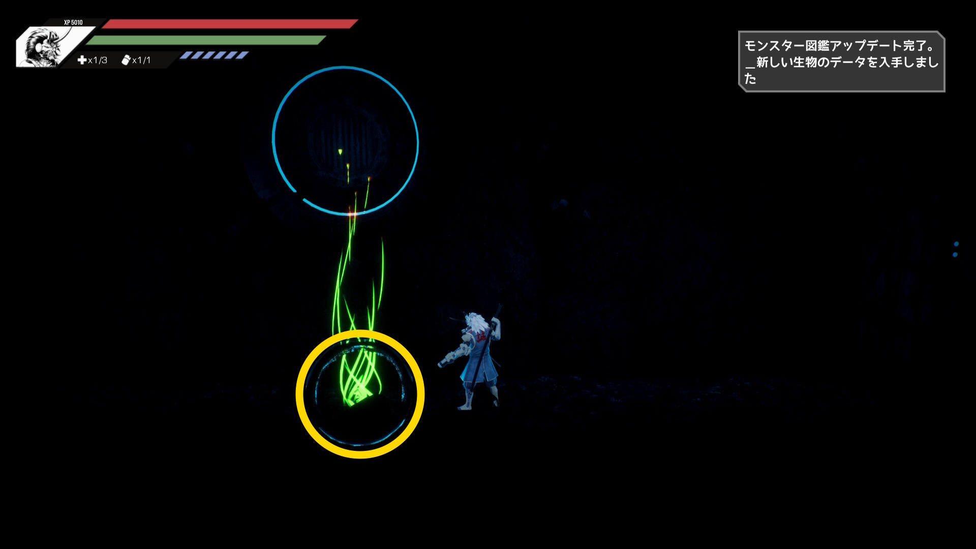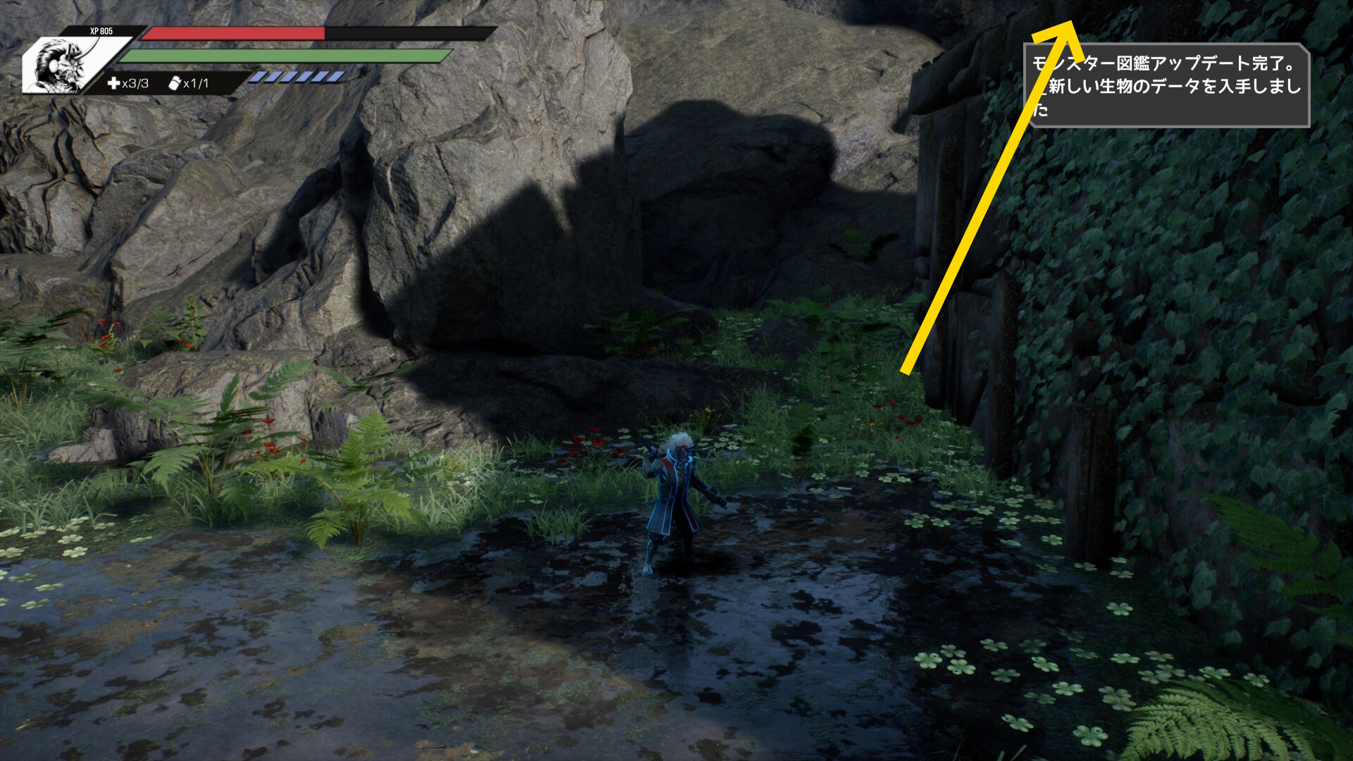 - 右に進み、大木を過ぎたところに 敵のデータ が落ちている ⇒ モンスター図鑑のアップデート( THA3「コダマ」100%)