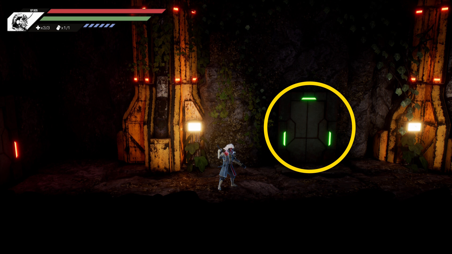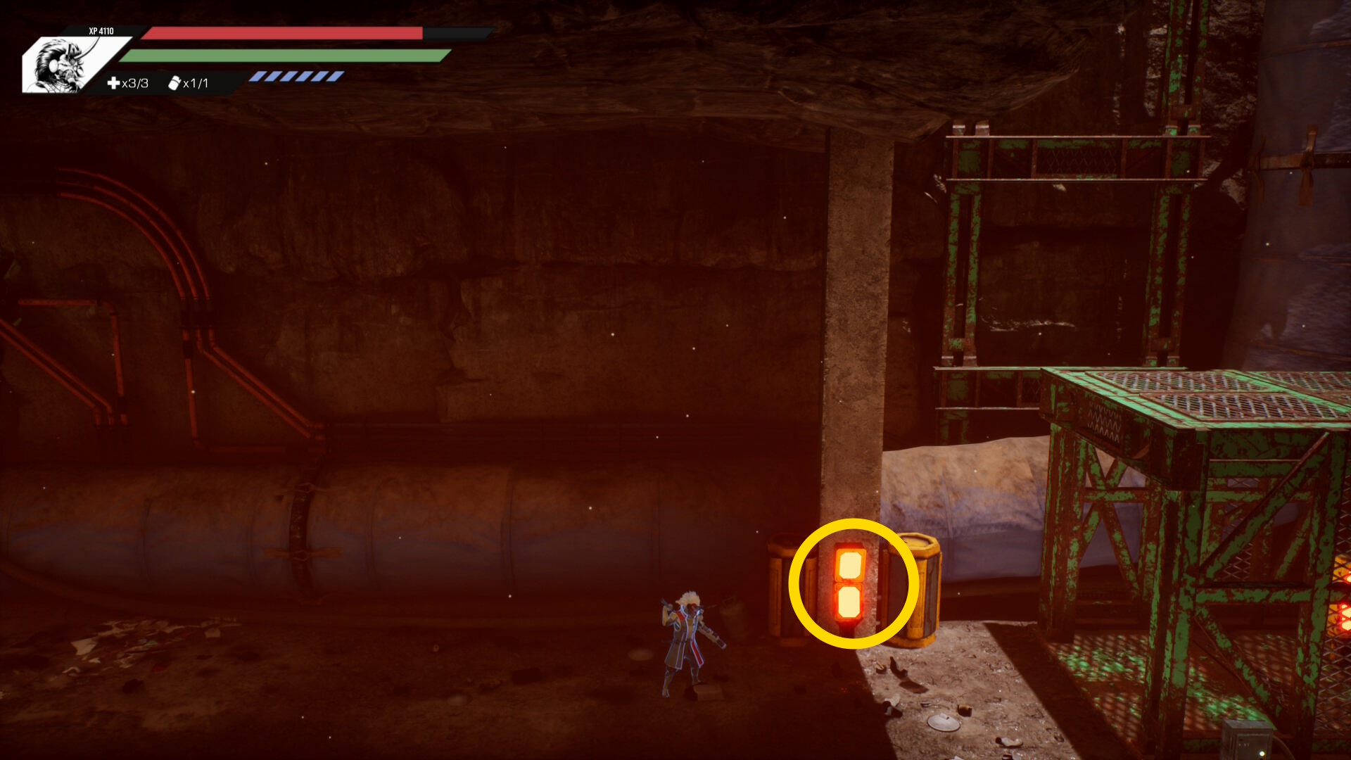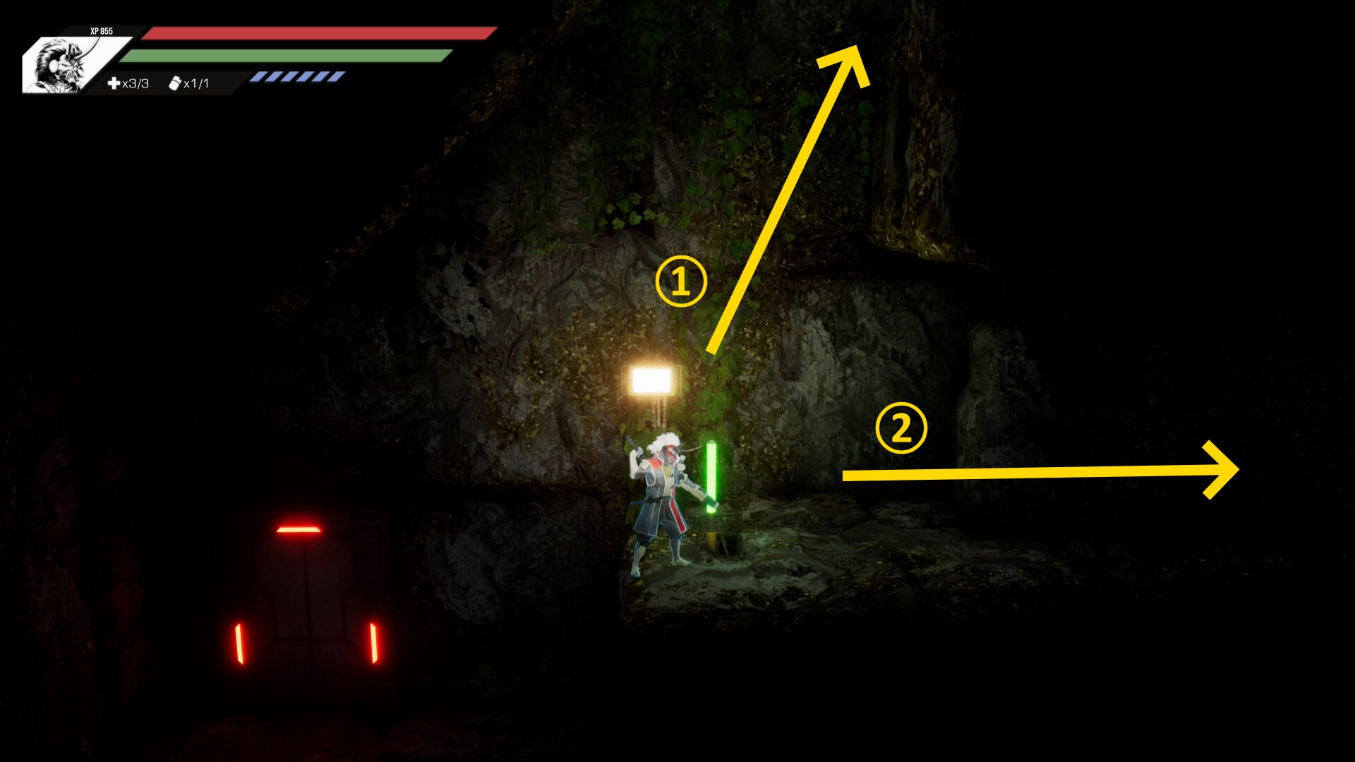 - しばらく右に進むと頭上にスイッチが見えてくる