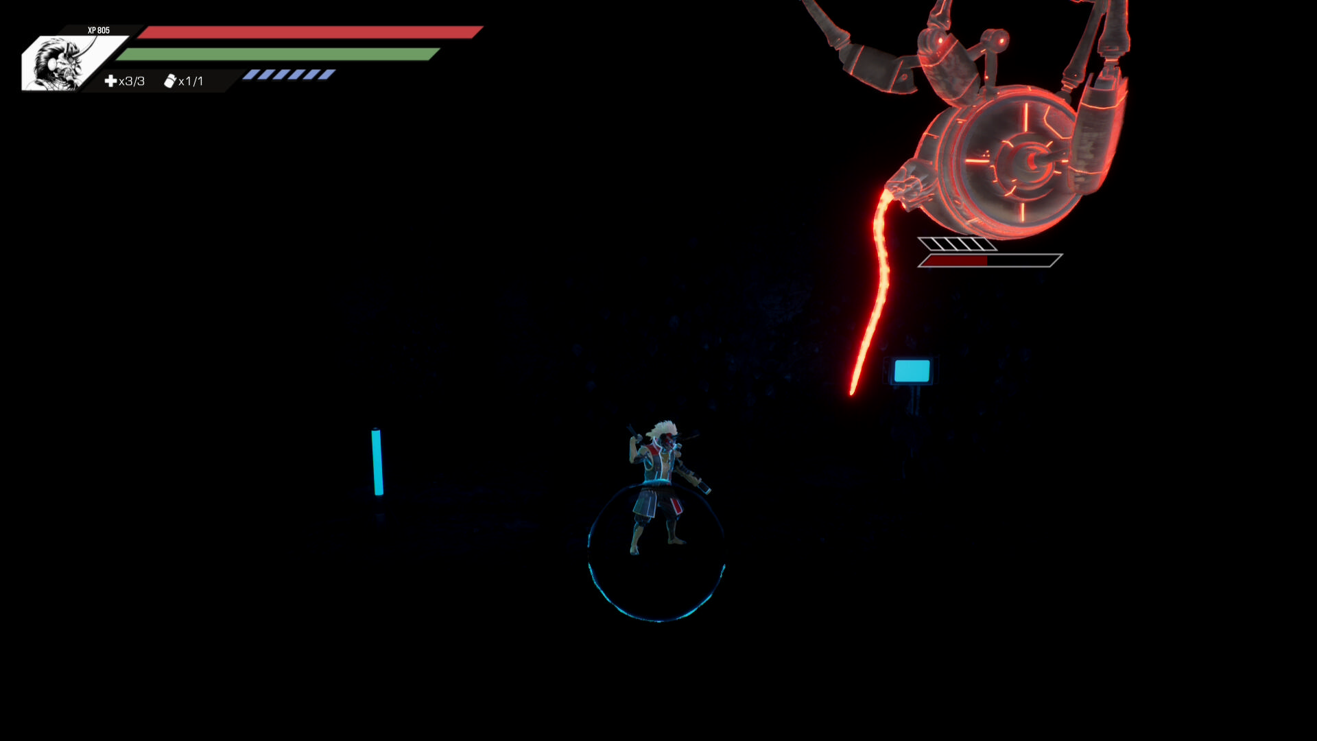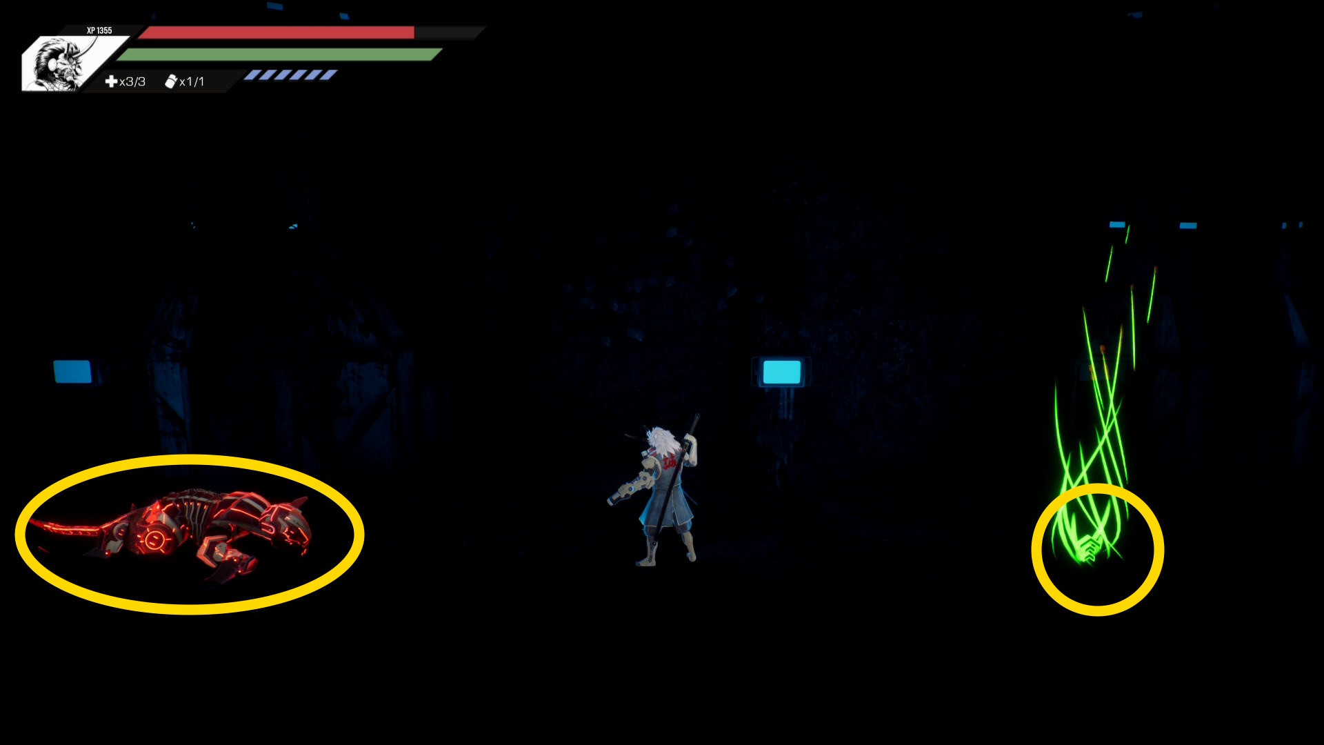 - 3体を倒すと、軽いカミ、重いカミ、WA1 がそれぞれ2体出現(左に出現した重いカミが回復キットをドロップする)