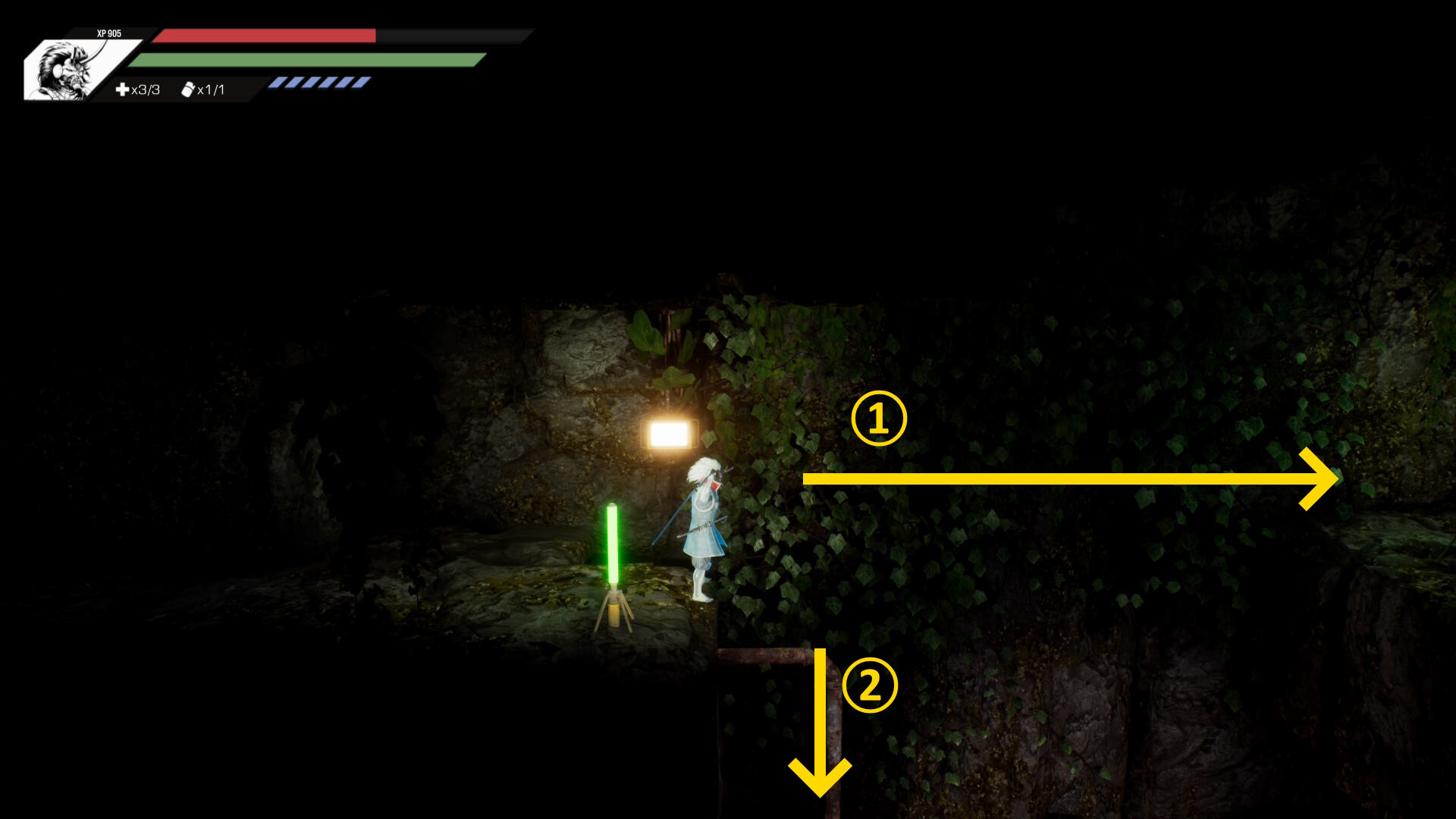 - まずは「上(①)」に進む( XP 稼ぎのため)