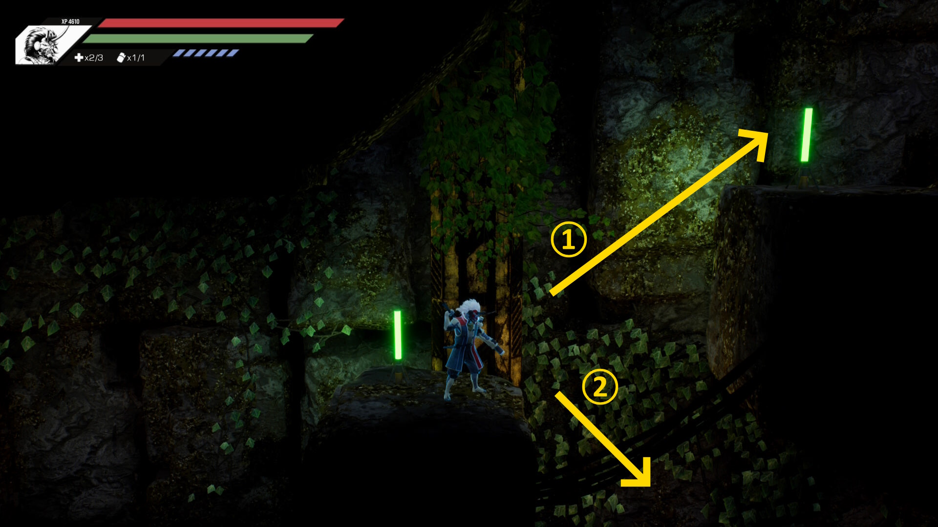 - すぐ「下」と「右」に分岐するので、「右(①)」に進む(ジャンプしてその先に足場へ)
