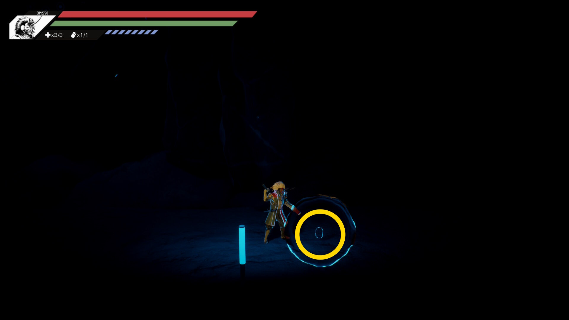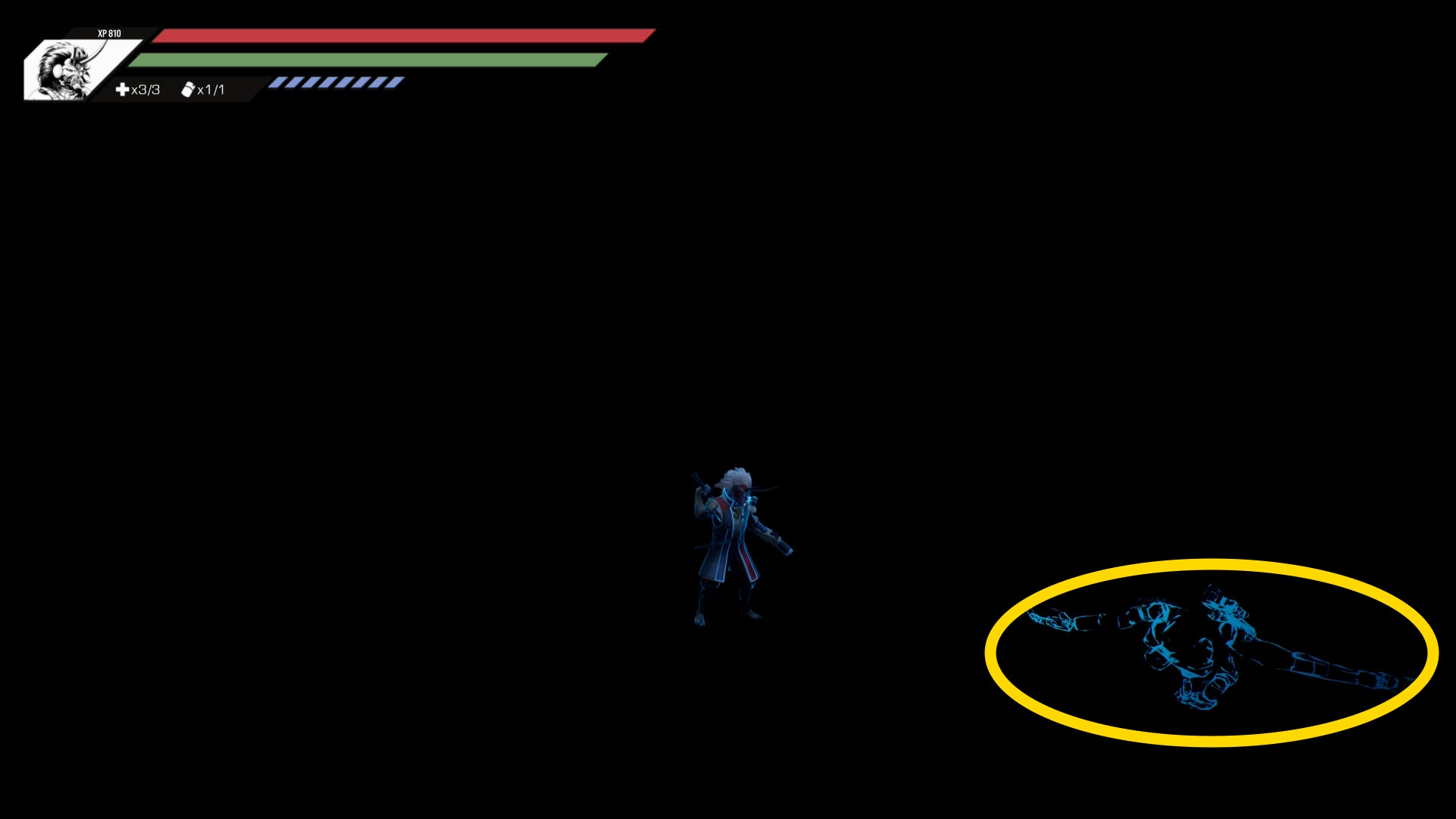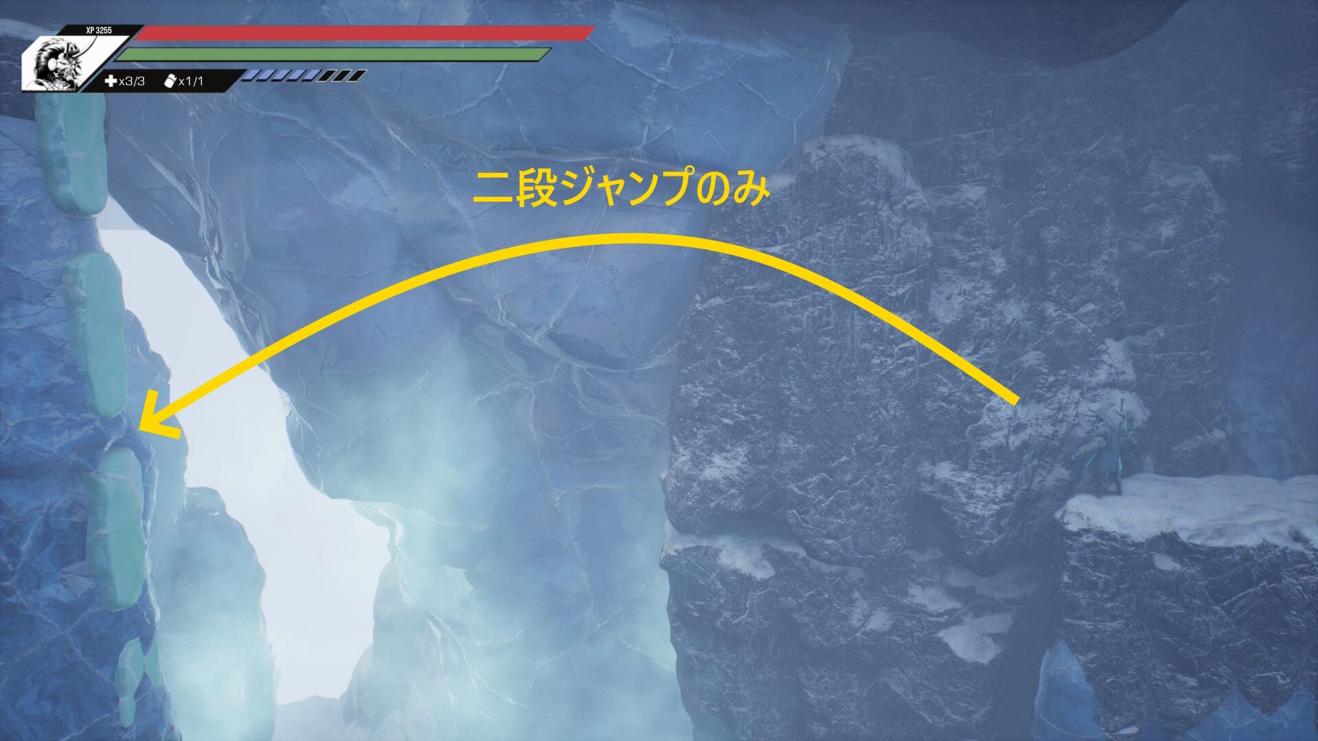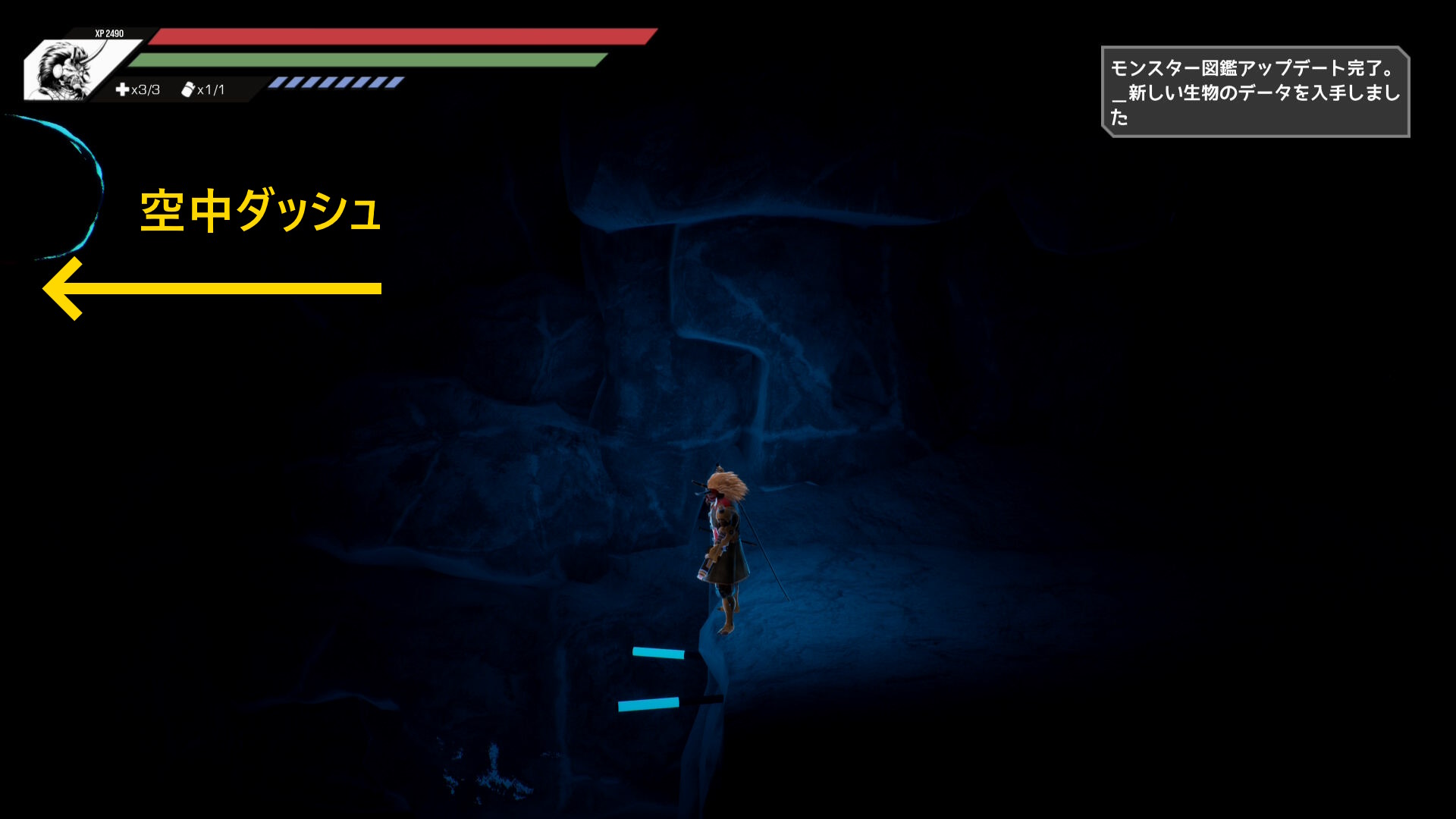 - 3体目を倒したあと、左の壁にグリップポイントがあり、二段ジャンプのみで掴まること。届かなそうだが、二段ジャンプで十分届くので安心して(空中ダッシュを入れると何も出来ずに落下するだけ)