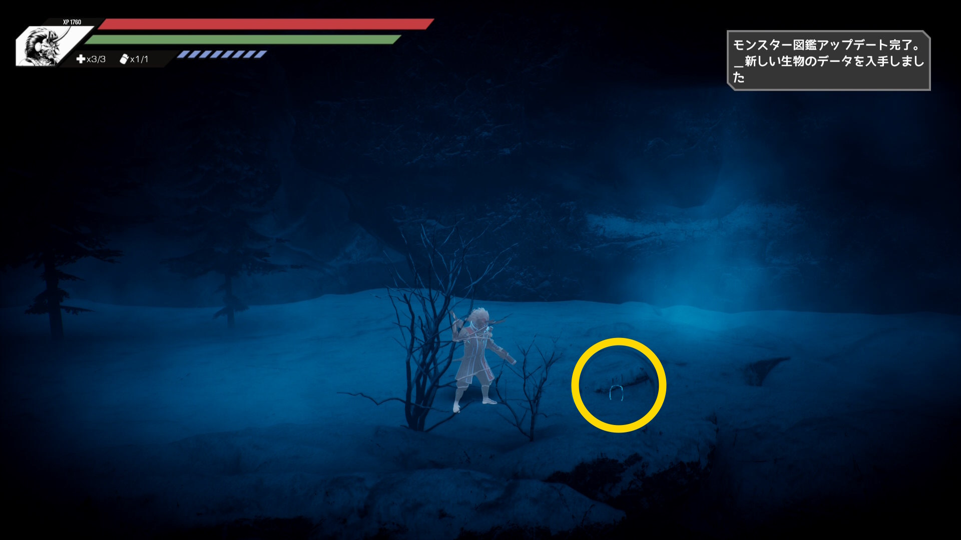 - 開始地点の右側、重いカミの死骸を調べてマップを可視化させる