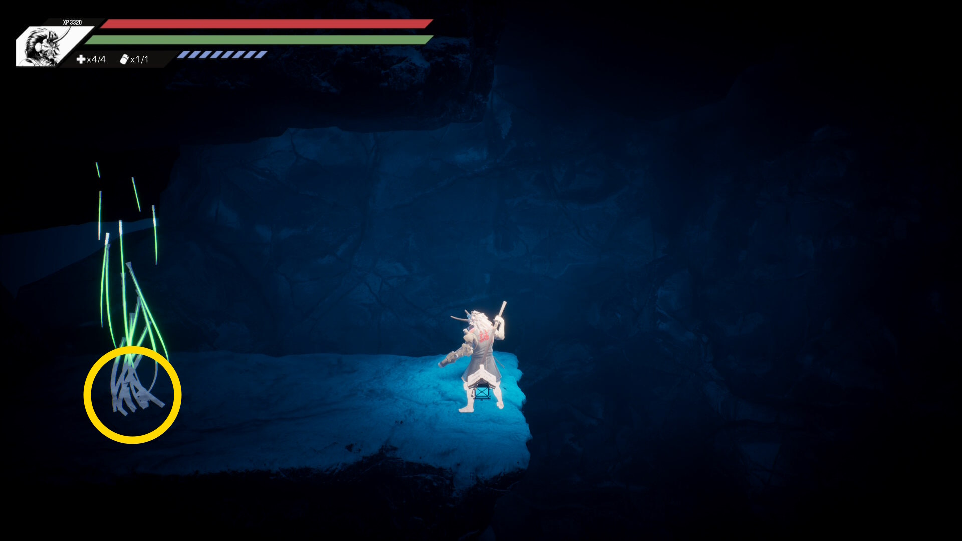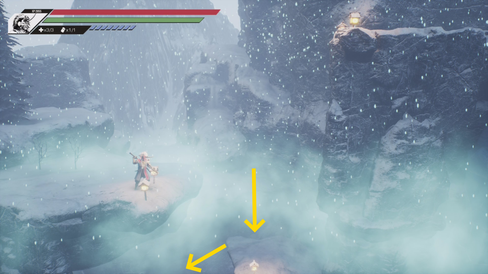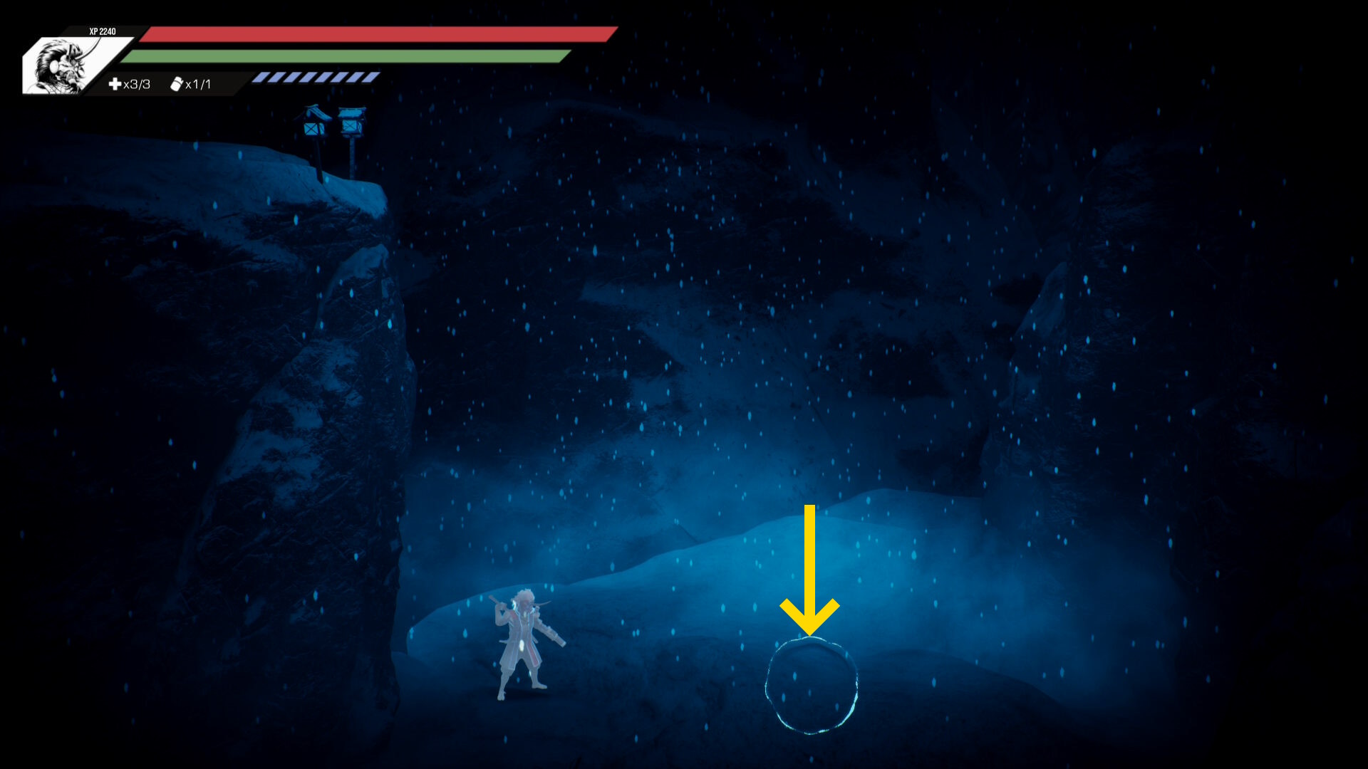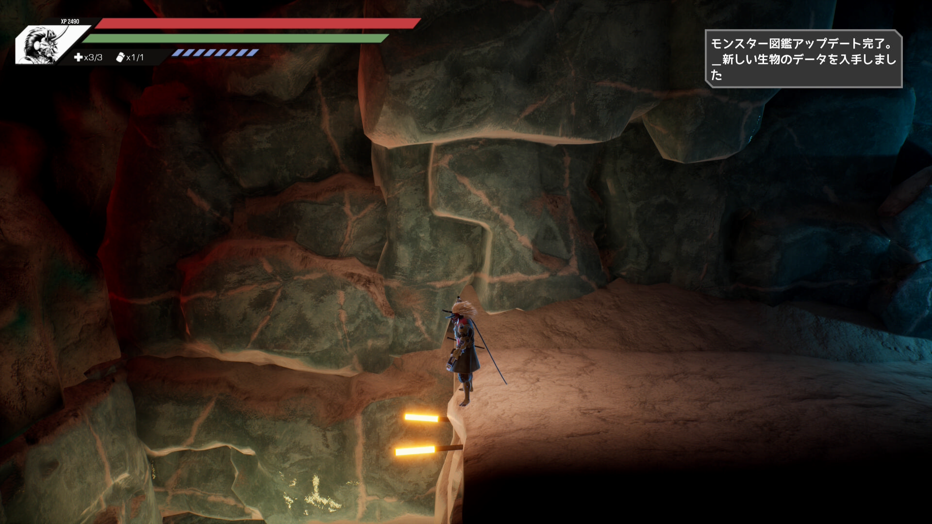 - このエリアにはシラヌイが3体いるが、空中ダッシュで倒してしまうとその後の操作が出来ずに最下層に落ちてしまうので、銃攻撃で倒すことを推奨
