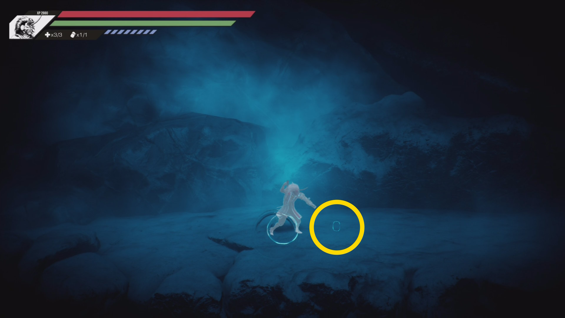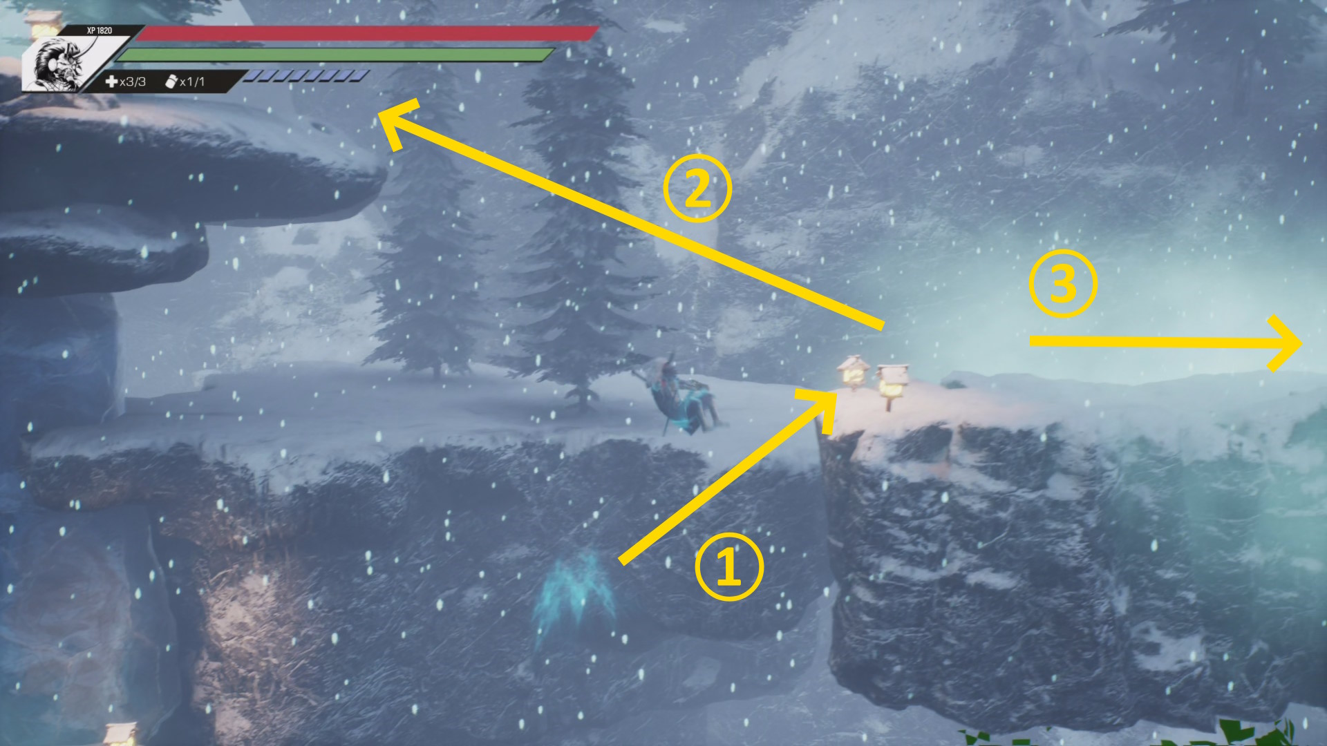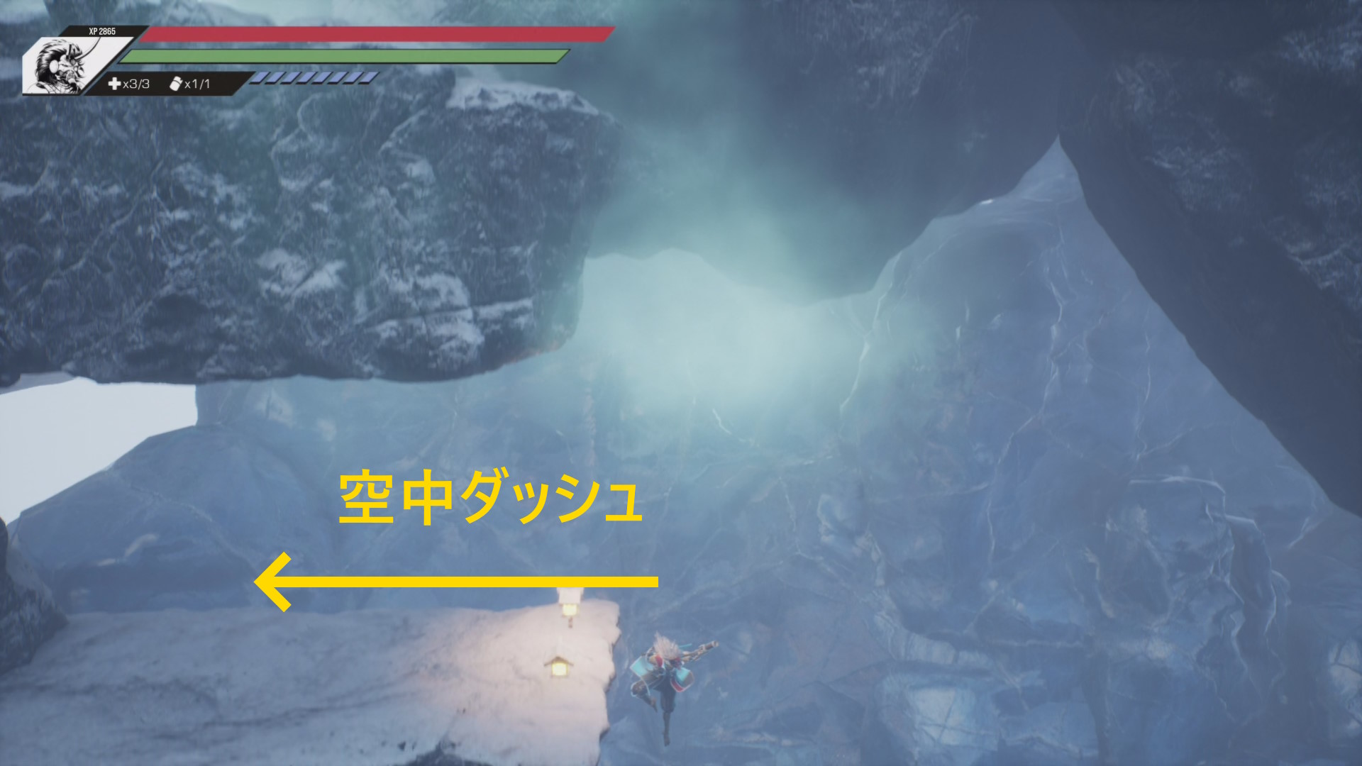 - 1体目のシラヌイを倒して二段ジャンプ + 空中ダッシュで左の足場に移動