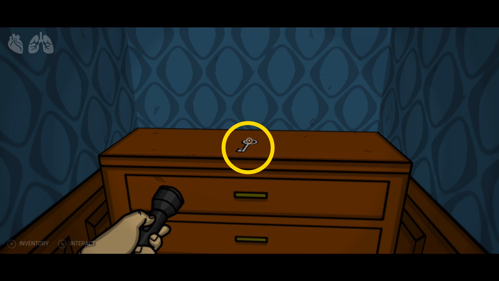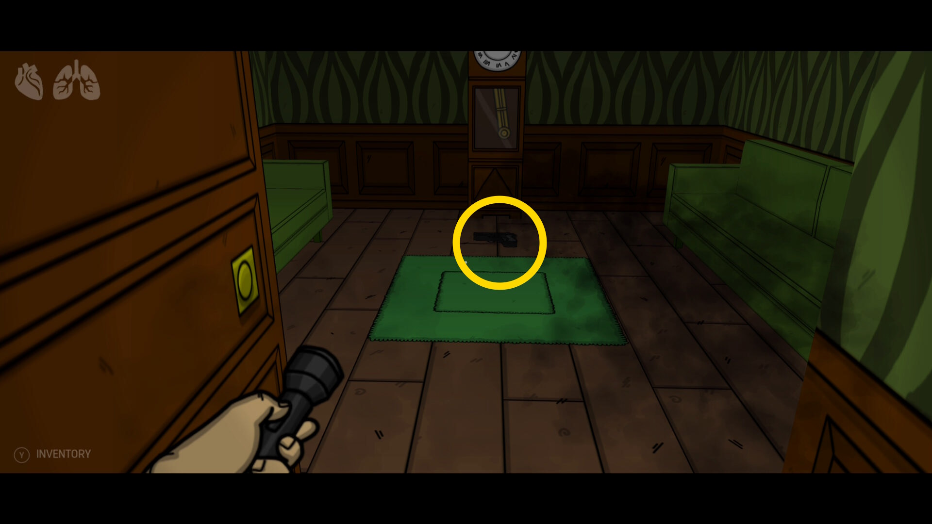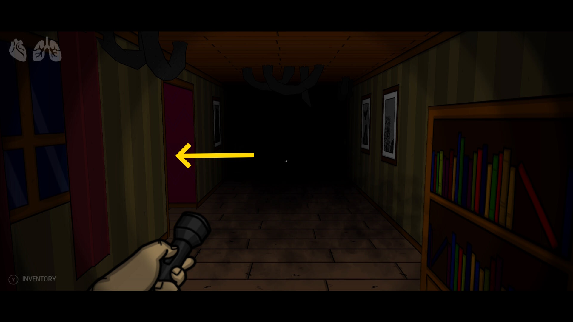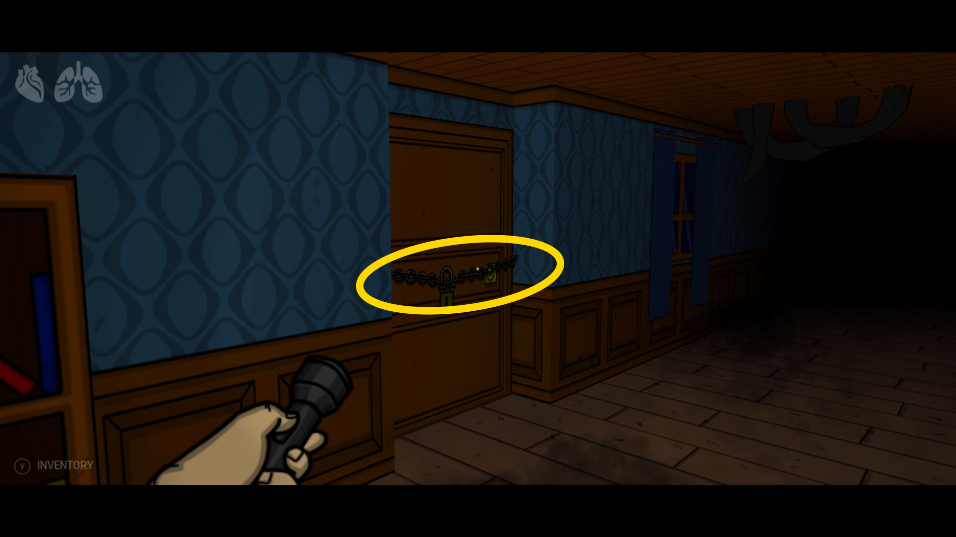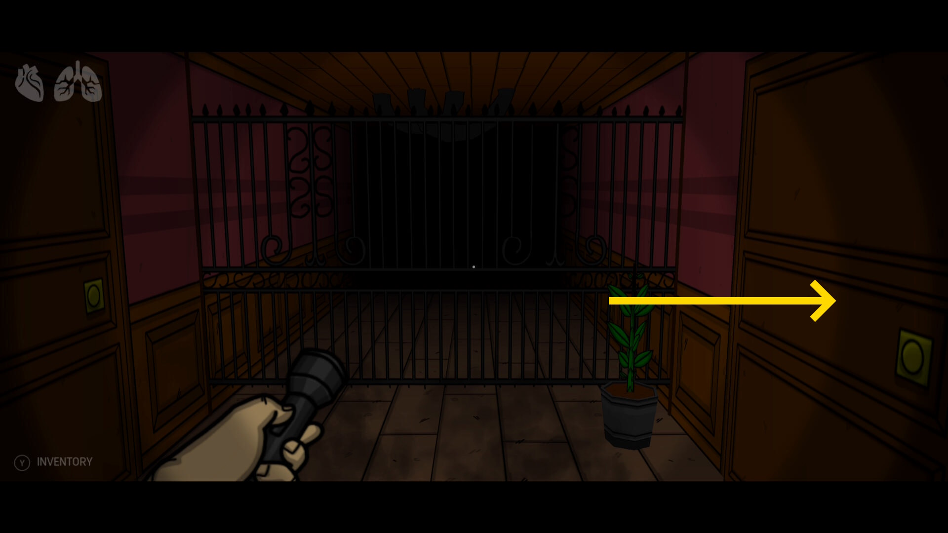 • 突き当りのドアで一度 A を押し、その後 Y を押してインベントリを開いて「古びた鉄製の鍵」を使って解錠(右上の鍵穴に使う必要はない)