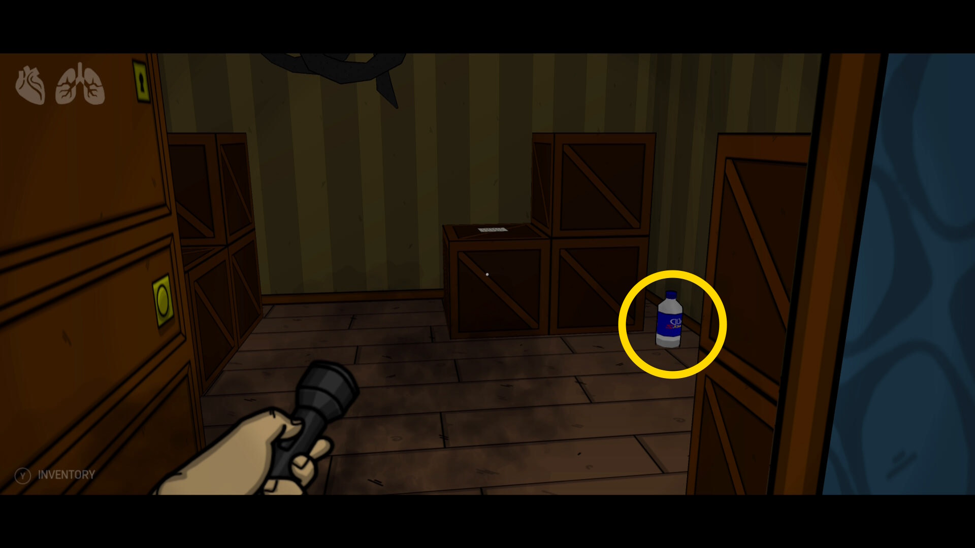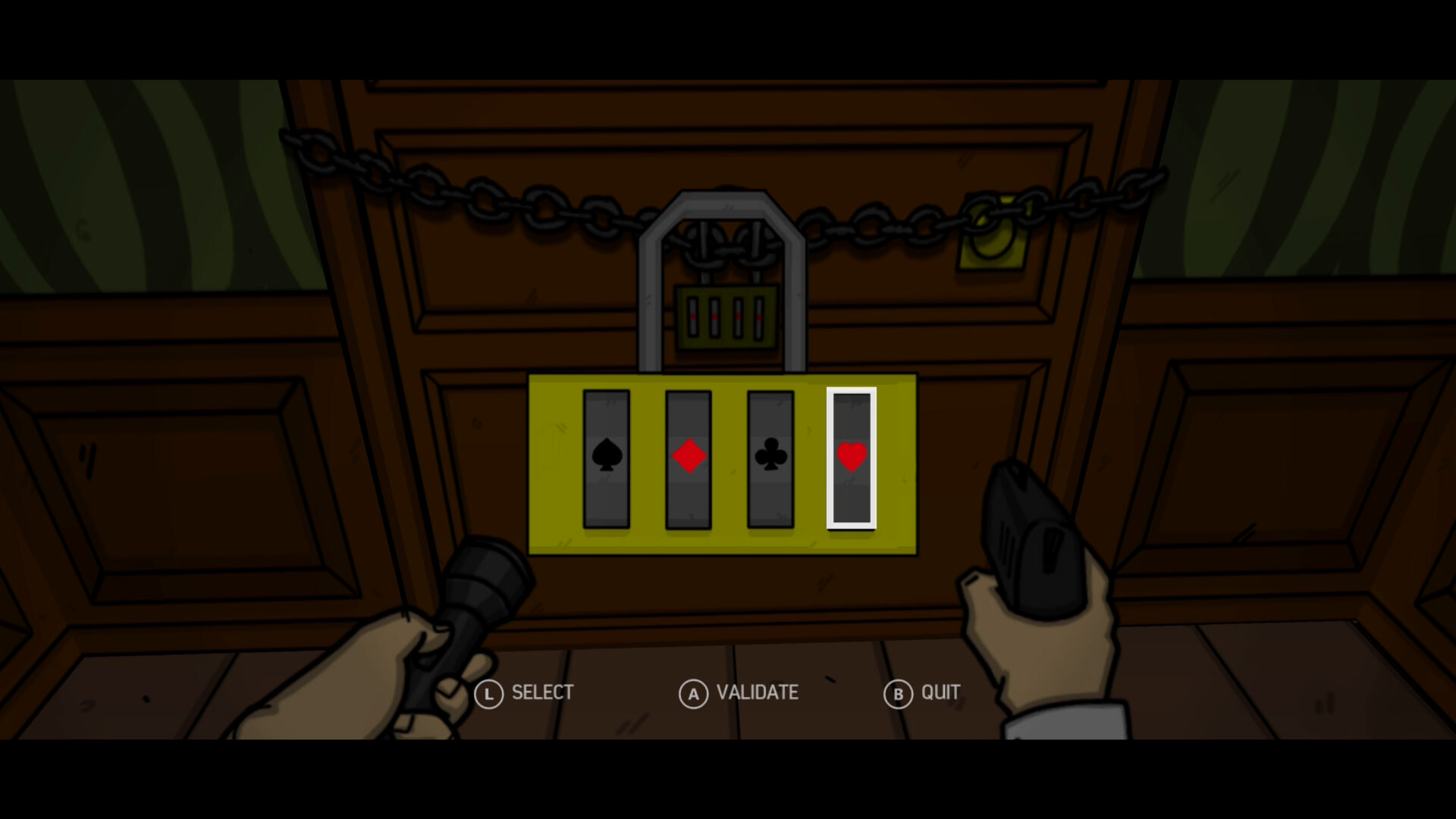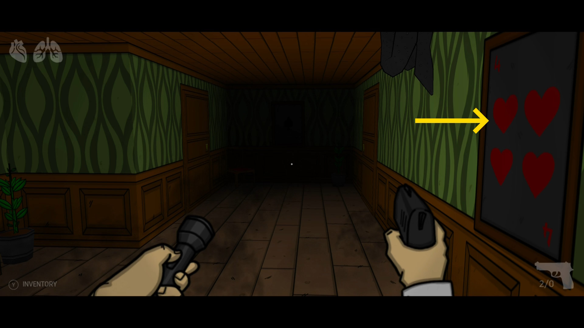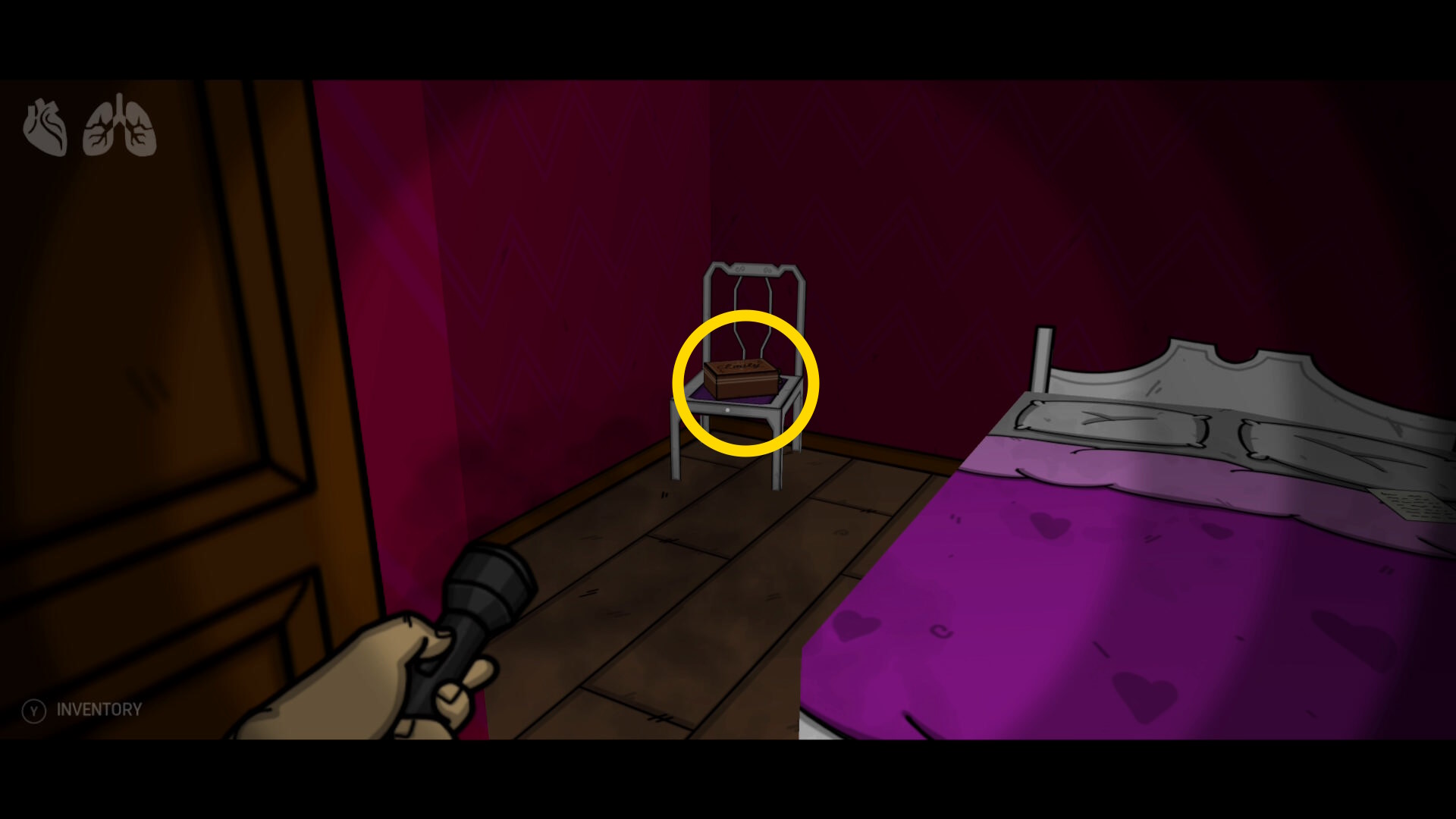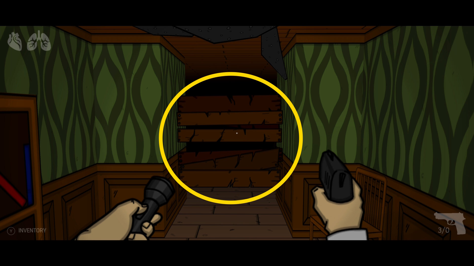 • 突き当りのドアで一度 A を押し、その後 Y を押してインベントリを開いて「古びた鉄製の鍵」を使って解錠(右上の鍵穴に使う必要はない)