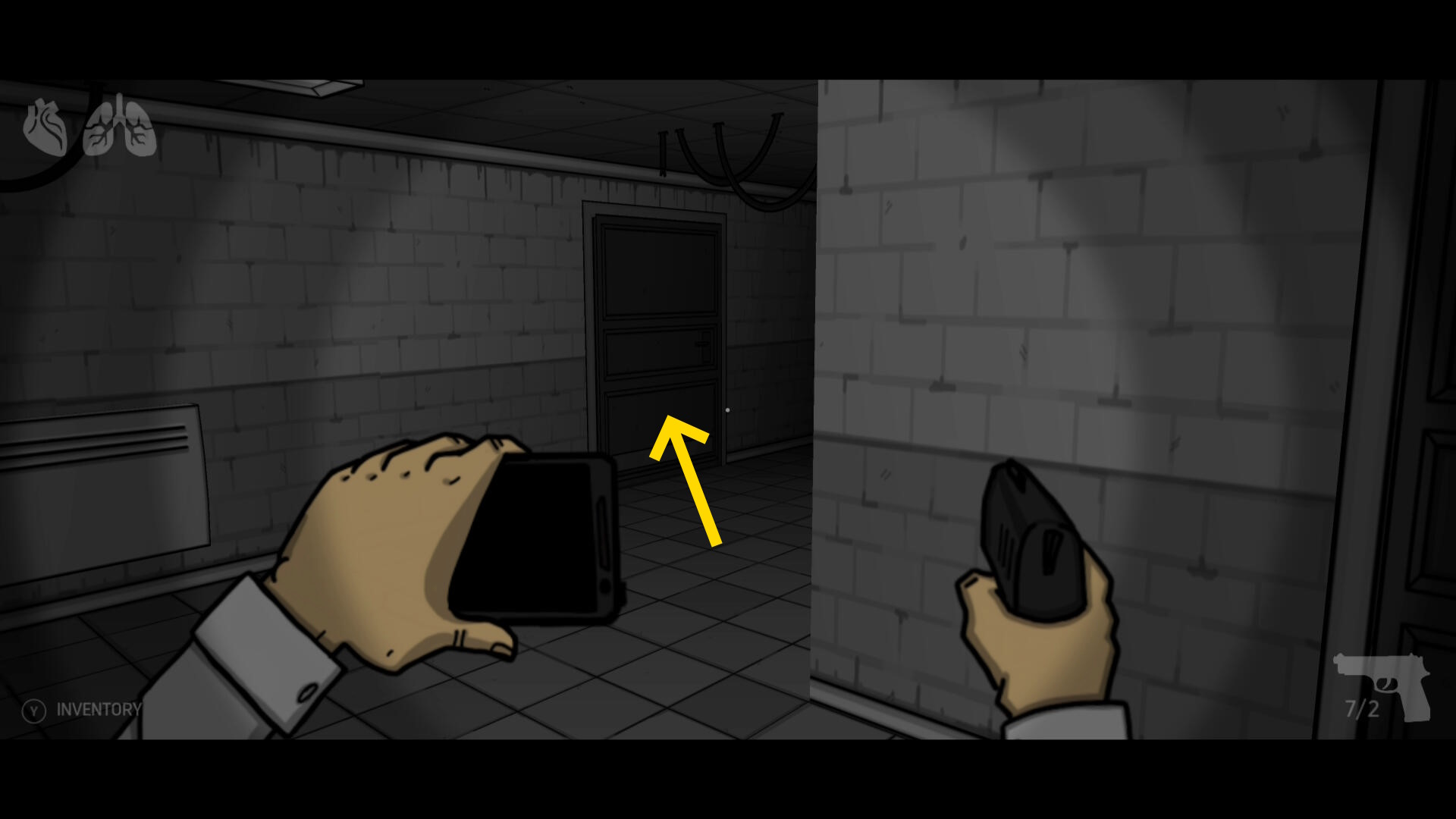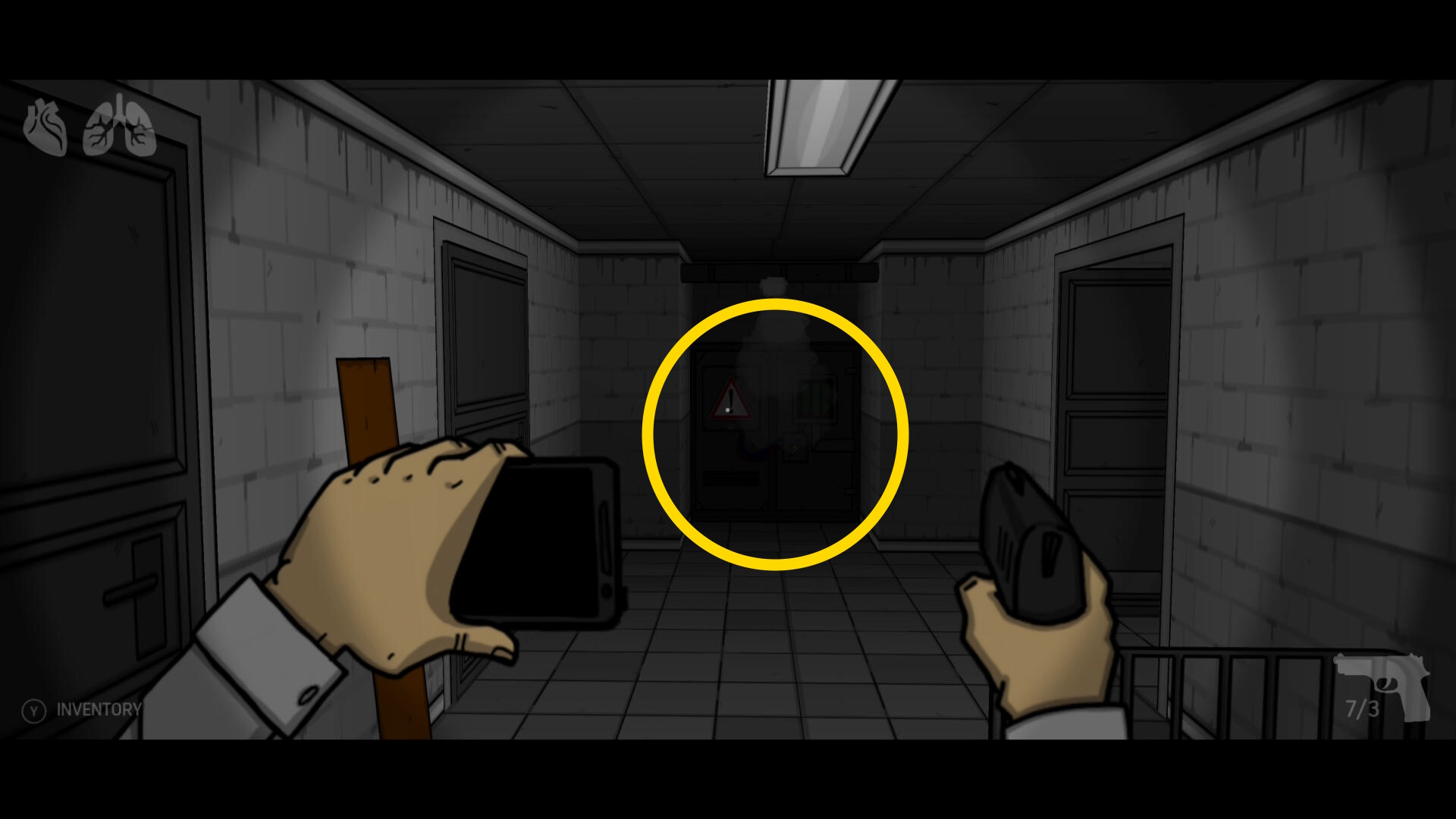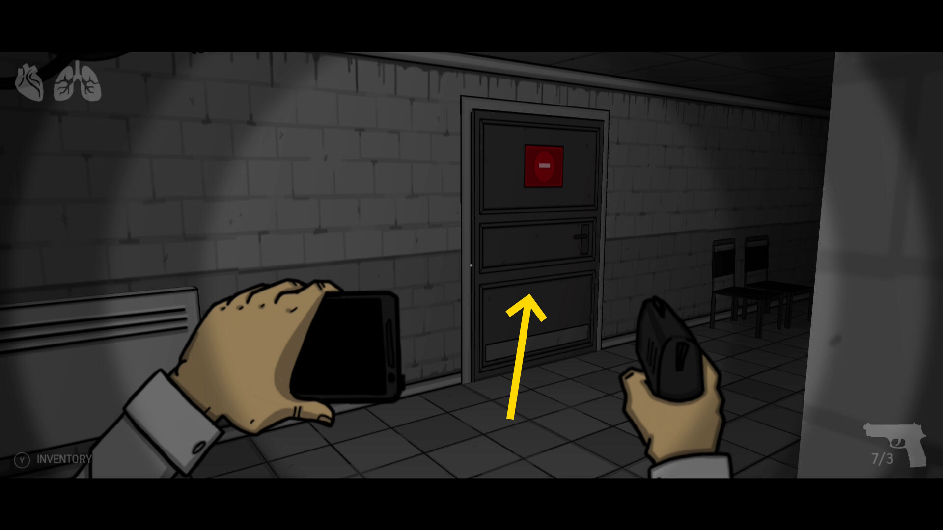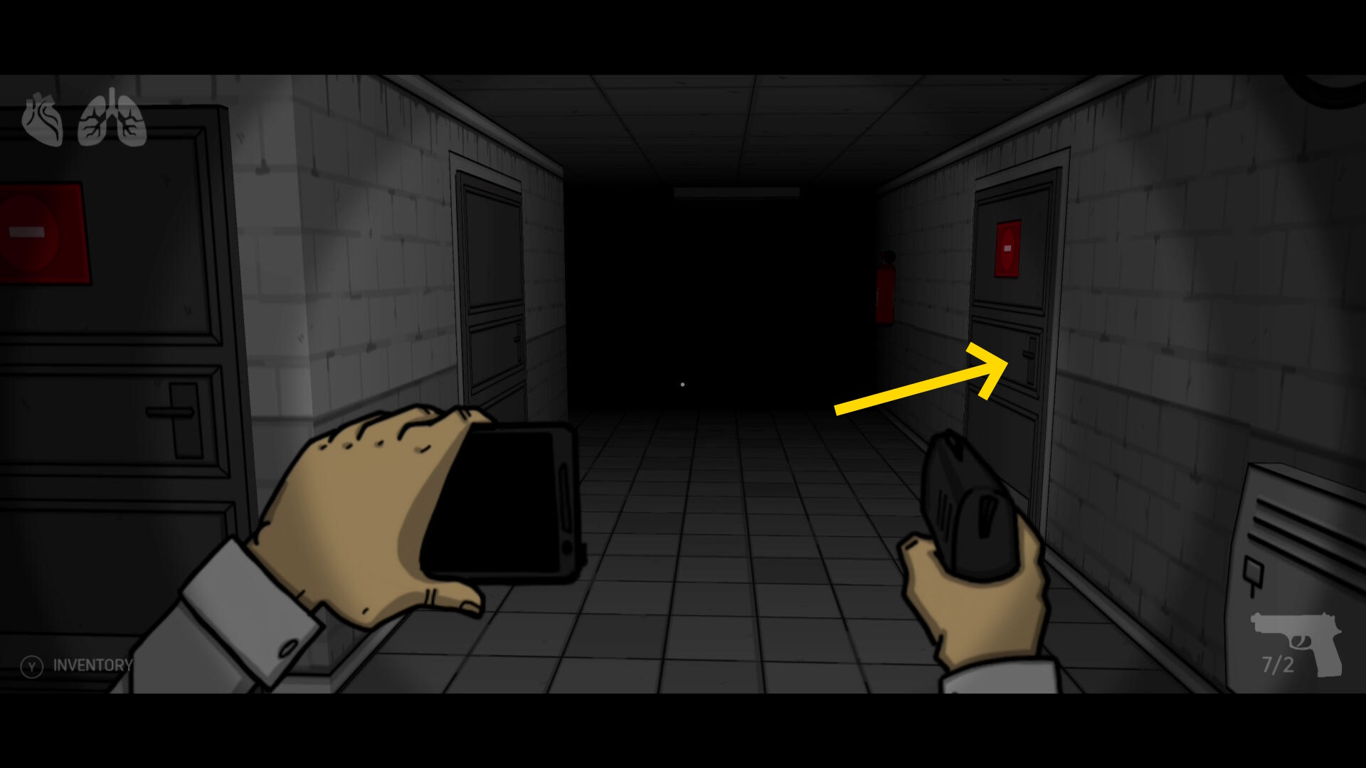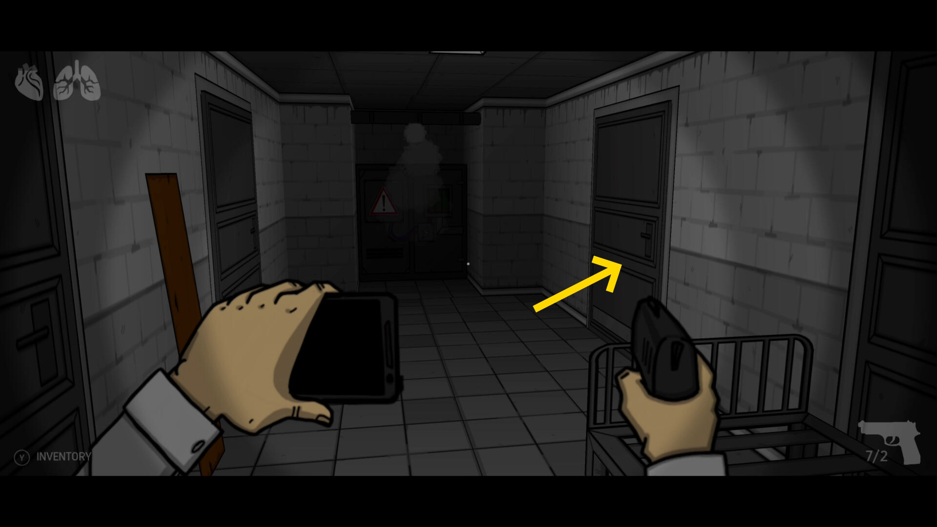 - 進入禁止のマークがあるドアを開けて廊下に出る(下画像の矢印)