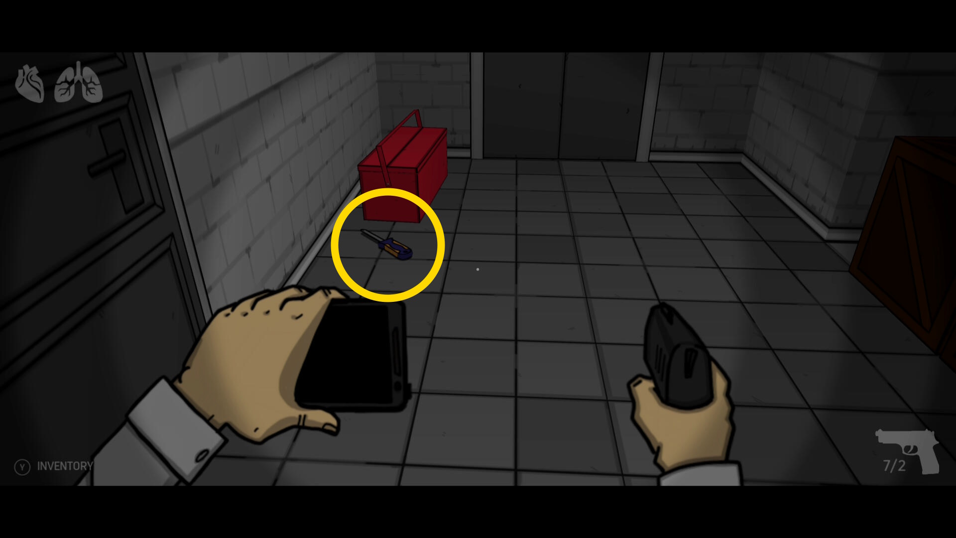 - 部屋を出たら左を向くと床の工具箱の近くに ドライバー があるので回収