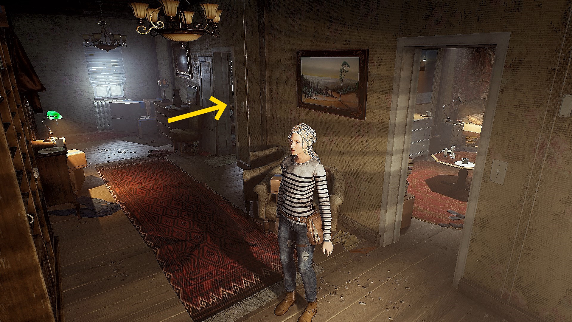 • 部屋を出たら画面手前に進み、左側のドアを開け、階段を下りて1階へ